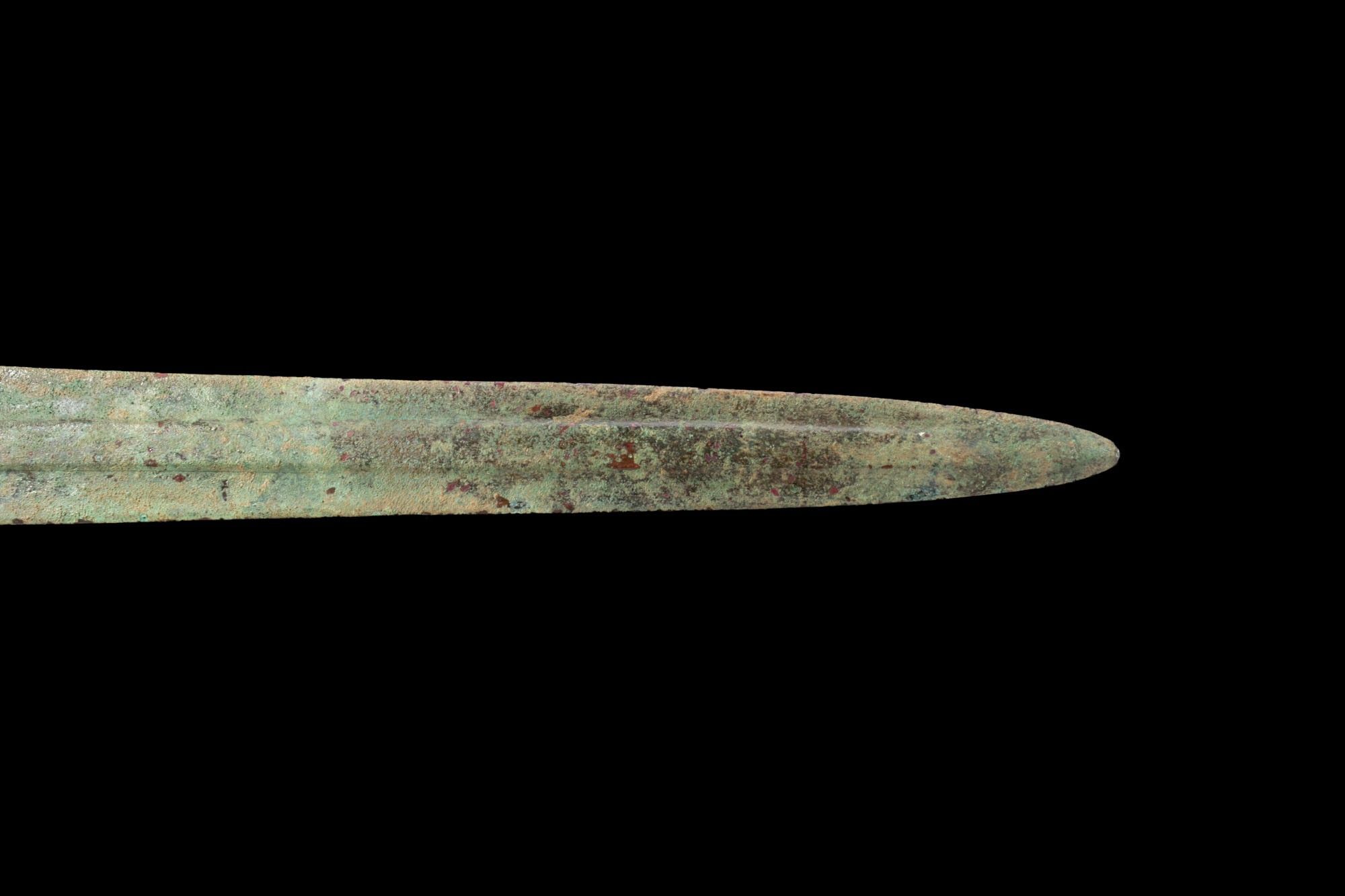 A bronze sword with a crescentic pommel, a ribbed grip, and a long tapering blade with a raised medial rib running to an acute point.