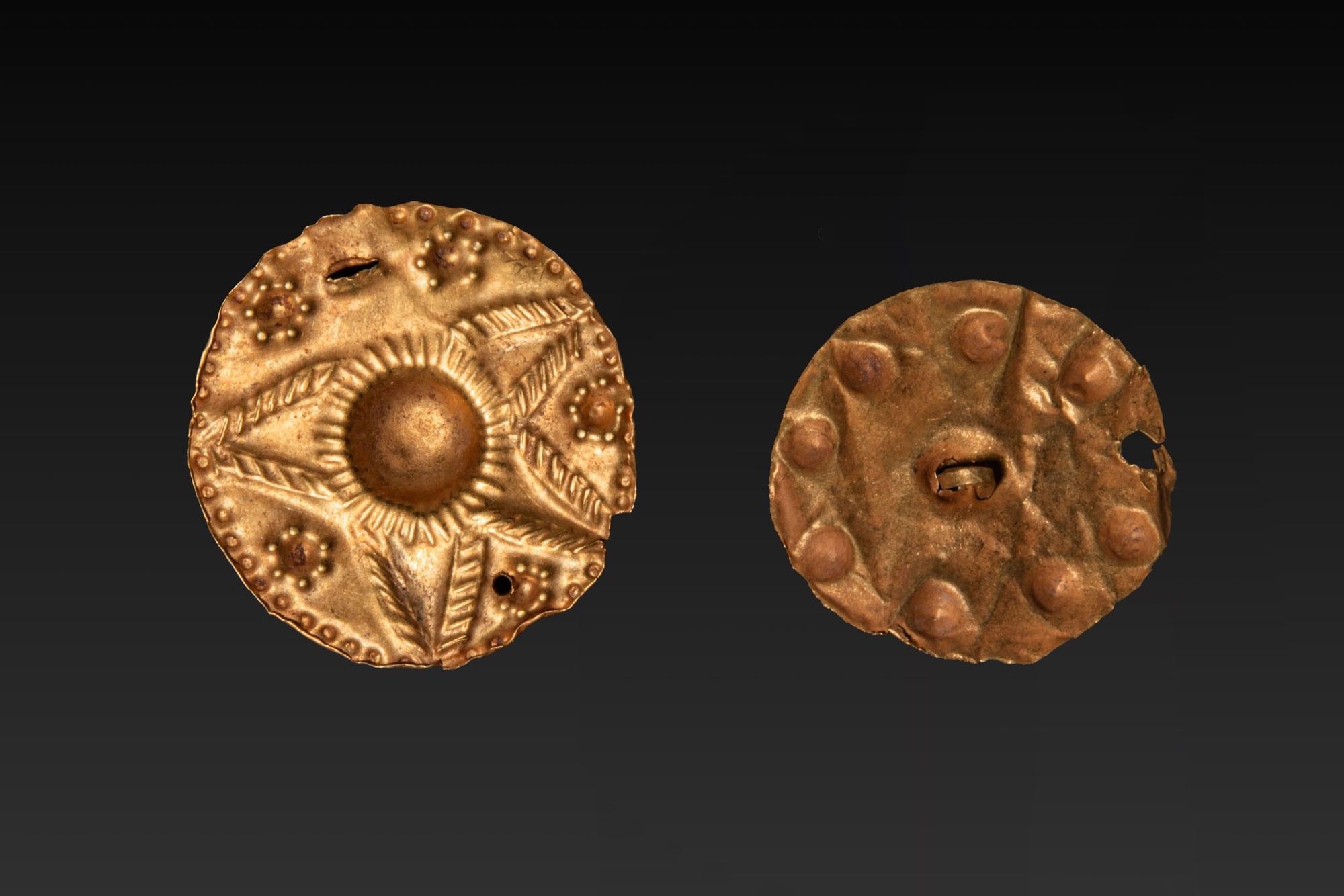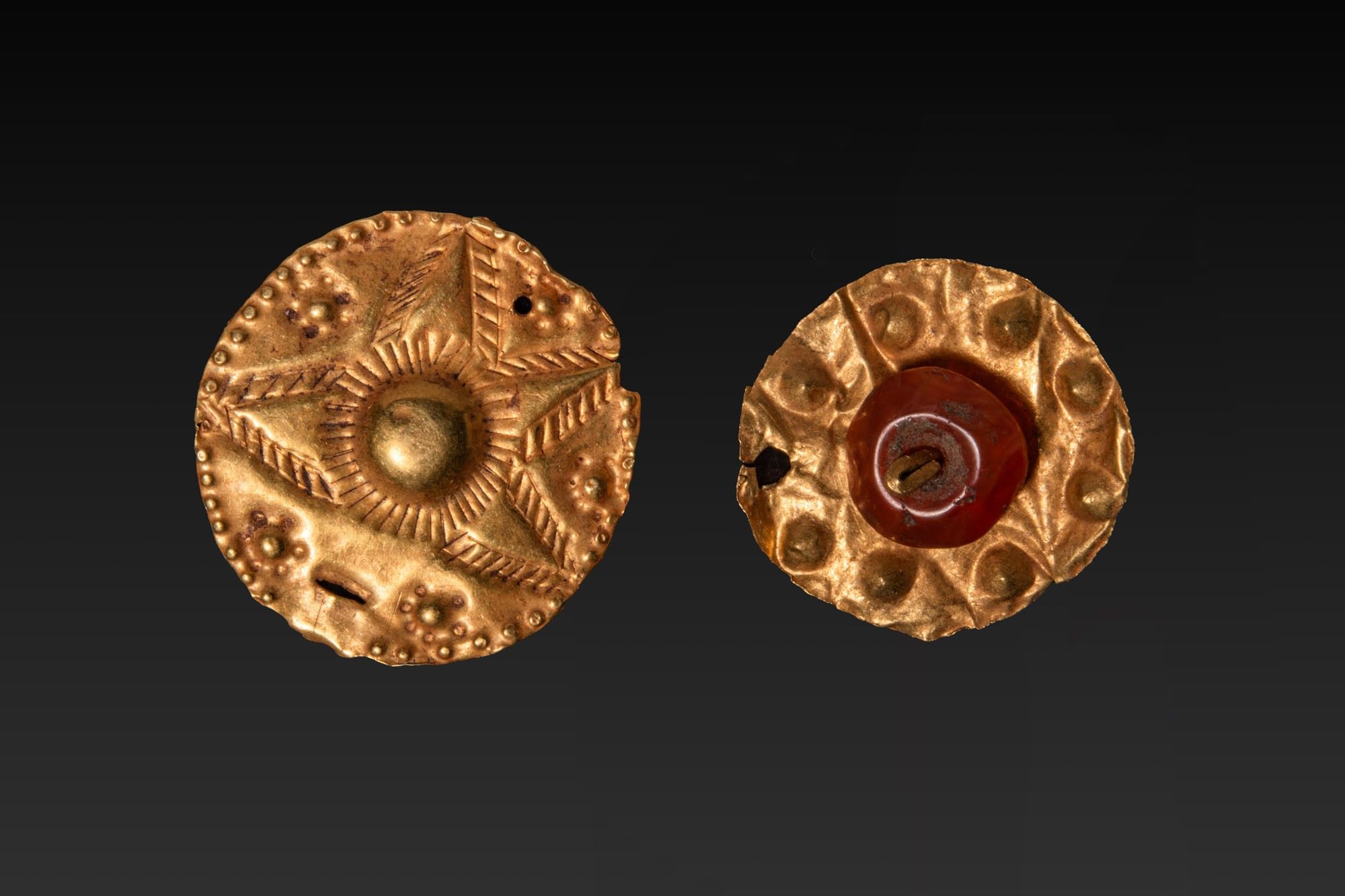 A pair of gold sheet appliqués, including, from left to right: a circular repoussé disc with a central domed boss within a radiating sunburst of five hatched rays, the interstices dotted with punched pellets inside a stippled border; and a disc centred with a carnelian bead framed by a ring of raised bosses, both with small edge perforations for attachment.