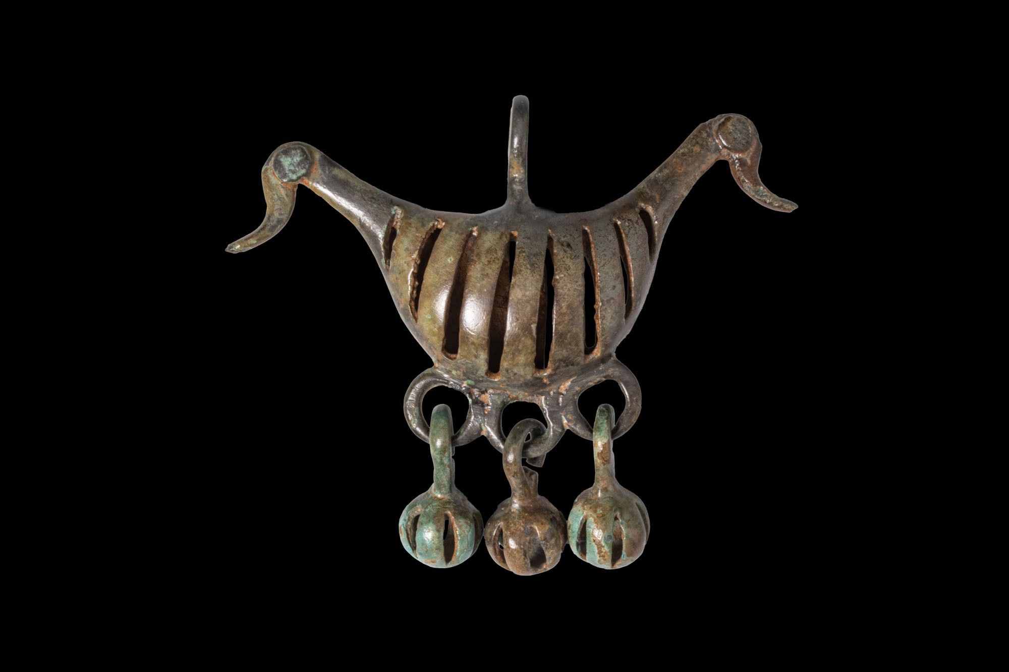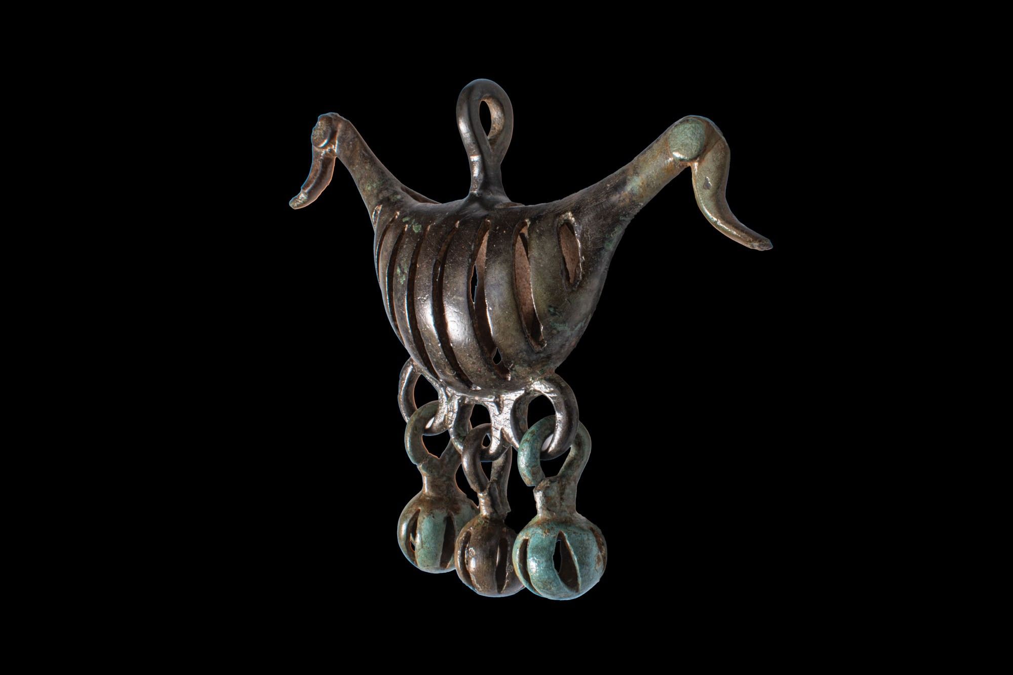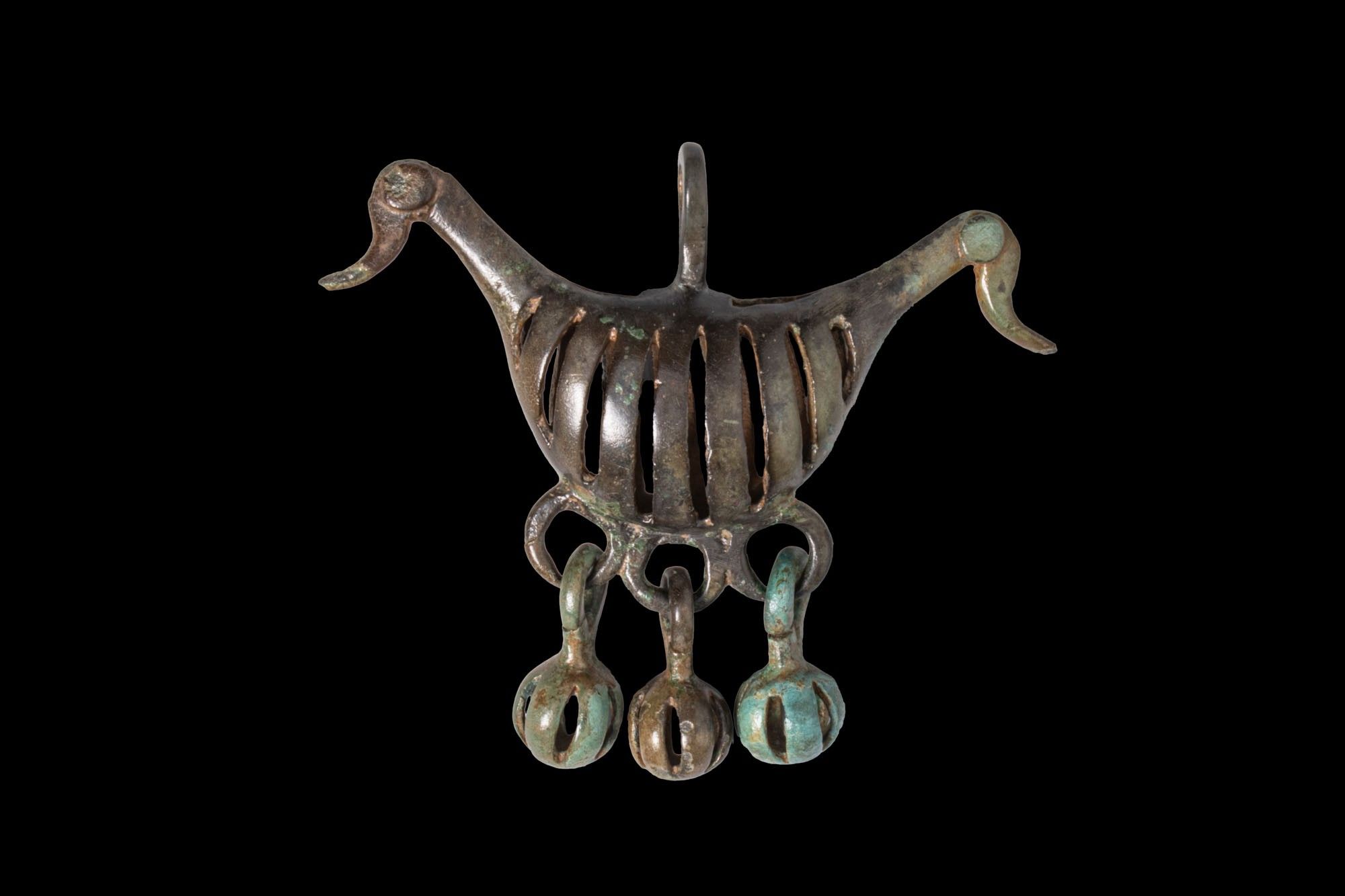 RARE GREEK GEOMETRIC BRONZE PENDANT WITH OPPOSED DUCK HEADS AND SMALL BELLS.