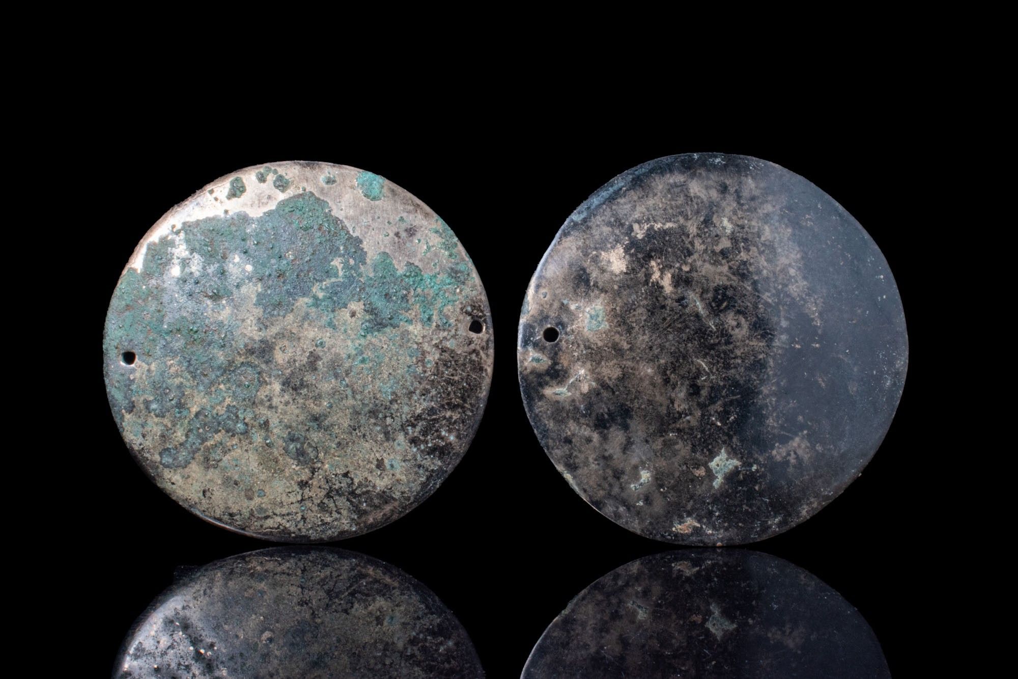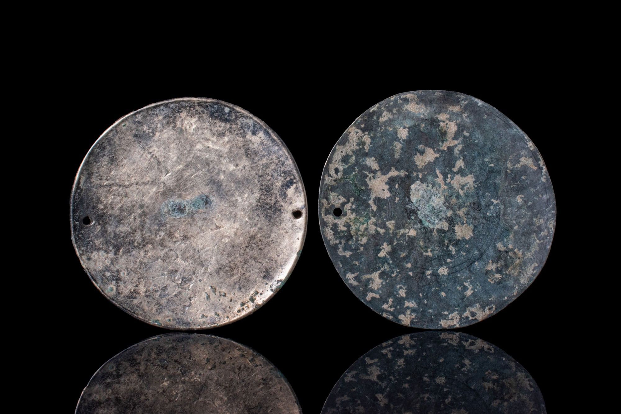 A pair of circular mirrors cast in bronze, each with a flat reflective surface and small perforations near the edge for attachment.