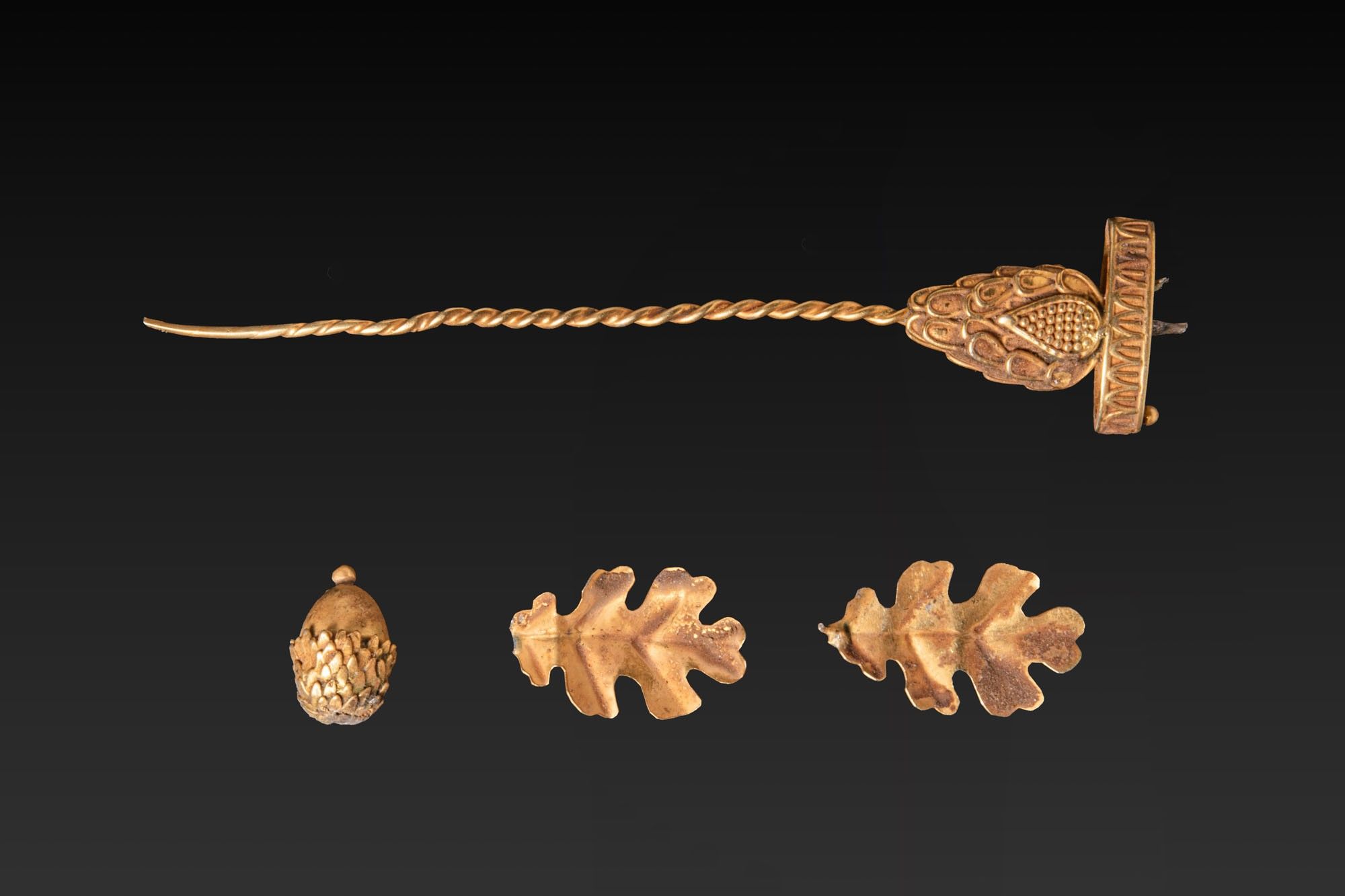 A collection of gold ornaments, including, from top to bottom: a long pin with a twisted shank and a pear-shaped finial with a stippled central panel bordered by oval cells and set before a transverse rectangular bar; a hollow acorn pendant with a ribbed cupule, smooth nut, and a tiny terminal knob, perforated lengthwise; and two thin sheet oak-leaf appliqués with lobed margins and a raised central rib.