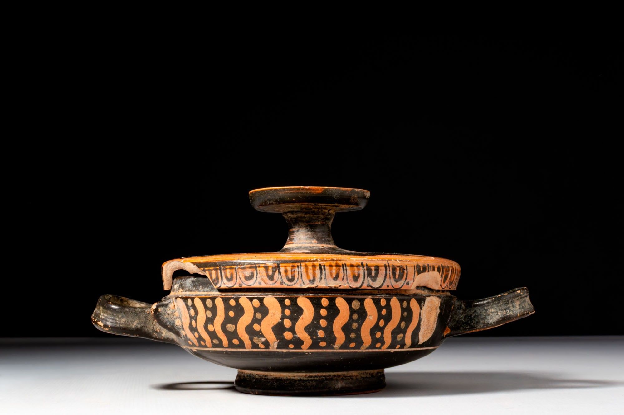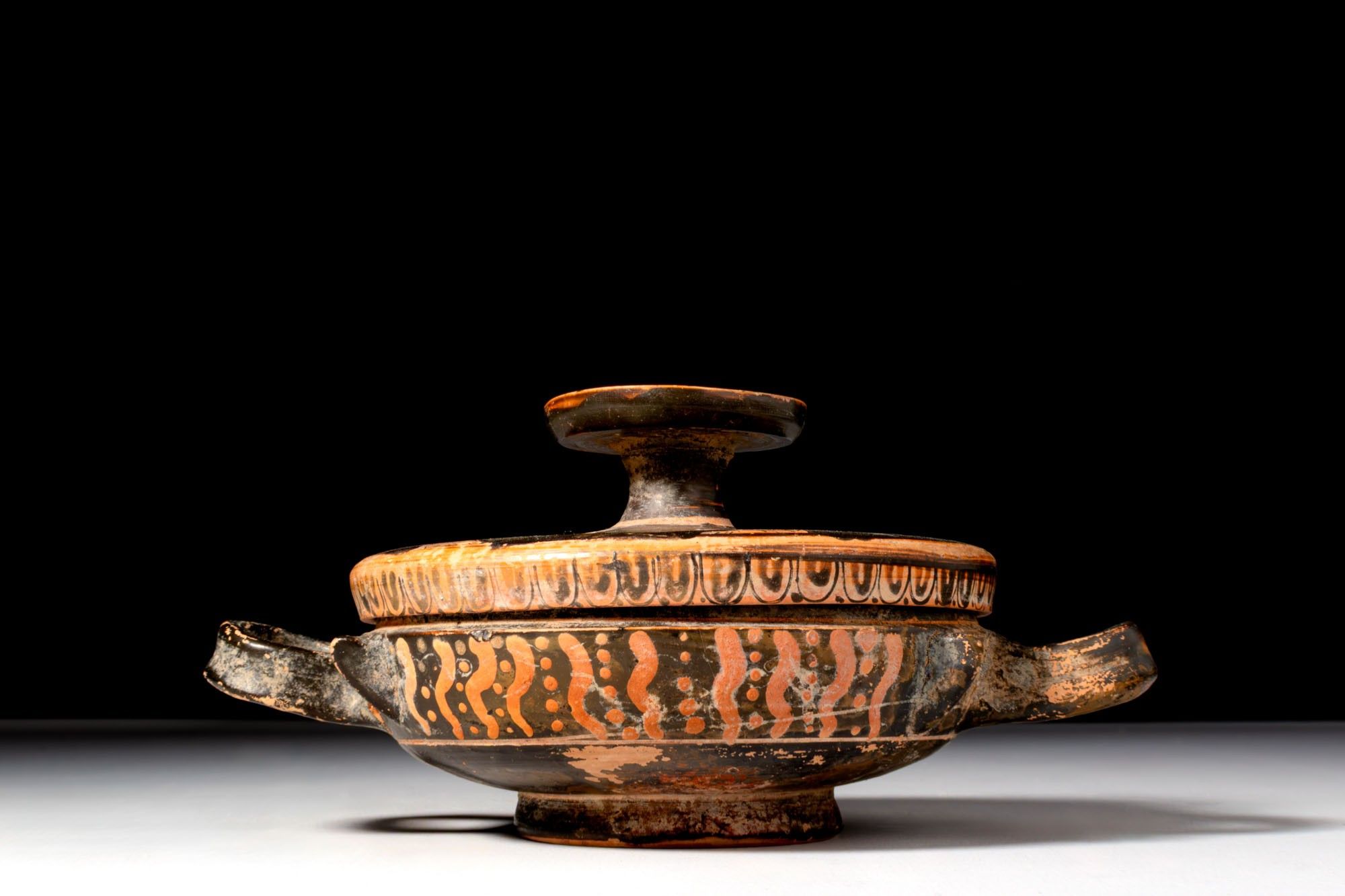 Premium RARE APULIAN LEKANIS WITH OFFERING SCENE. Ca. 350 BC. A red-…