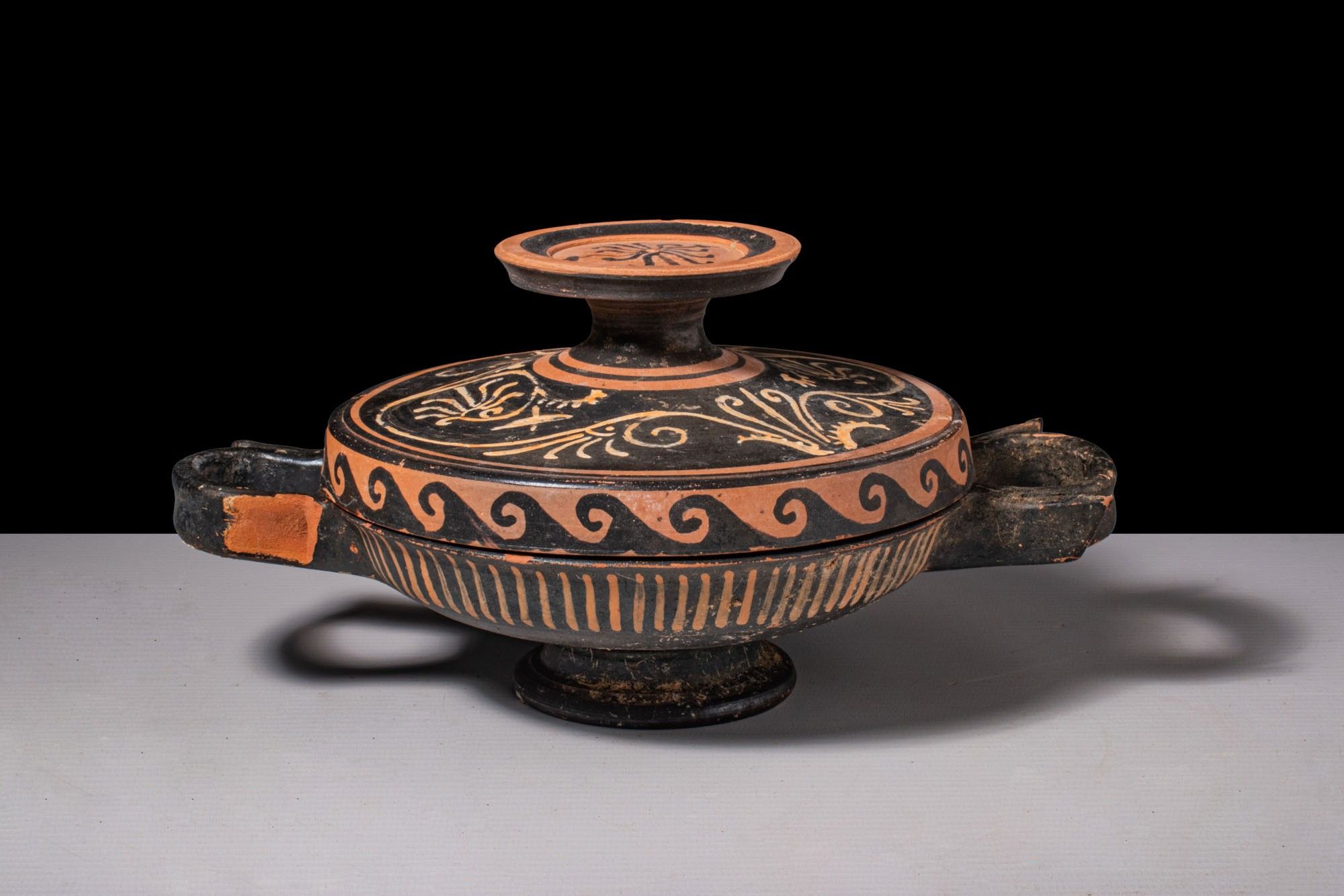 A red-figure lekanis comprising a shallow bowl with opposed horizontal strap handles on a low moulded foot, fitted with a domed lid surmounted by a tall stemmed disc knob. The rim of the lid bears a continuous wave pattern, the upper field decorated with scrolling tendrils around a central palmette on the upper face of the disc-knob finial. The rim of the bowl is encircled by a zone of vertical strokes.