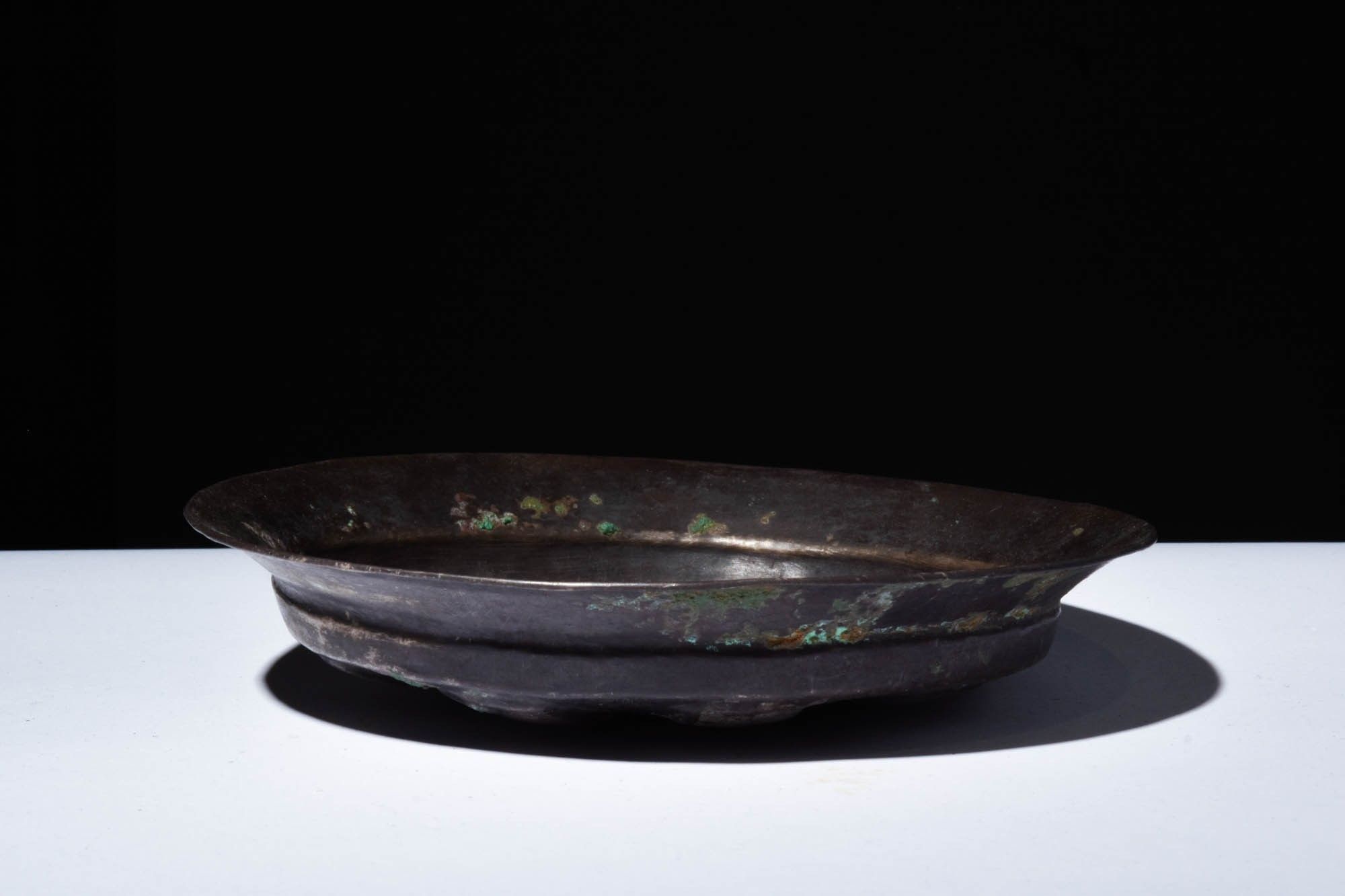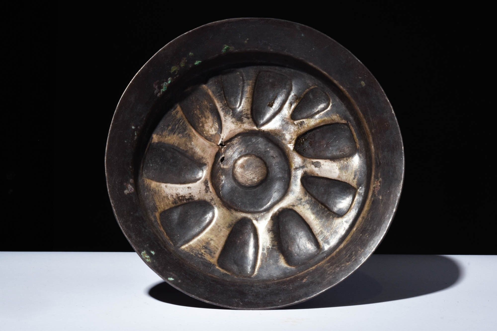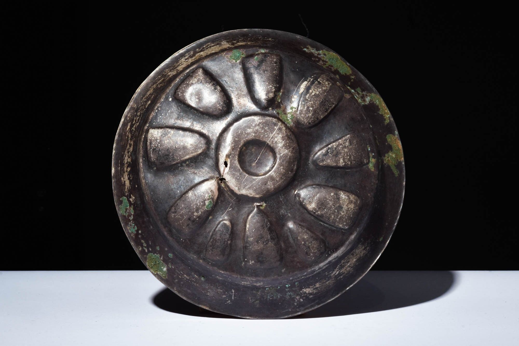 Ca. 500 BC. An elegantly shaped silver phiale. It has a concave central boss surrounded by ten concave almond-like shapes, possibly intended to represent a flower or the sun. Size: L:30mm / W:150mm ; 80g Size: L:30mm / W:150mm ; 80g Provenance: Property of a West London gentleman; previously in a collection formed on the UK/International art market in the 1990s. This item has been checked against the Art Loss Register database..