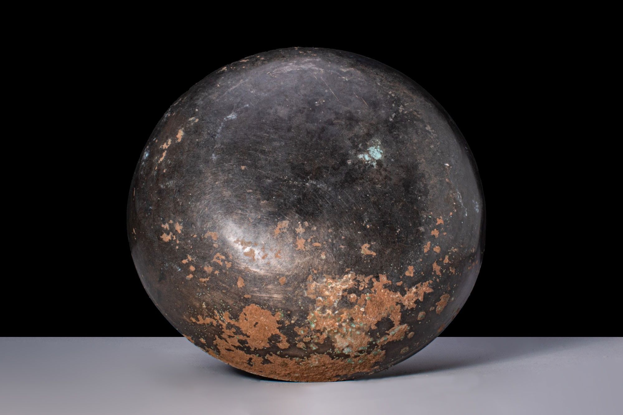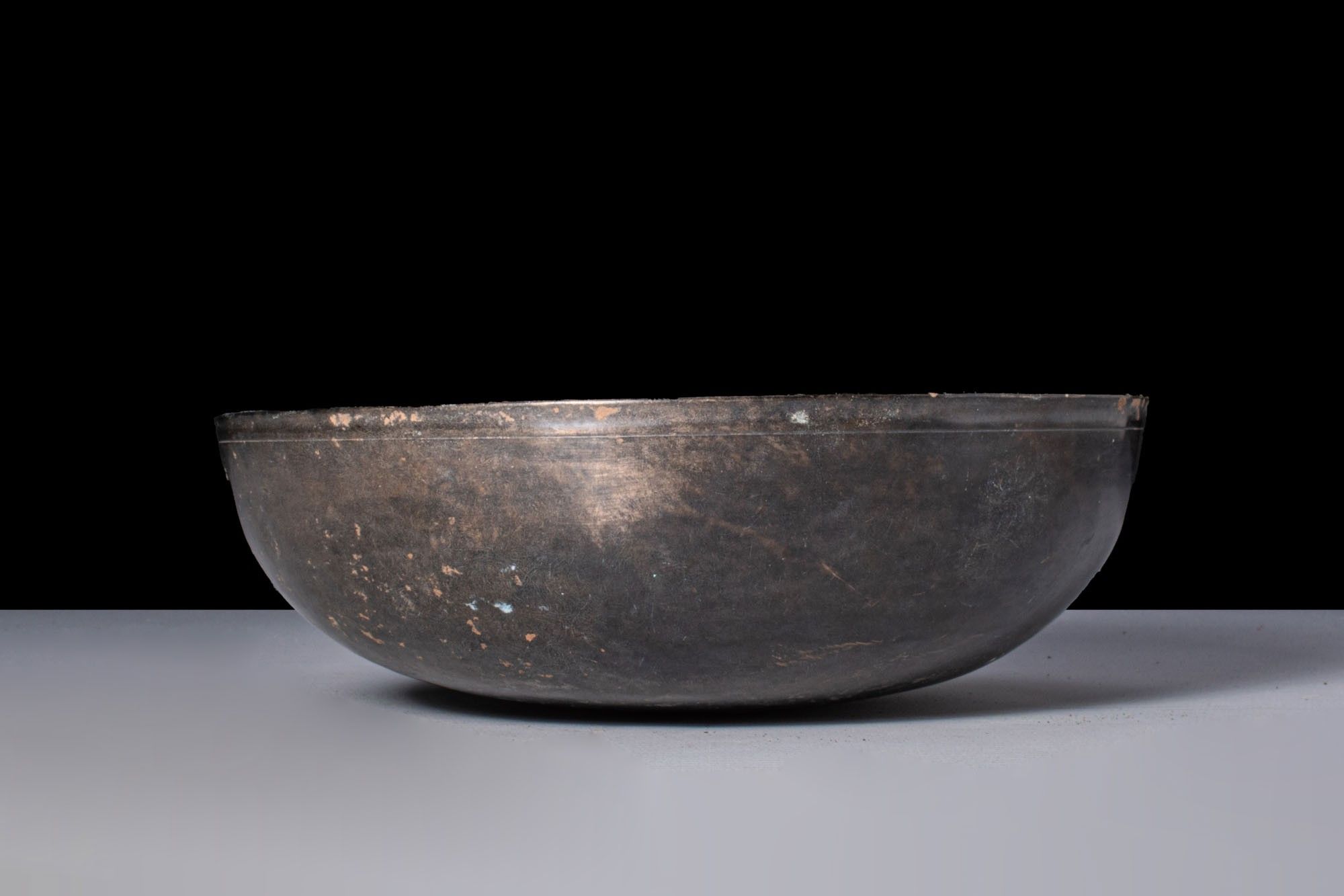 A libation bowl hammered from a single bronze sheet, with broad, gently rounded walls and an everted rim.