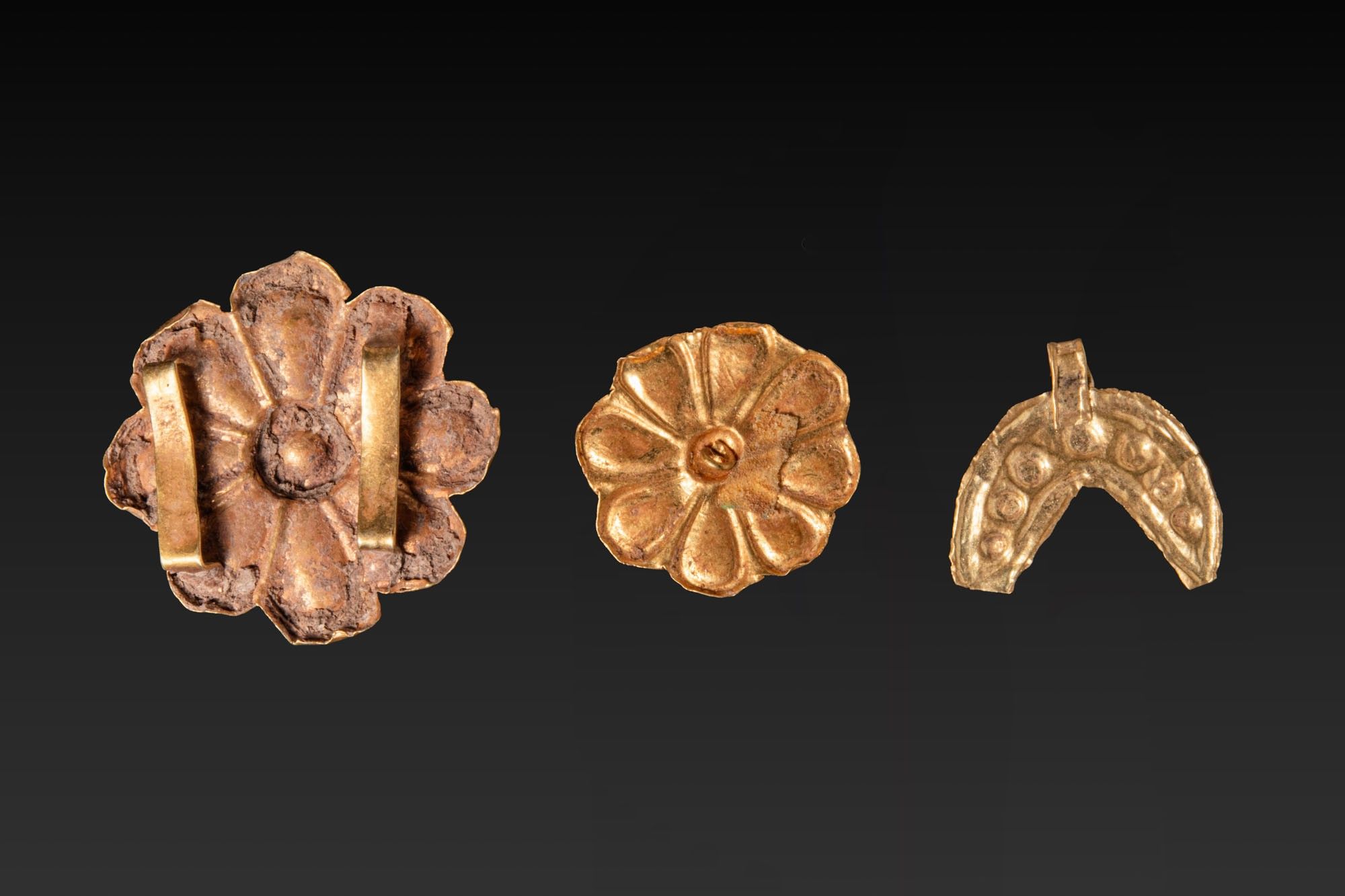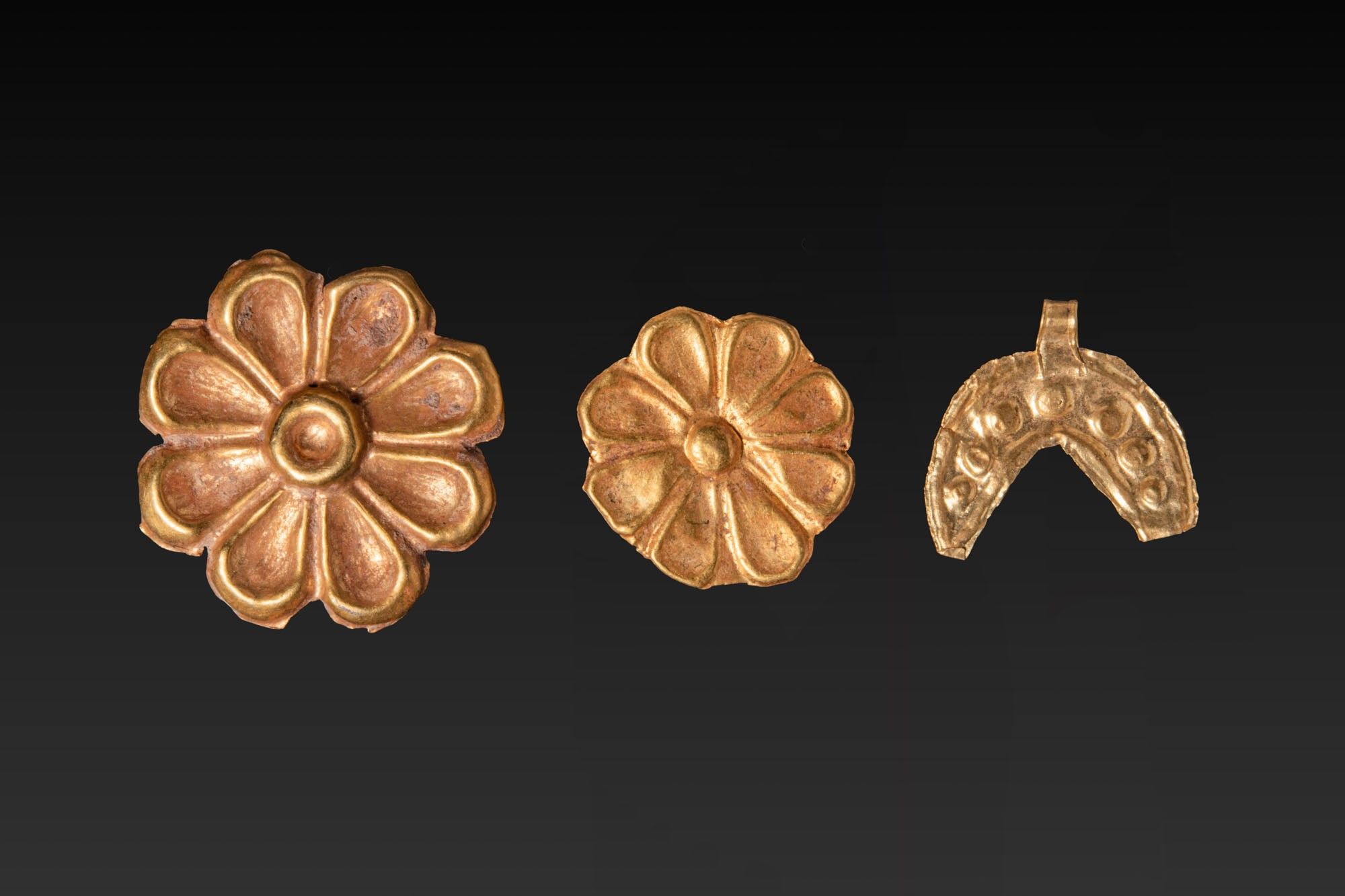 A set of gold jewellery, including, from left to right: two rosette appliqués, each pressed in sheet gold with eight rounded petals radiating from a central boss, one larger with two vertical attachment strips on the reverse, the smaller with a central loop; a crescent-shaped pendant formed from sheet gold with a raised border and a row of seven circular bosses along the arc, a suspension tab above the apex.