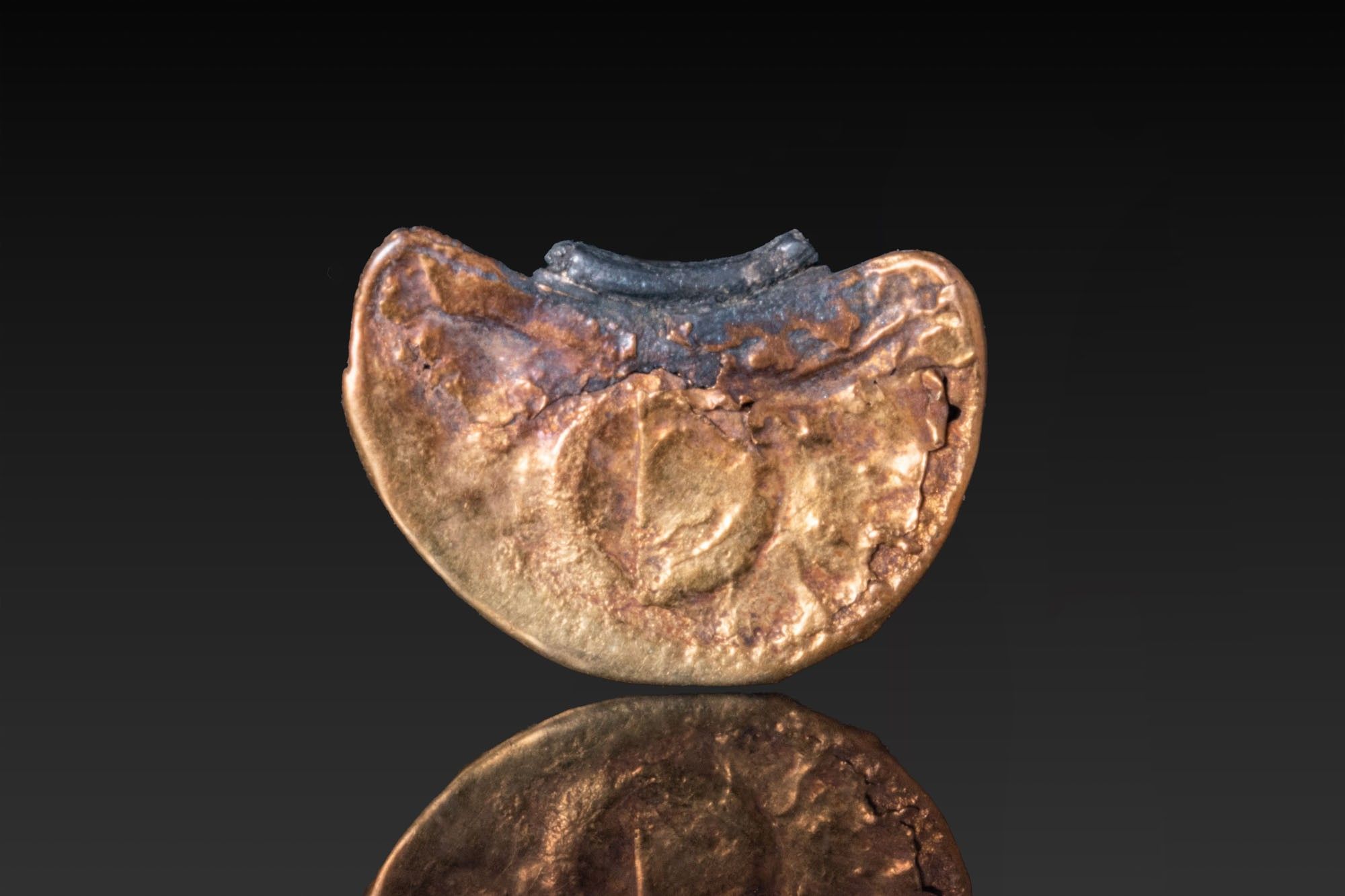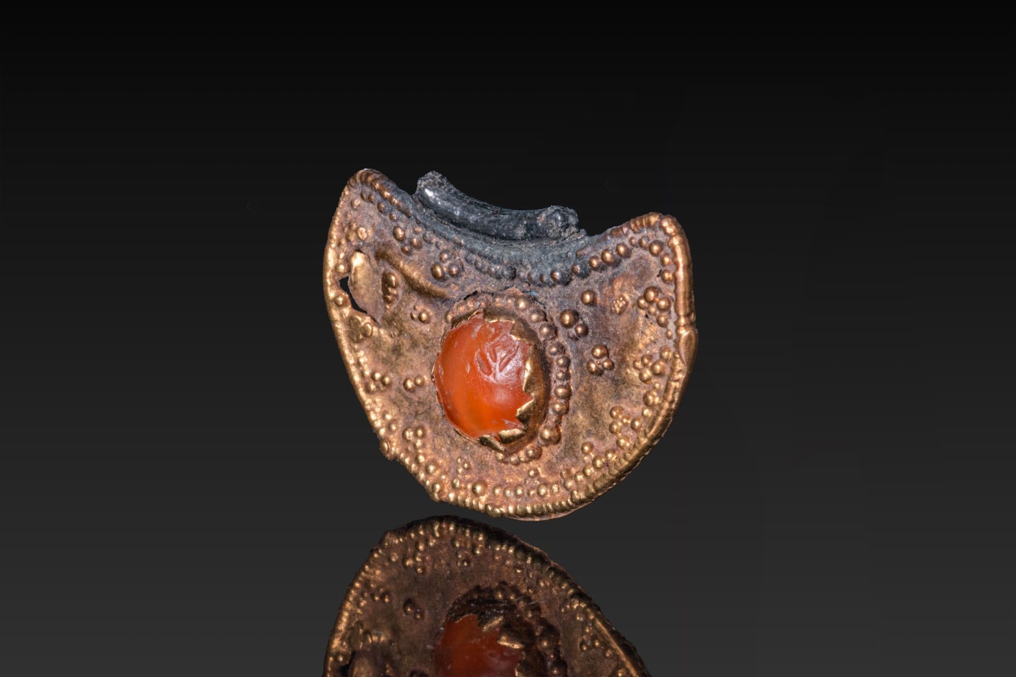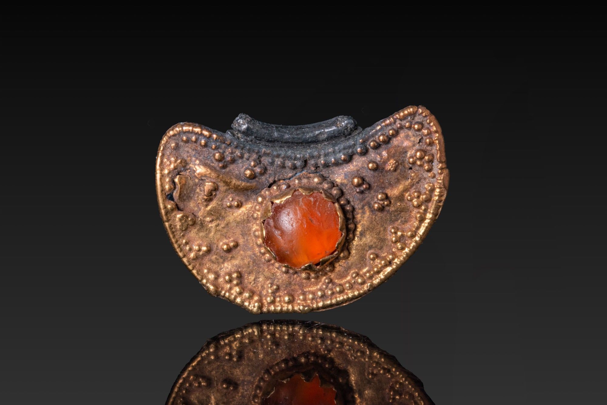A gold lunate pendant formed as a crescent, the upper face bordered with a beaded rim and scattered granulation, centred by a circular box-setting holding an orange carnelian cabochon; the reverse plain.