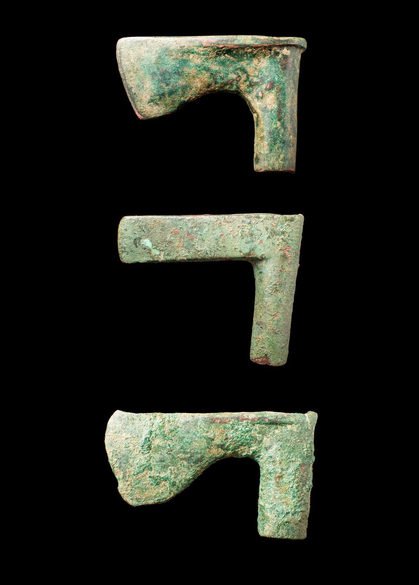 A collection of three bronze axe heads, including, from left to right: a compact piece with a short neck and a sub-triangular blade, the cylindrical socket set perpendicularly beneath; a long, straight-edged example with a square-cut cutting edge, the blade projecting from a tall socket meeting it at a right angle; and a bearded type with a deep, drooping lower outline, the tubular socket placed under the heel.