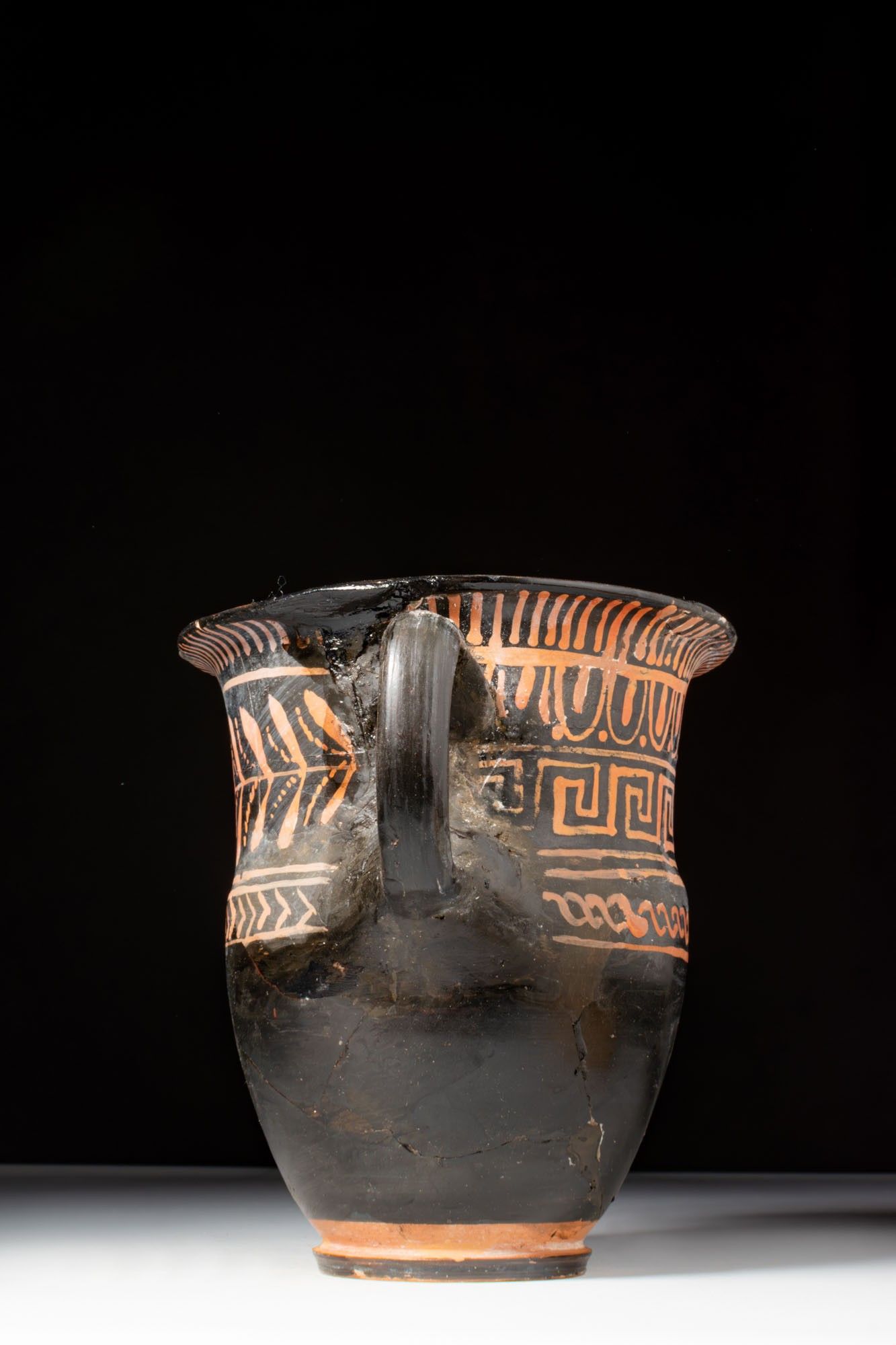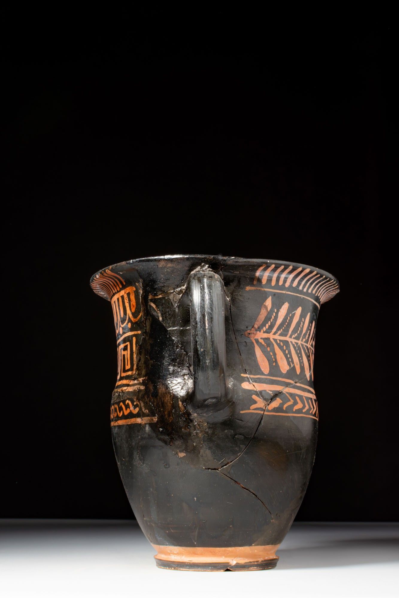 A black-glazed pottery kantharos with a deep body tapering to a small ring foot, a tall everted rim with a rounded lip, and a pair of opposed loop handles set at the shoulder. The upper zone is decorated in added red, one side with vertical strokes, tongues and a running meander bordered by fillets above a wavy line. The other side bears a central rosette flanked by dotted tendrils, surmounted by short vertical strokes and positioned above a chevron frieze.