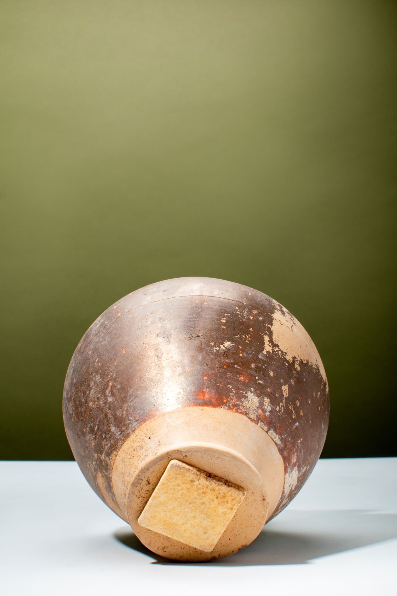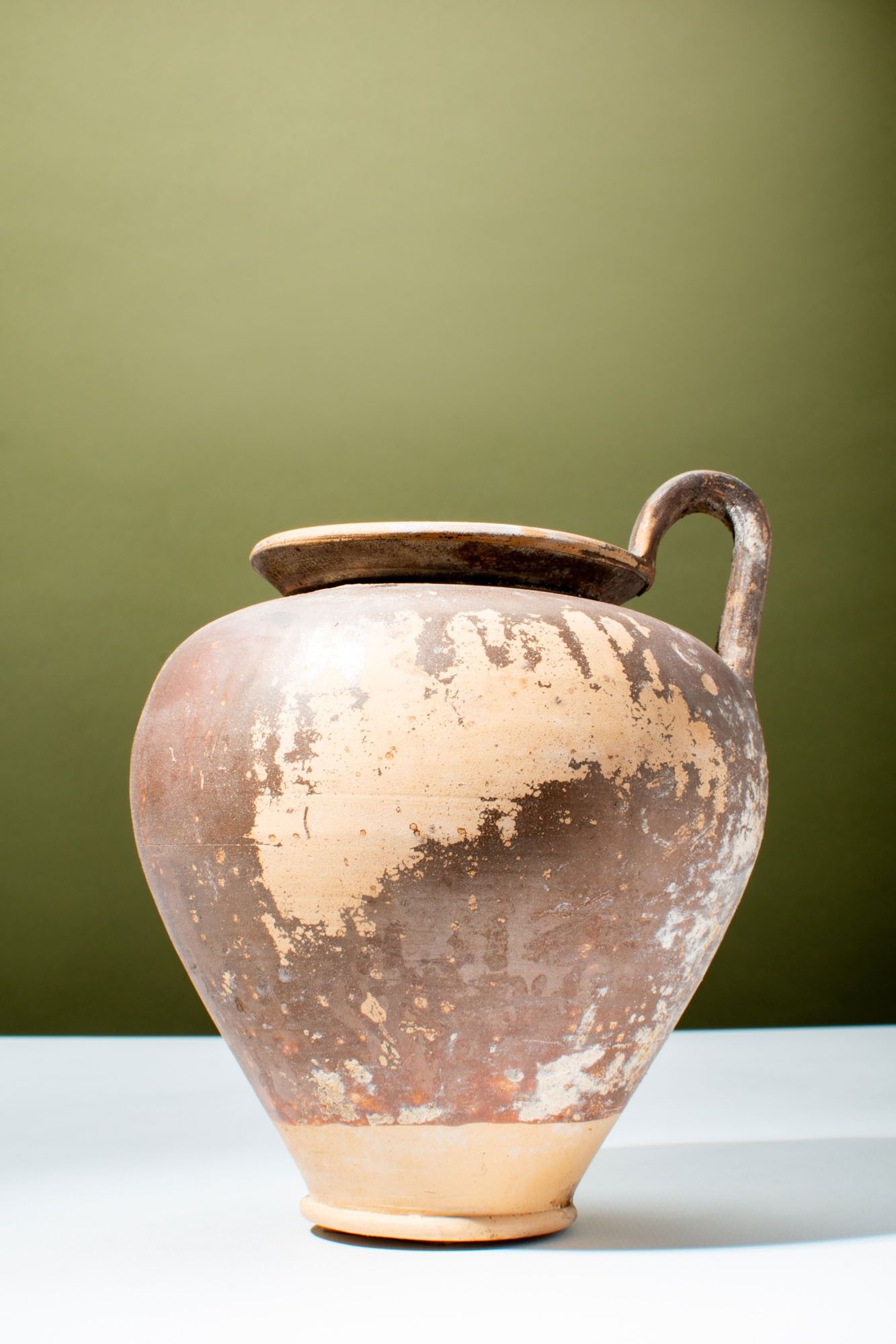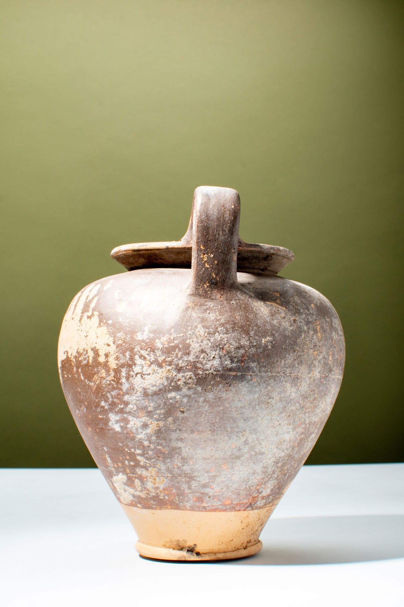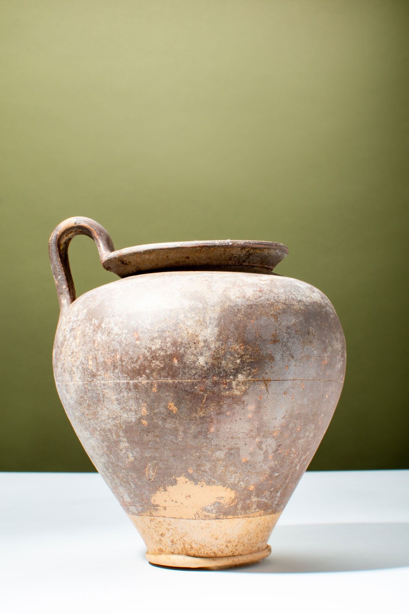 Ca. 400 - 300 BC. A terracotta jug with a rounded body that tapers towards a narrow foot with a slightly raised base. The broad shoulder curves gently into a short, wide neck, terminating in a flaring mouth. A single arching handle extends from the upper shoulder to the rim. For similar see: Black glaze olpe (wine jugs), Canterbury Museum C1969.180, C1969.169, C1969.167. Size: 160mm x 130mm; Weight: 345g Provenance: Private UK collection; From an old Oxford collection formed in the 1990s;
