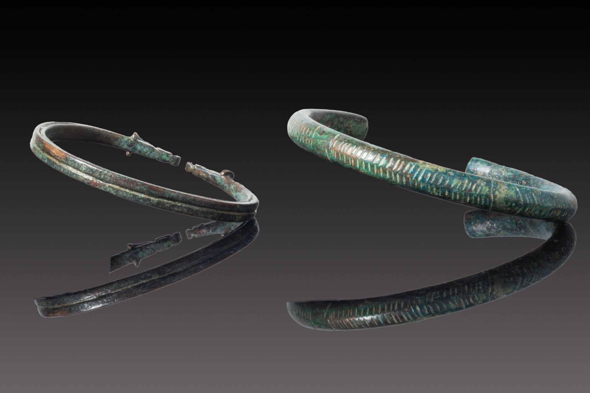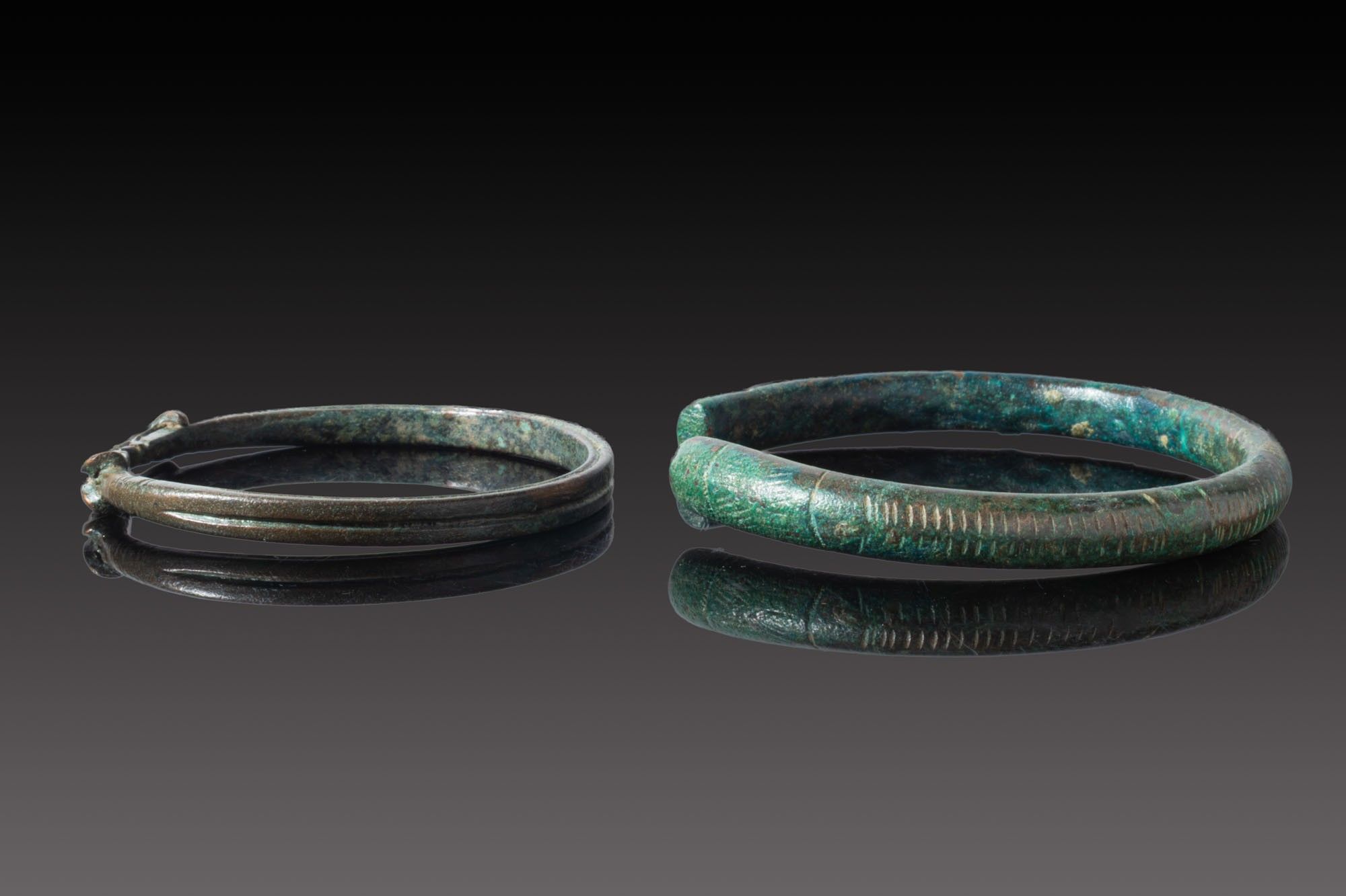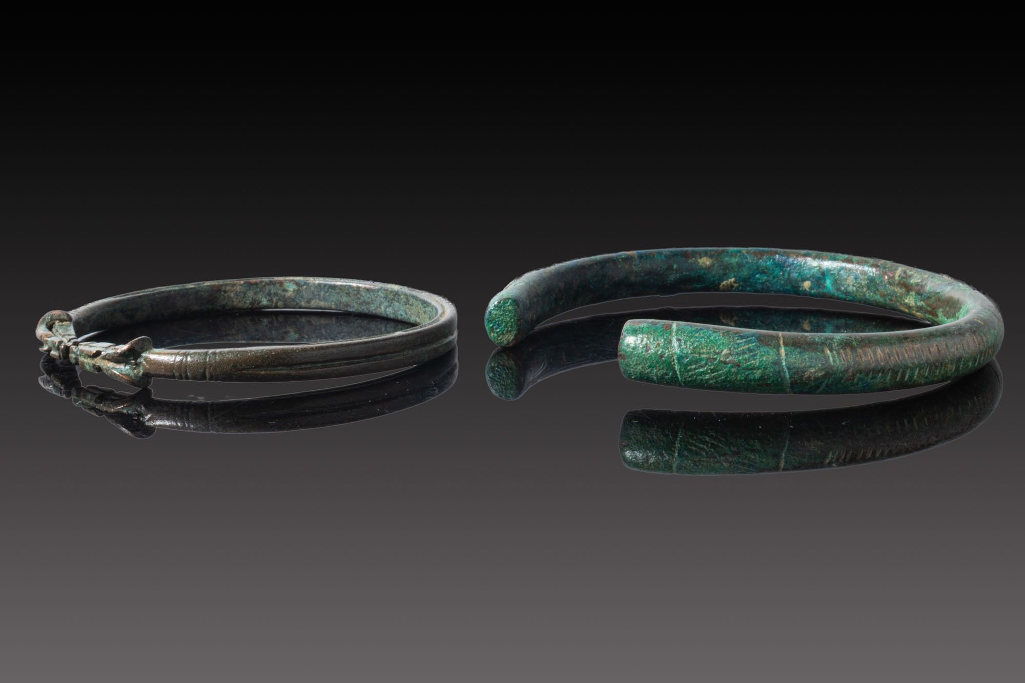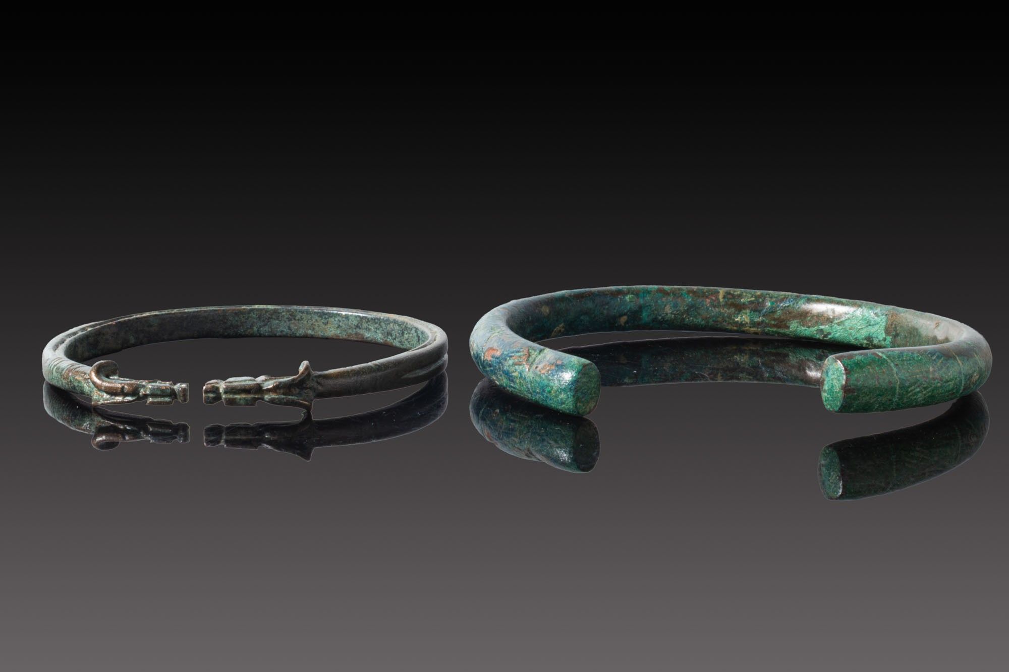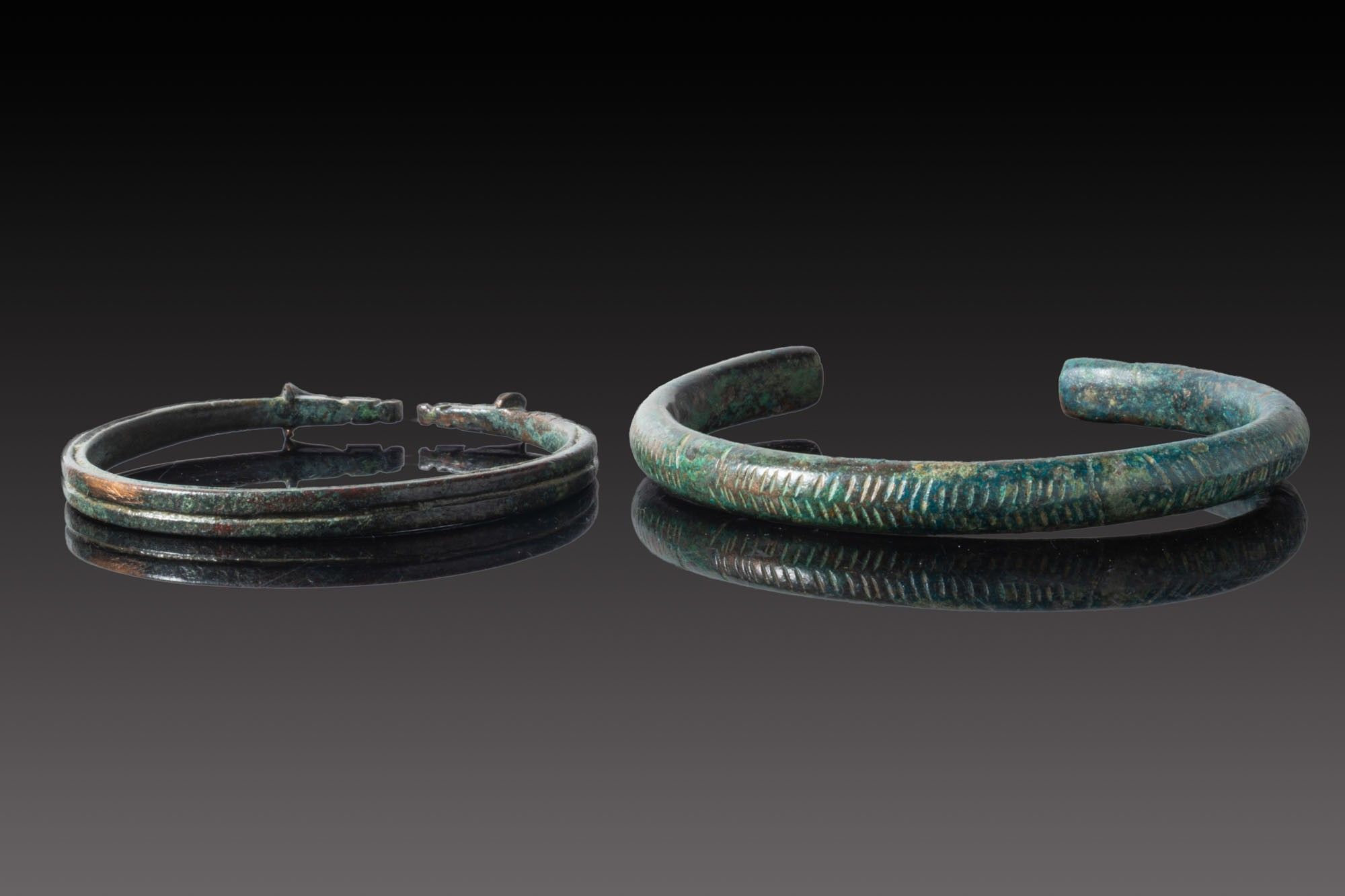 A pair of bronze bracelets, including, from left to right, a slender penannular example with opposed stylised animal head terminals; and a heavier penannular bracelet of thick round section with blunt-cut ends, the exterior decorated with closely spaced oblique notches.