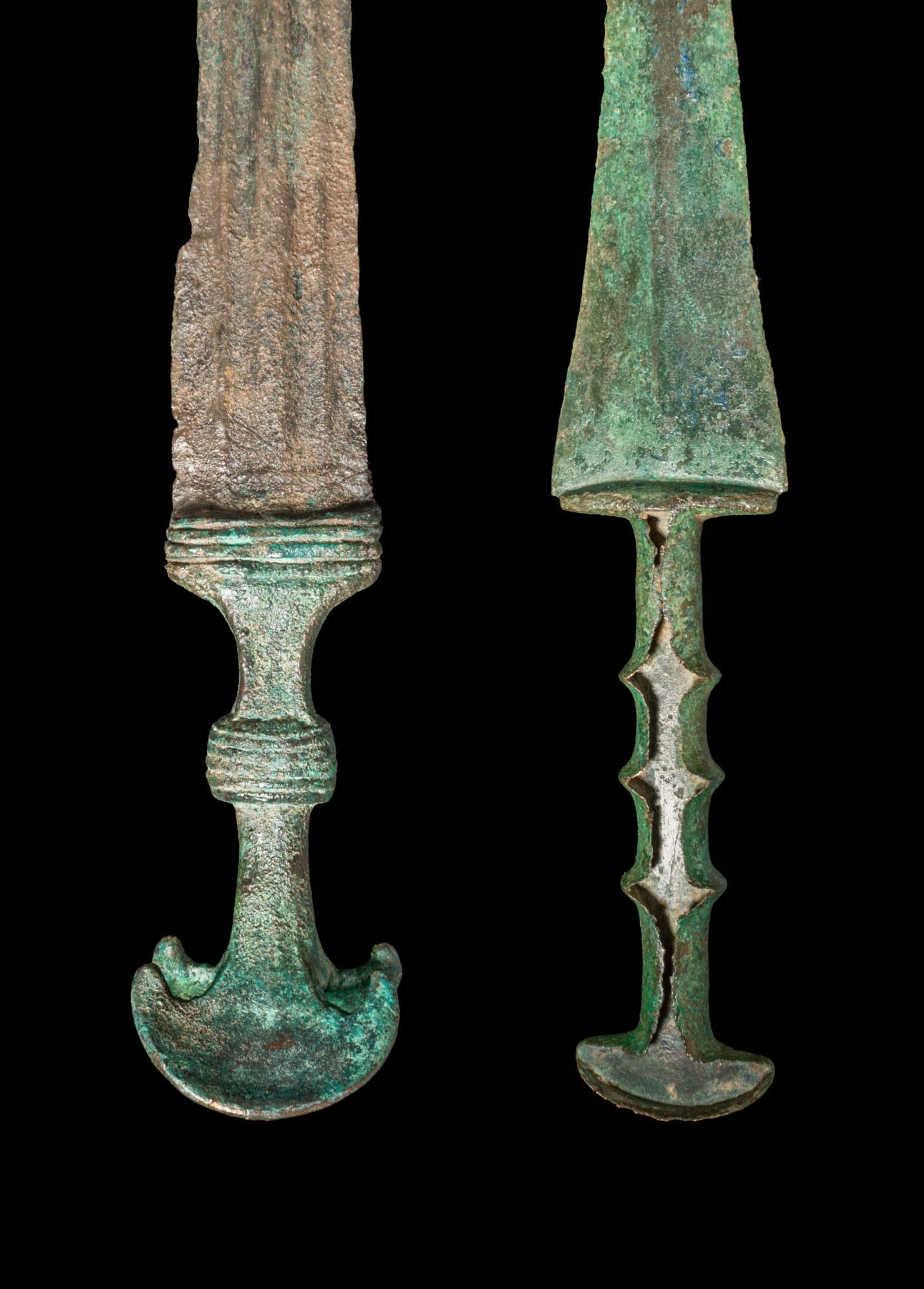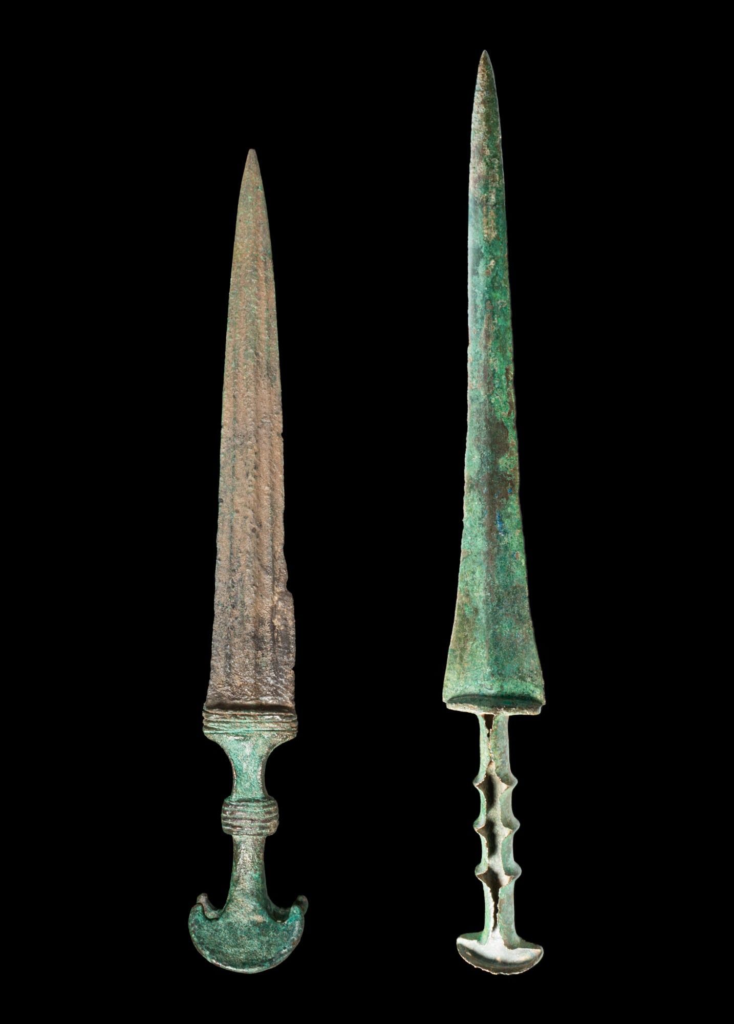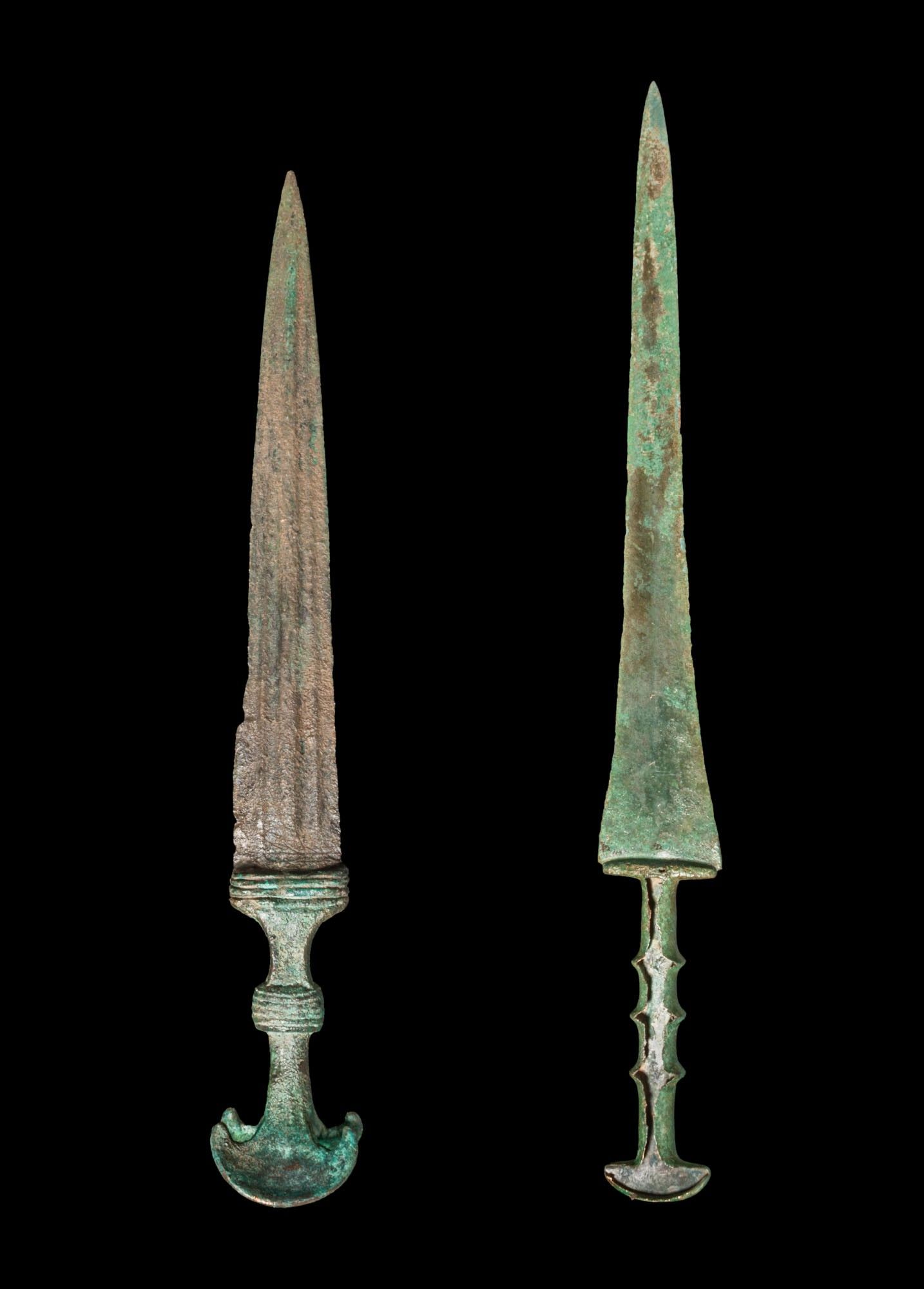 A pair of bronze short swords, including, from left to right: a long tapering blade with a multi-fluted face running from the forte to the point, set above a stepped guard, a waisted grip with a central moulding, and a large crescentic pommel with up-turned terminals; and a slender triangular blade with waisted profile rising from a narrow guard, a grip with three mouldings, and a small crescentic pommel.