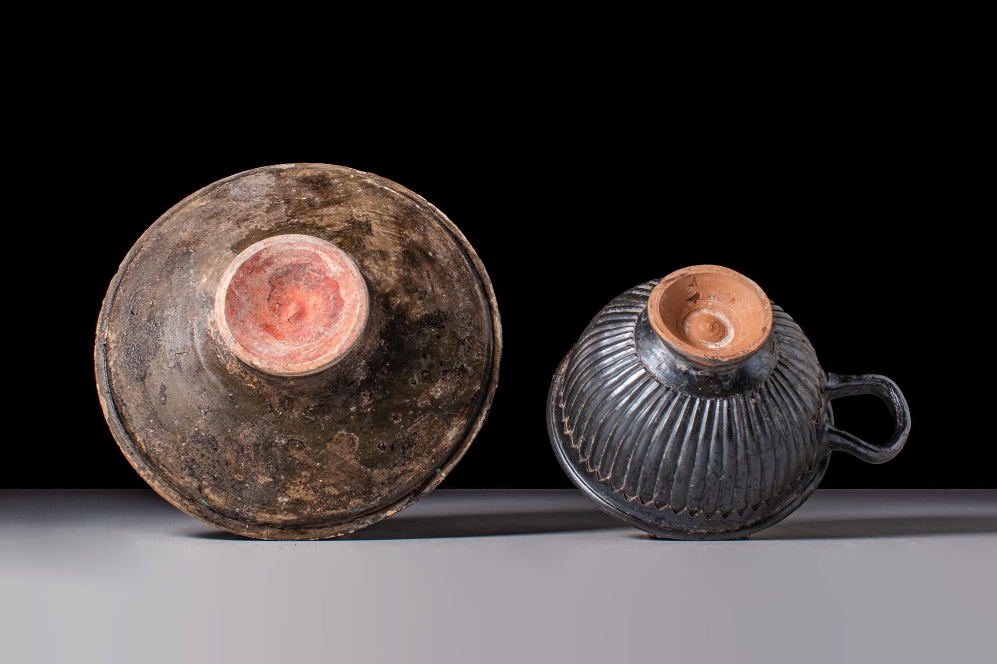 Ca. 350 - 300 BC. A pair of black-glazed cups, including, from left to right: a shallow saucer with a broad out-turned rim on a concave foot; and a single-handled hemispherical cup with a frieze of vertical fluting, set on a tall moulded foot.For similar see: The British Museum, Museum number 1932,1012.1.Size: 1115-130mm x 30-55mm; Weight: 210gPrivate London collection; previously acquired on the Belgian art market; originally in the collection of R Verbruggen, Brussels 1990’s.