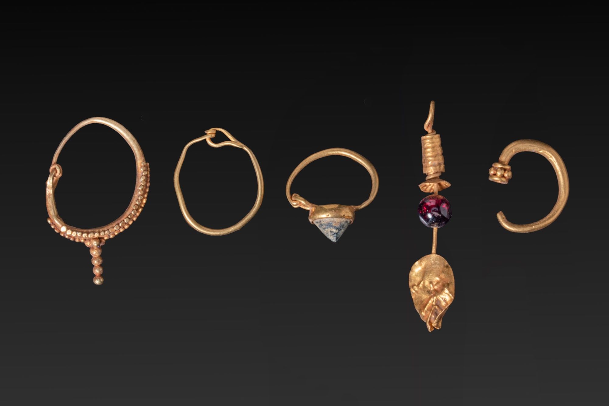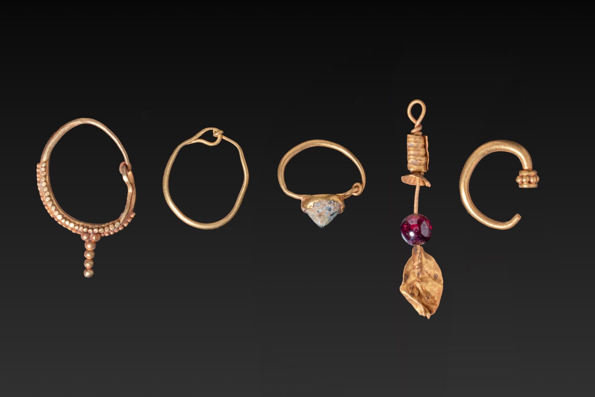 A collection of five gold earrings, including, from left to right: an oval wire hoop ornamented with a granulated crescent and a vertical four-sphere drop; a plain oval hoop with simple hooked closure; a small hoop suspending a pyramidal mount set with a glass inlay; a pendant earring composed of a ribbed collar and spacer above a garnet bead and a hammered leaf-shaped drop; and a petite crescentic hoop finished with a granulated collar.