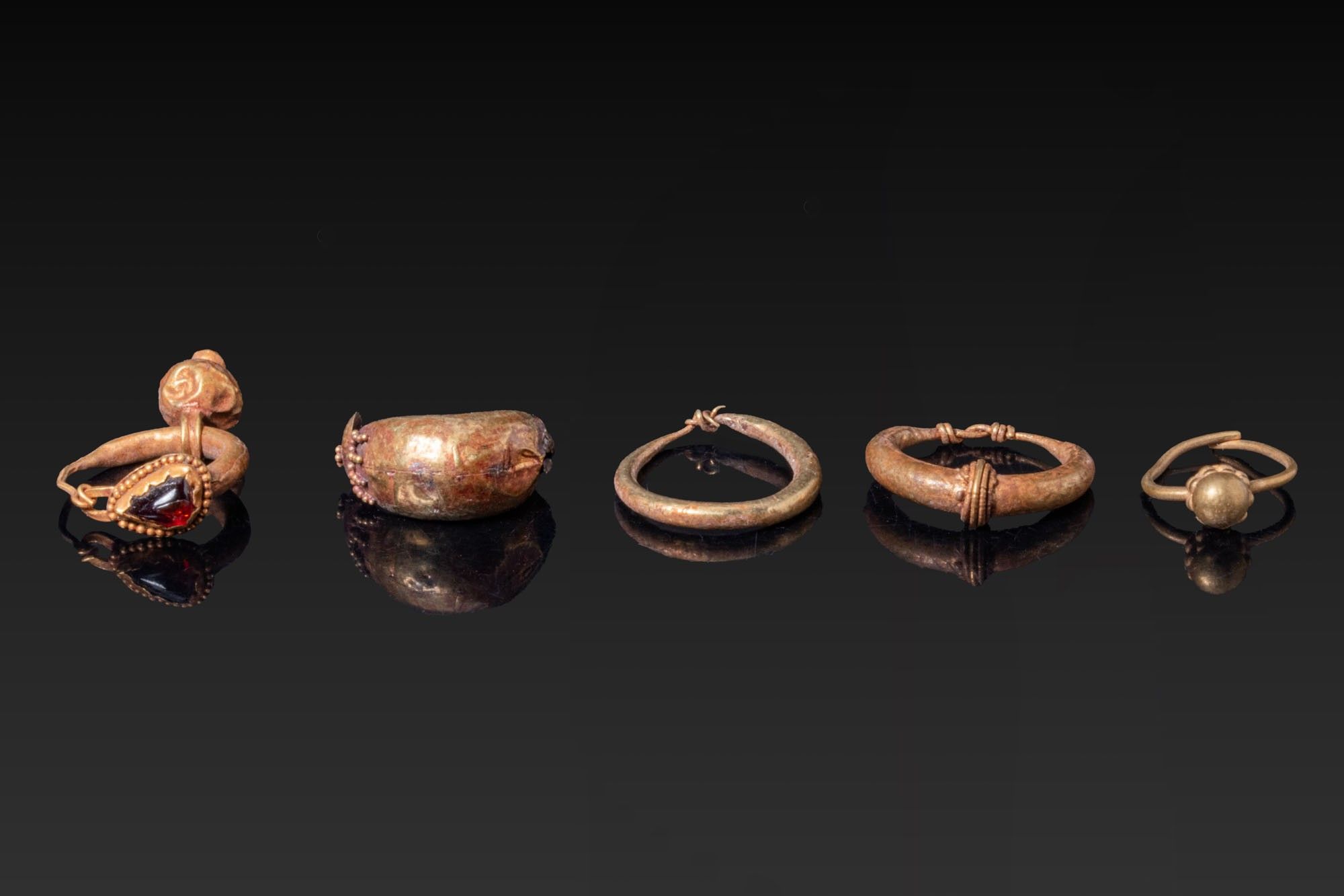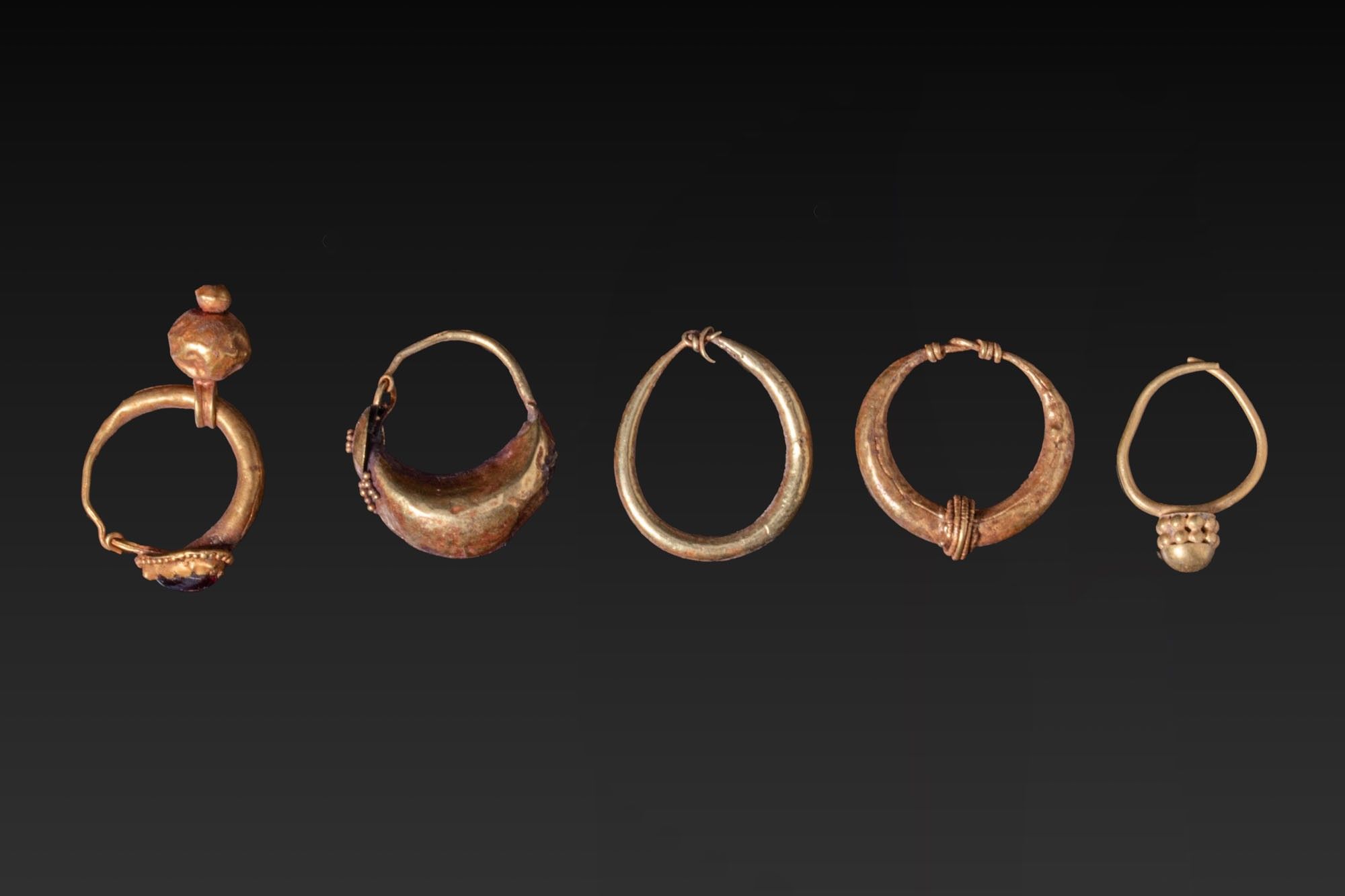 A collection of five gold earrings, including, from left to right: a tapering hoop surmounted by a garnet cabochon in a beaded collet and suspending a small pendant; a hollow boat-shaped earring with filigree decoration; an oval hoop with a wrapped-wire closure; a crescent hoop decorated with coiled bindings; and a slender hoop with a suspended globule.