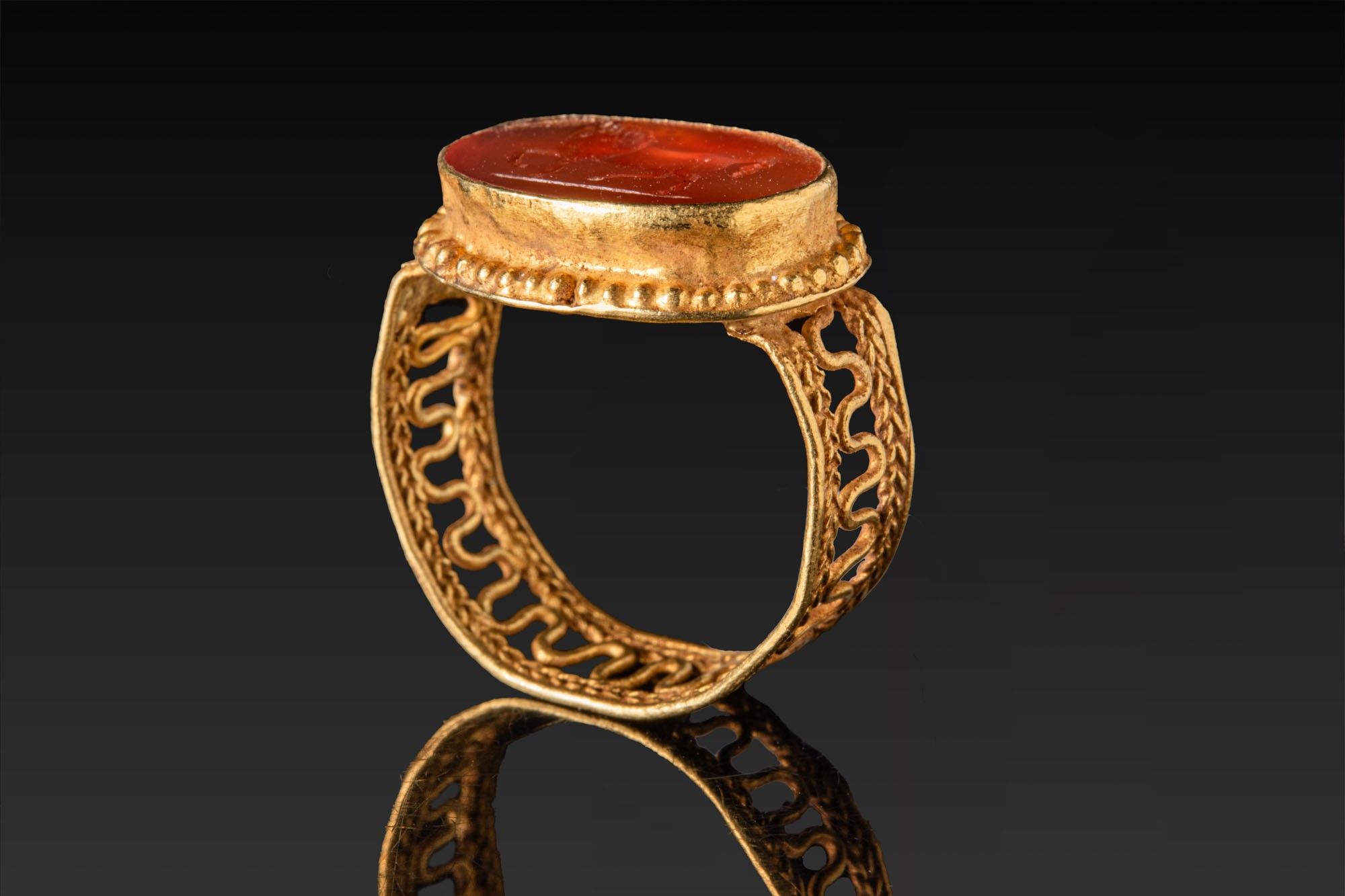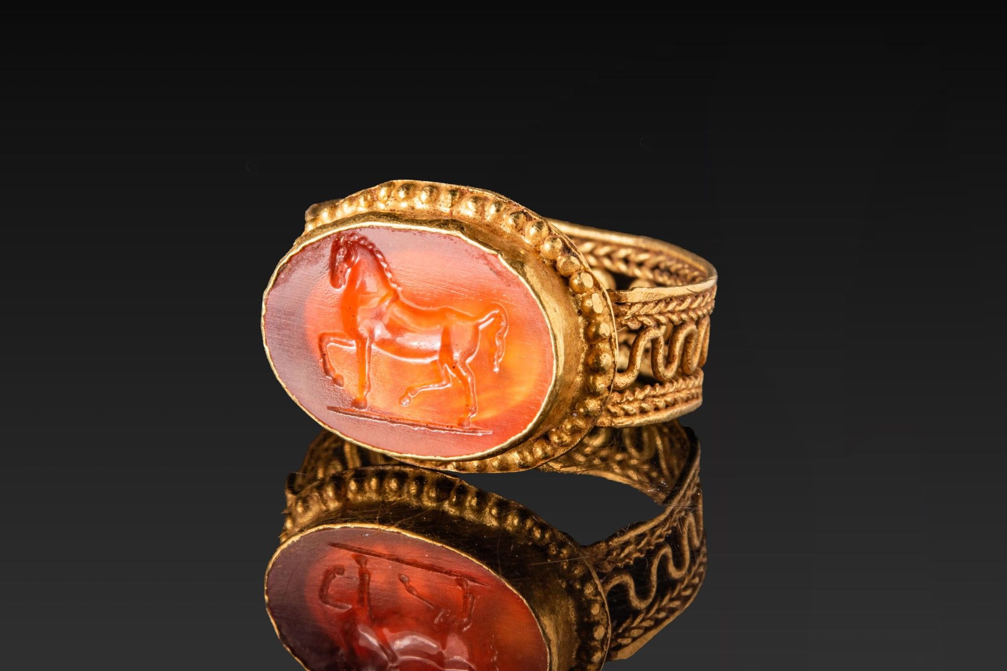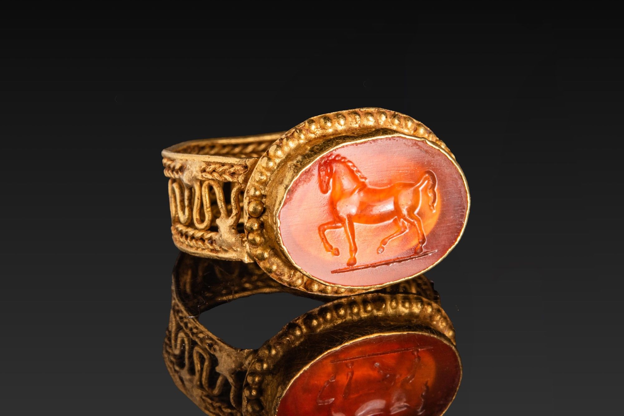 STUNNING HELLENISTIC GOLD RING WITH CARNELIAN INTAGLIO DEPICTING HORSE IN OPENWORK.