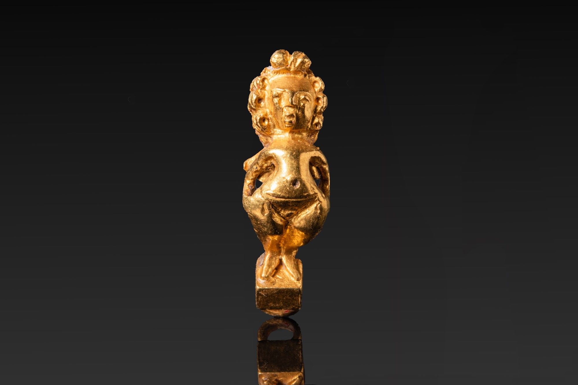 A gold earring with a figure of Eros standing frontally, the curly hair bound in a topknot and the arms akimbo, the oval face with full cheeks. The torso with a protruding abdomen and broad hips, the feet set on a small rectangular terminal fitted with a loop. A round-section wire shank issues from the back of the figure and returns to the terminal as a hooked fastening.