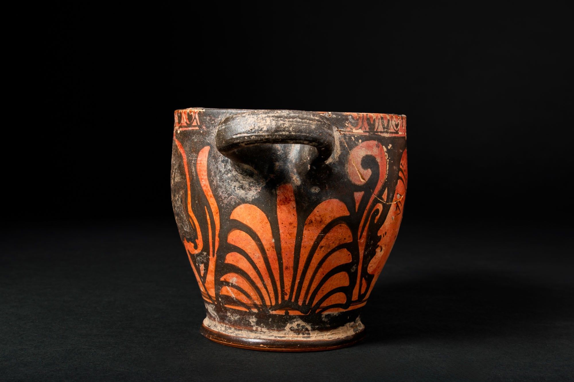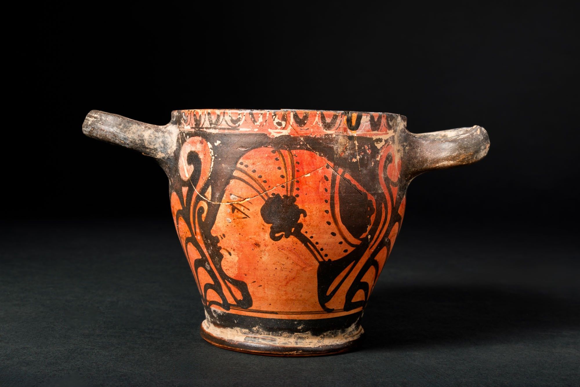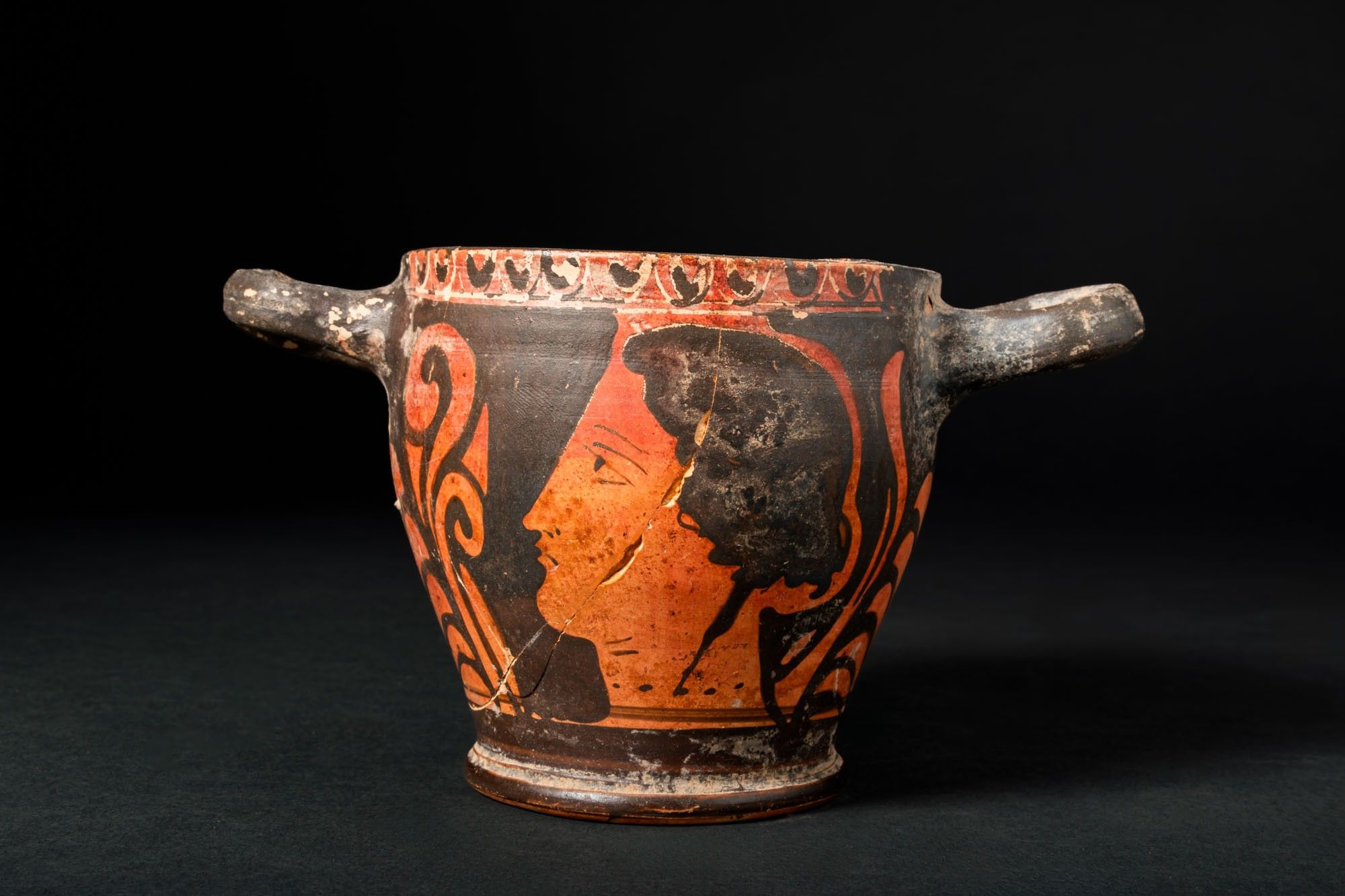 Ca. 325 - 300 BC. A red-figure skyphos with a straight rim, horizontal handles set high on the wall, a tapering body and a moulded ring foot. Each side shows a female head in profile, the so-called Lady of Fashion, framed by large scrolling tendrils and a central palmette; a frieze of ovolo runs below the rim. For similar see: The Metropolitan Museum of Art, Object Number: 76.12.15. Size: 85mm x 145mm; Weight: 165g Private London collection; previously acquired on the English art market; originally in the collection of W Jenikin, London 1980’s.
