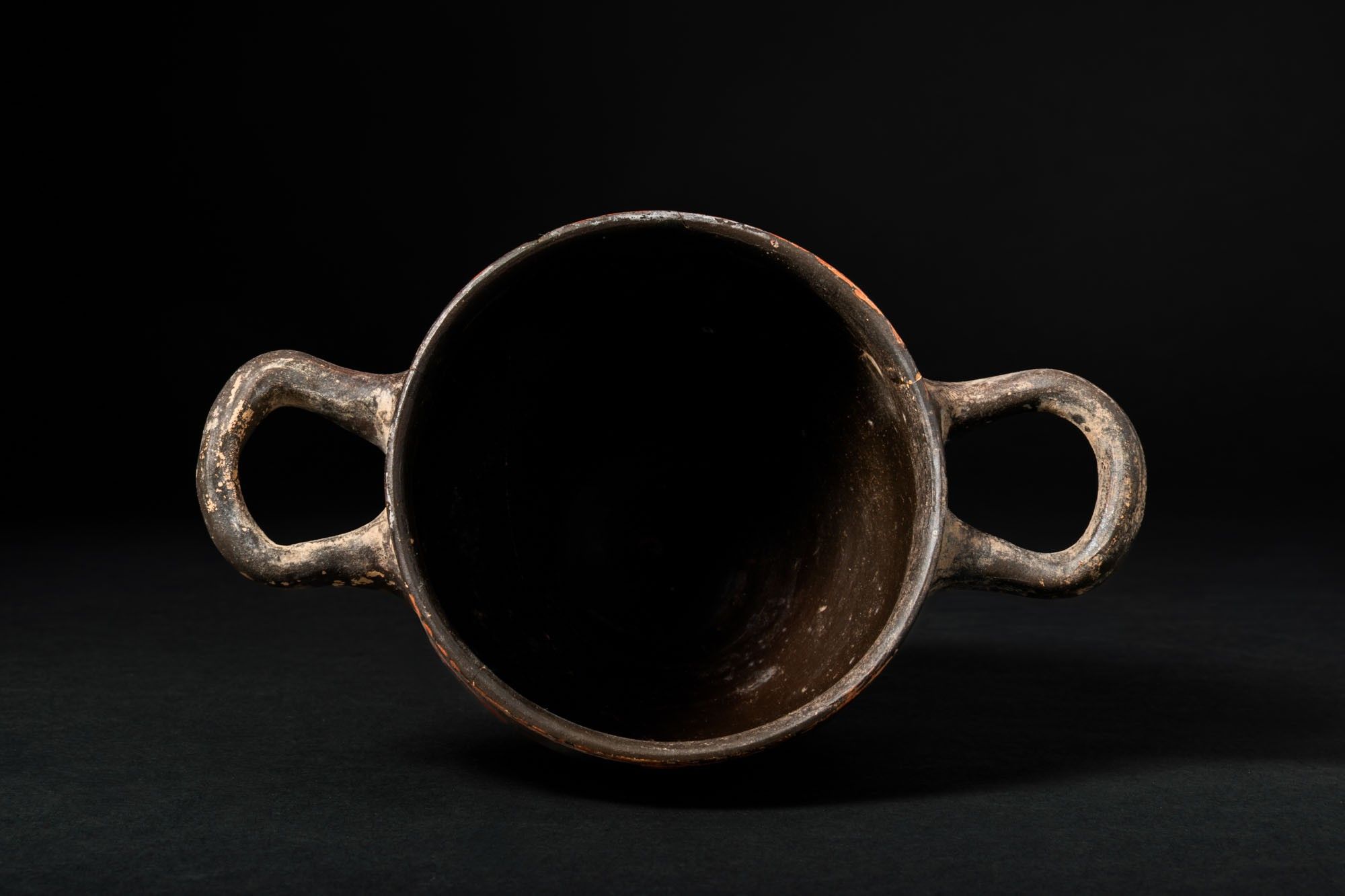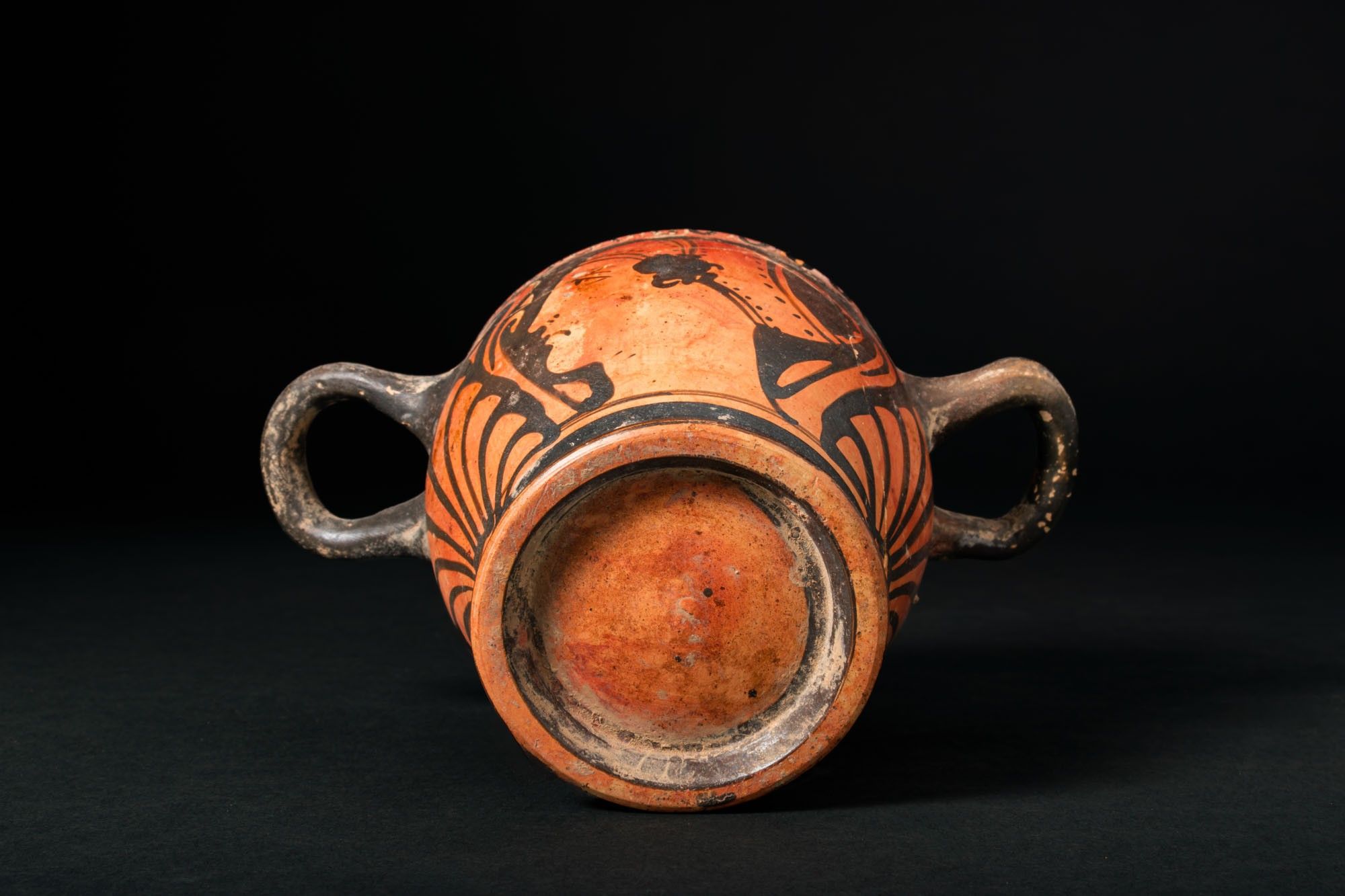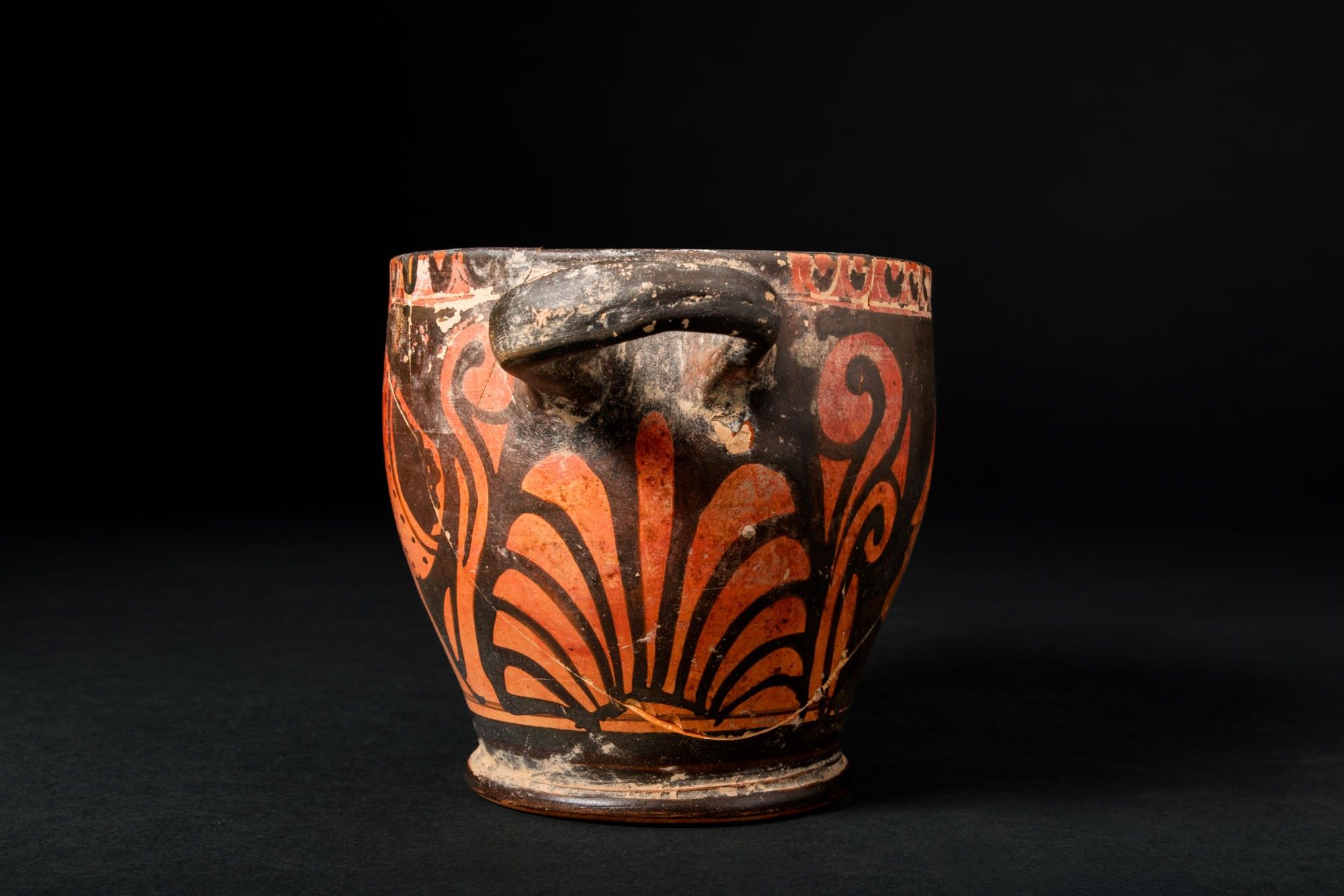 Ca. 325 - 300 BC. A red-figure skyphos with a straight rim, horizontal handles set high on the wall, a tapering body and a moulded ring foot. Each side shows a female head in profile, the so-called Lady of Fashion, framed by large scrolling tendrils and a central palmette; a frieze of ovolo runs below the rim. For similar see: The Metropolitan Museum of Art, Object Number: 76.12.15. Size: 85mm x 145mm; Weight: 165g Private London collection; previously acquired on the English art market; originally in the collection of W Jenikin, London 1980’s.