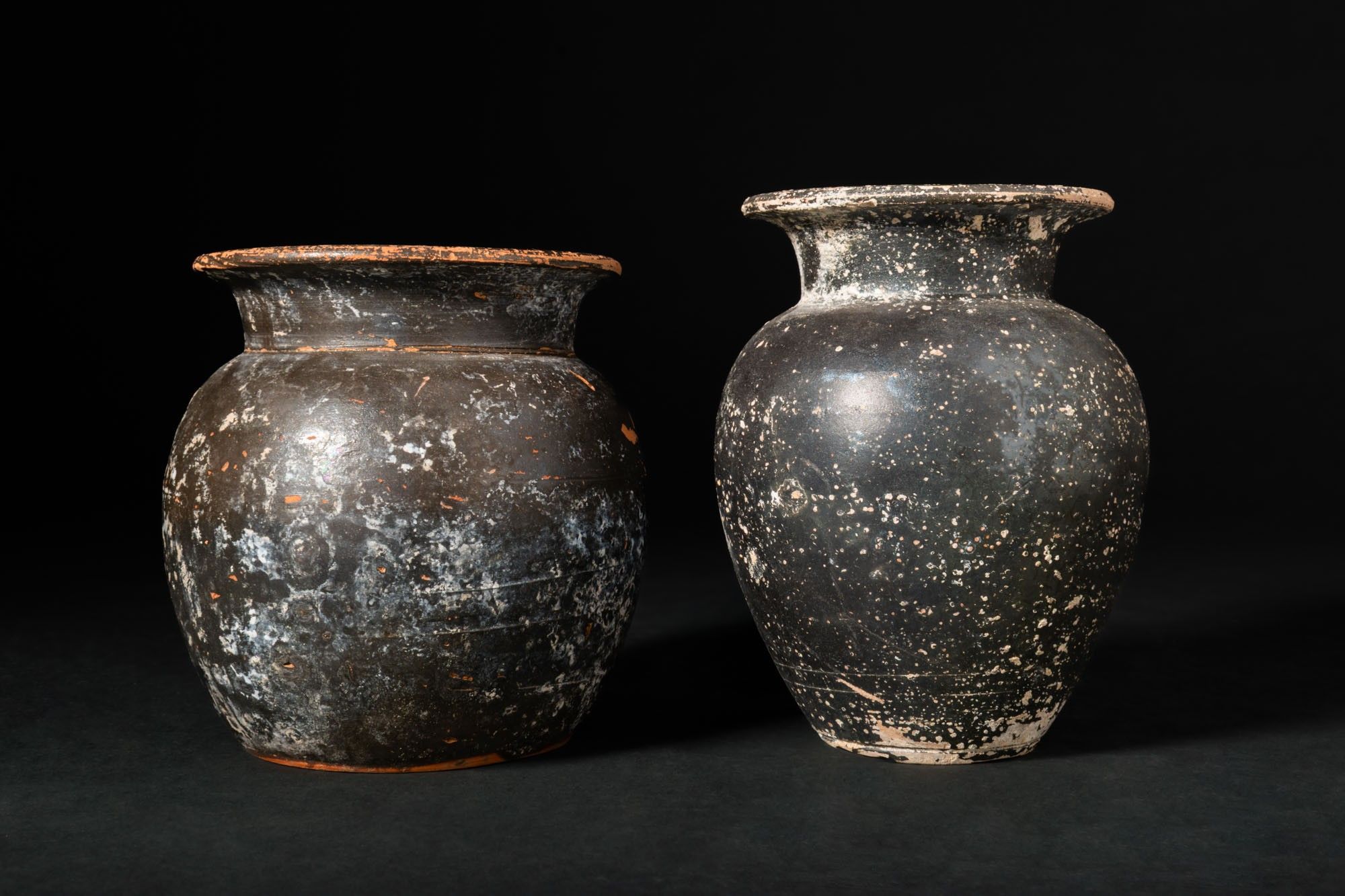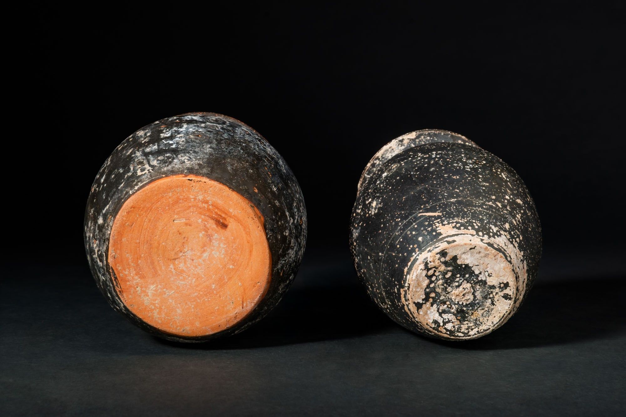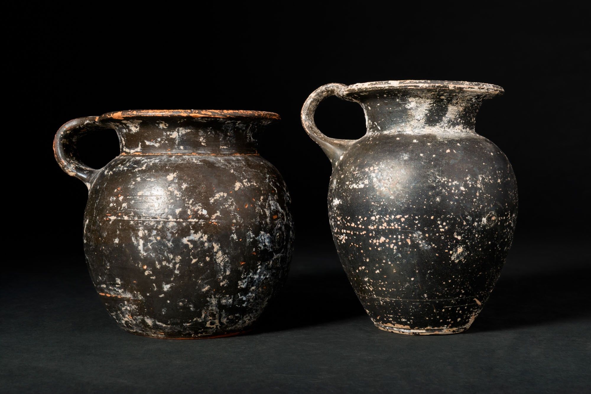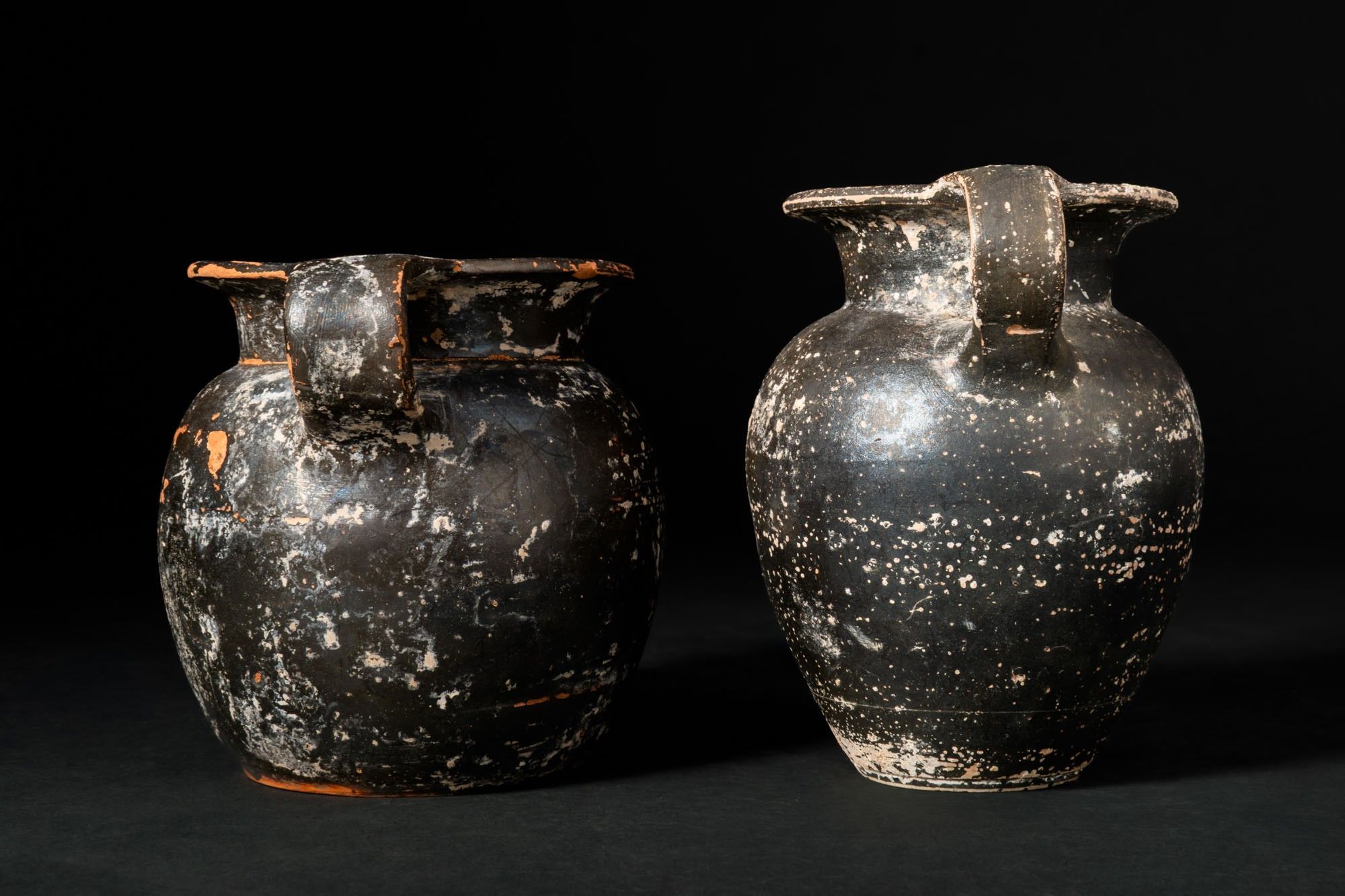 Ca. 400 - 300 BC. A pair of black-glaze mugs, each with a broad flaring lip, short neck, globular body, and a strap handle rising from rim to shoulder. For similar see: Christie's, Live Auction 2605, Antiquities, Lot 161. Size: 100-110mm x 90-100mm; Weight: 405g Private London collection; previously acquired on the Belgian art market; originally in the collection of R Verbruggen, Brussels 1990’s.