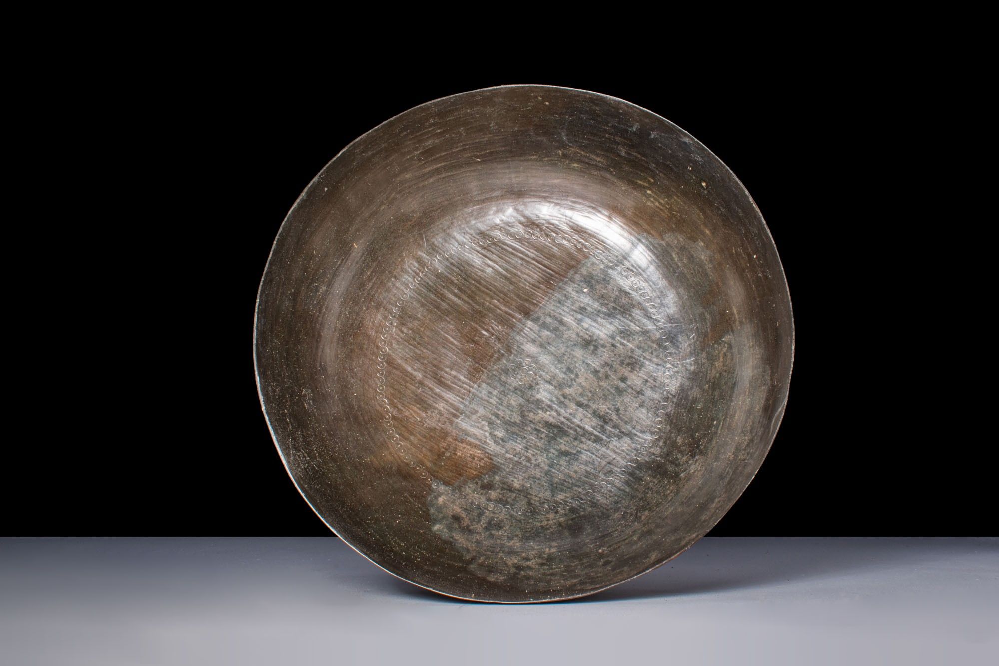 A bronze hammered bowl with thin walls, a plain rim and a flattened base. The interior floor is encircled by a continuous ring of dot-in-circle punches; the exterior plain.