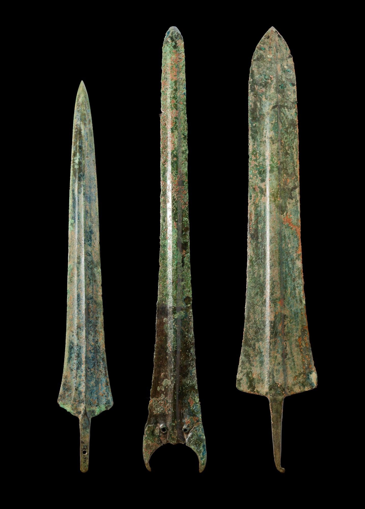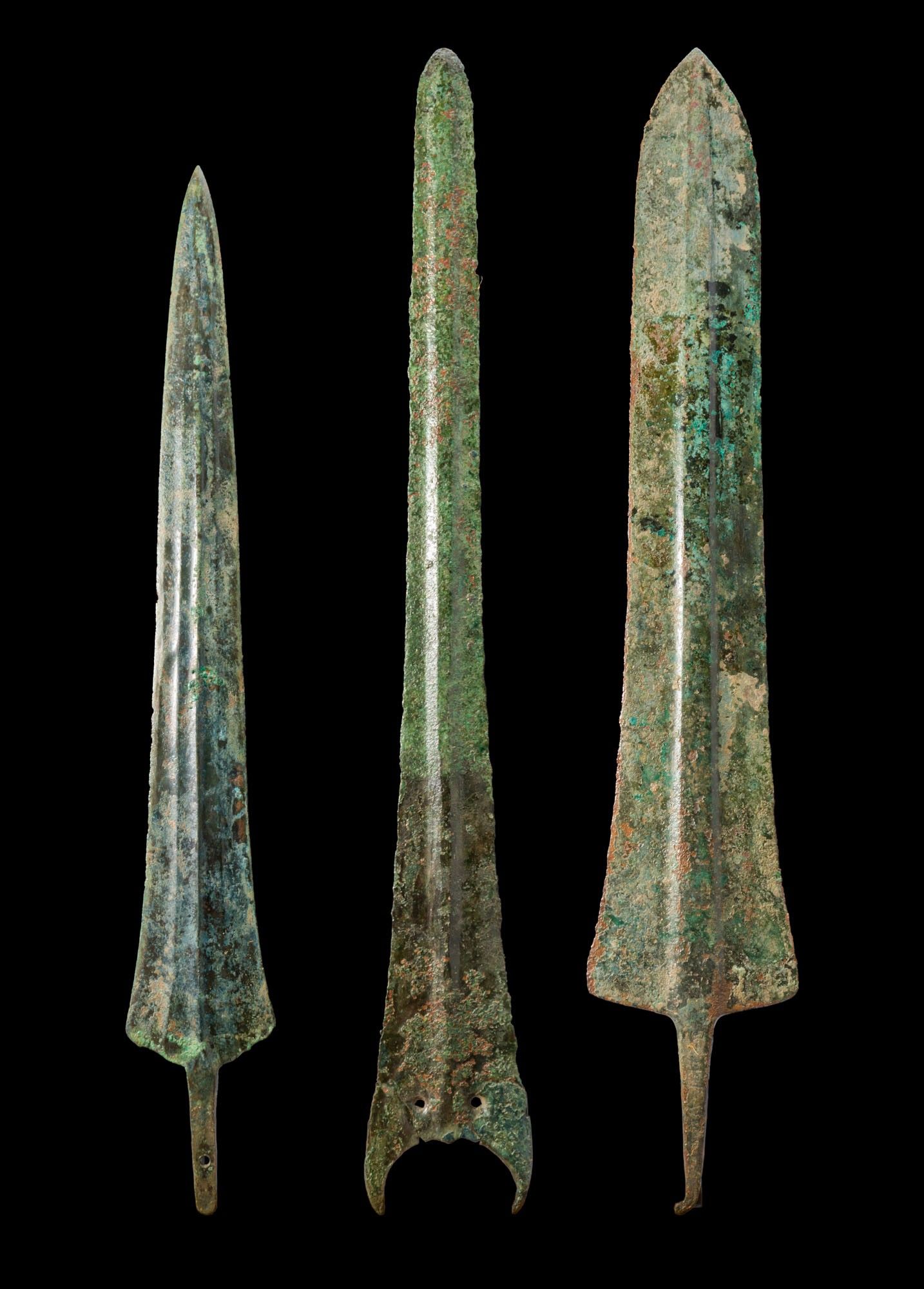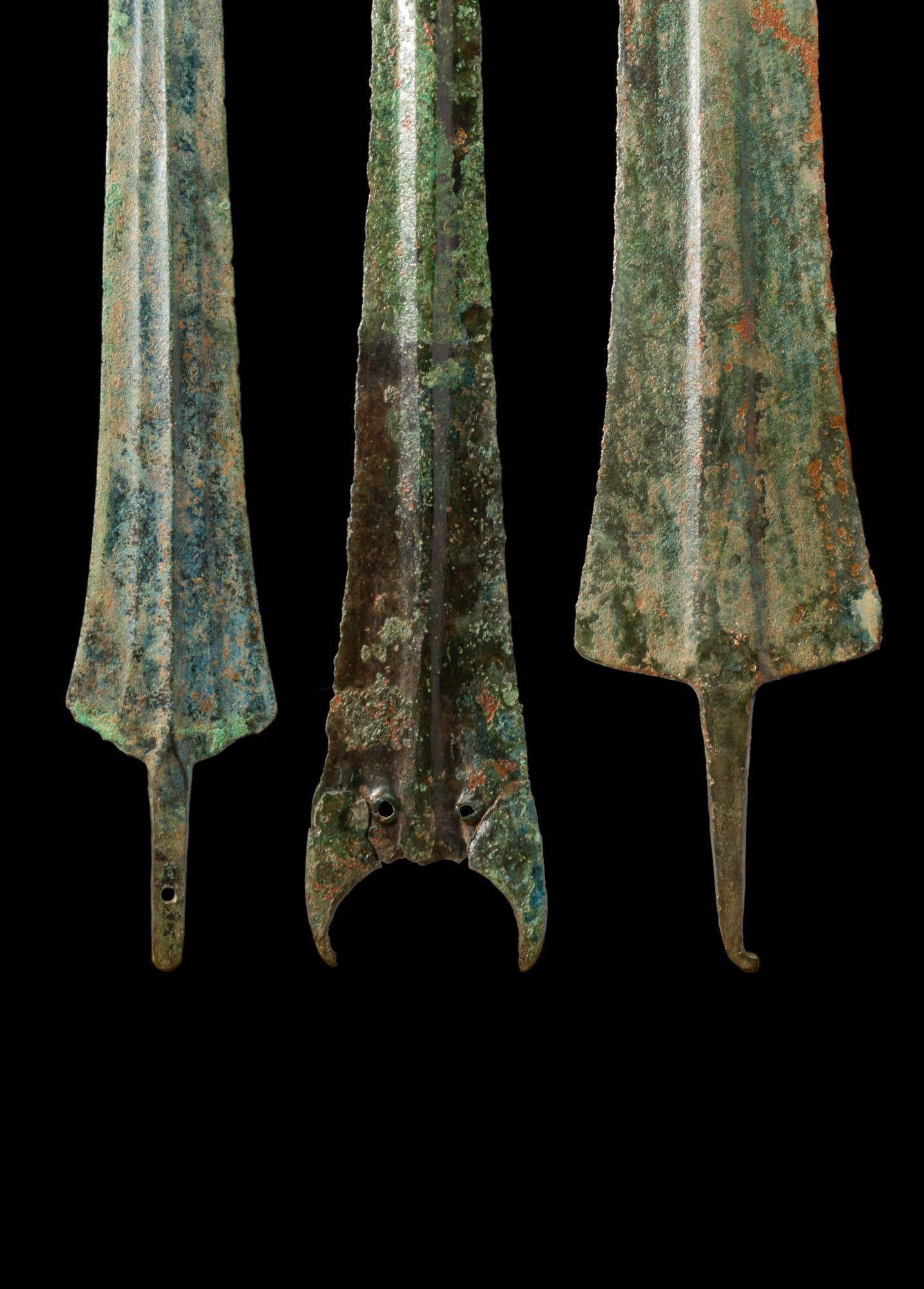 A collection of three bronze spearheads, including, from left to right: a leaf-shaped blade with a strong medial rib and a short rectangular tang with a rivet hole; an elongated blade with a pronounced midrib and extended shoulders with two rivet holes; and a broad blade with a sharp tip and central rib, terminating in a small hook.