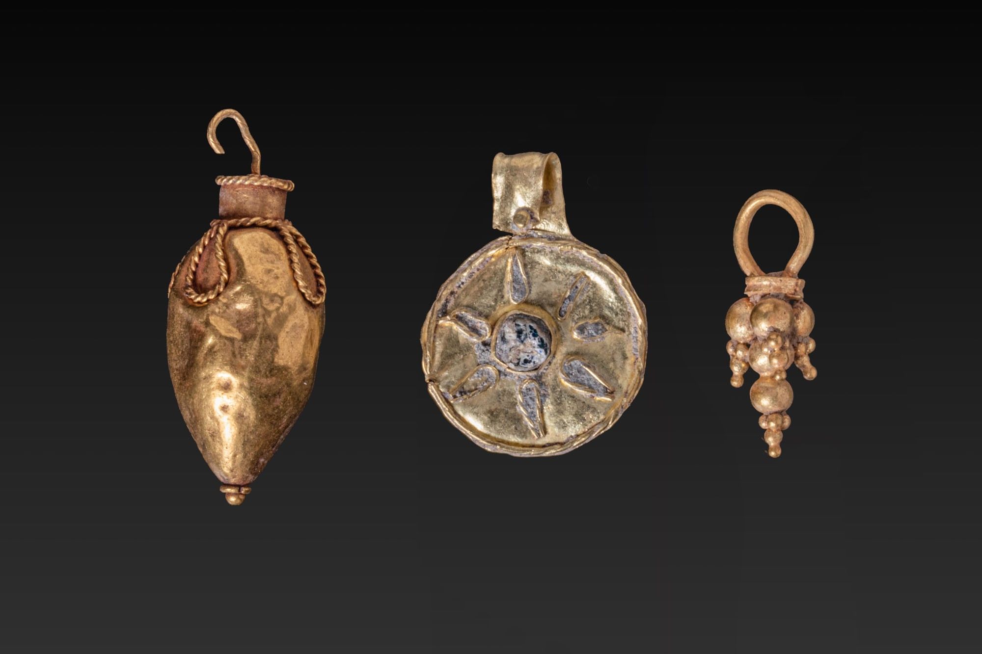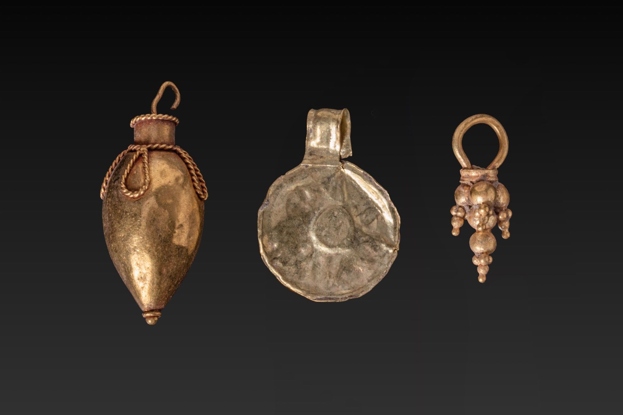 A collection of three gold pendants, including, from left to right: a drop-shaped amphora pendant with a short cylindrical neck bound by a rope-twist collar with looped ties, the pointed body terminating in a tiny pellet; a circular medallion with a broad upright suspension loop, the face worked with a seven-rayed rosette around a central circular insert; and a small cluster pendant with an integral ring, stepped collar and granulated globules arranged as a bunch, finishing in a pendant bead.