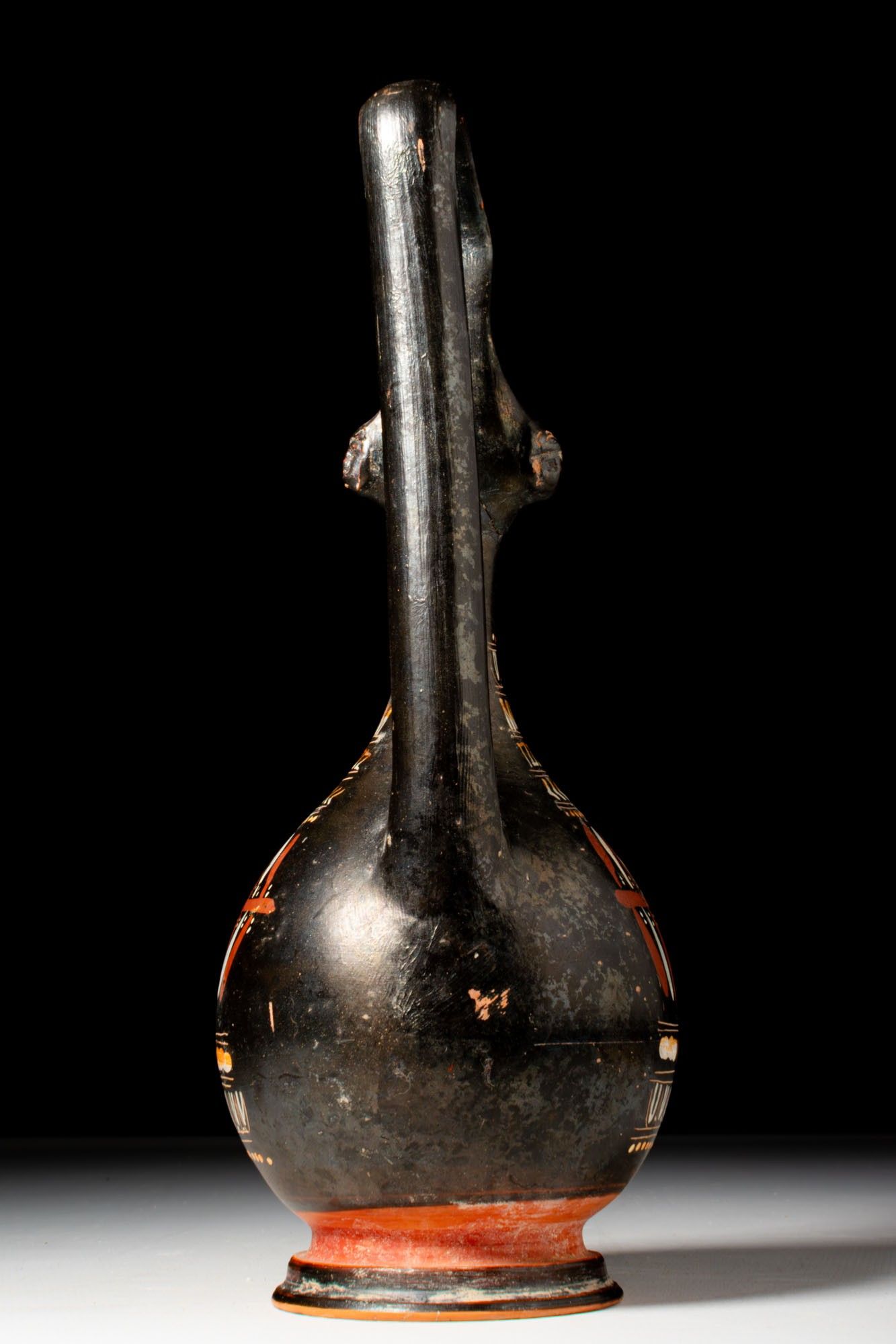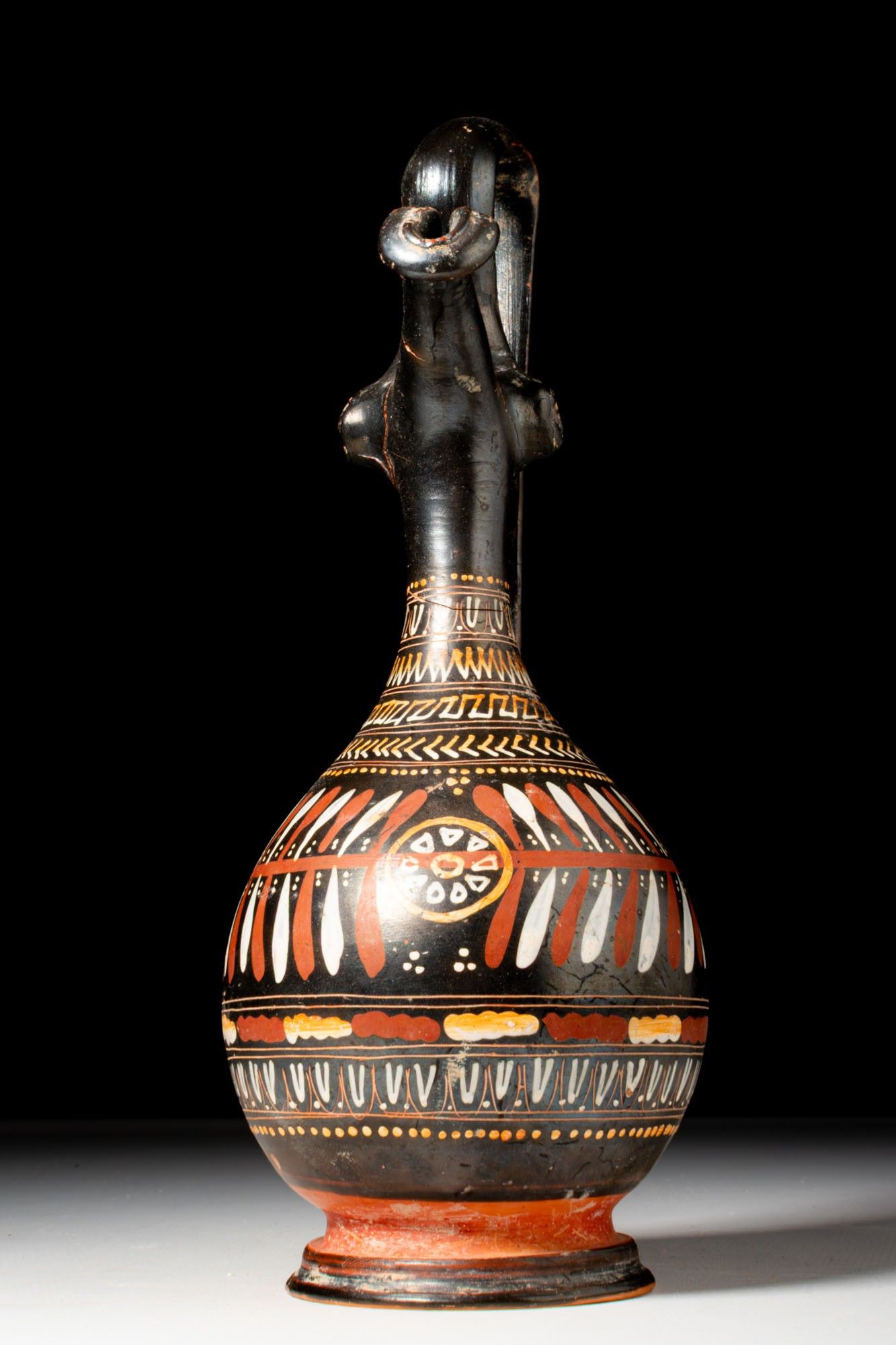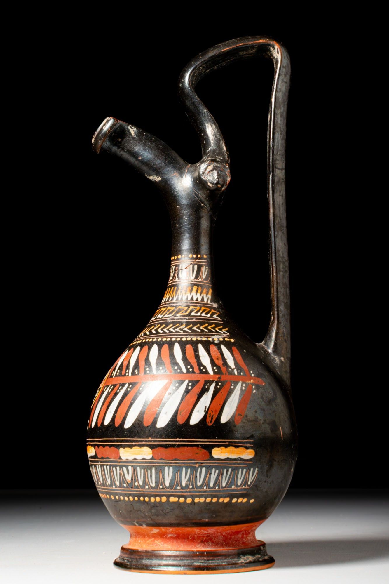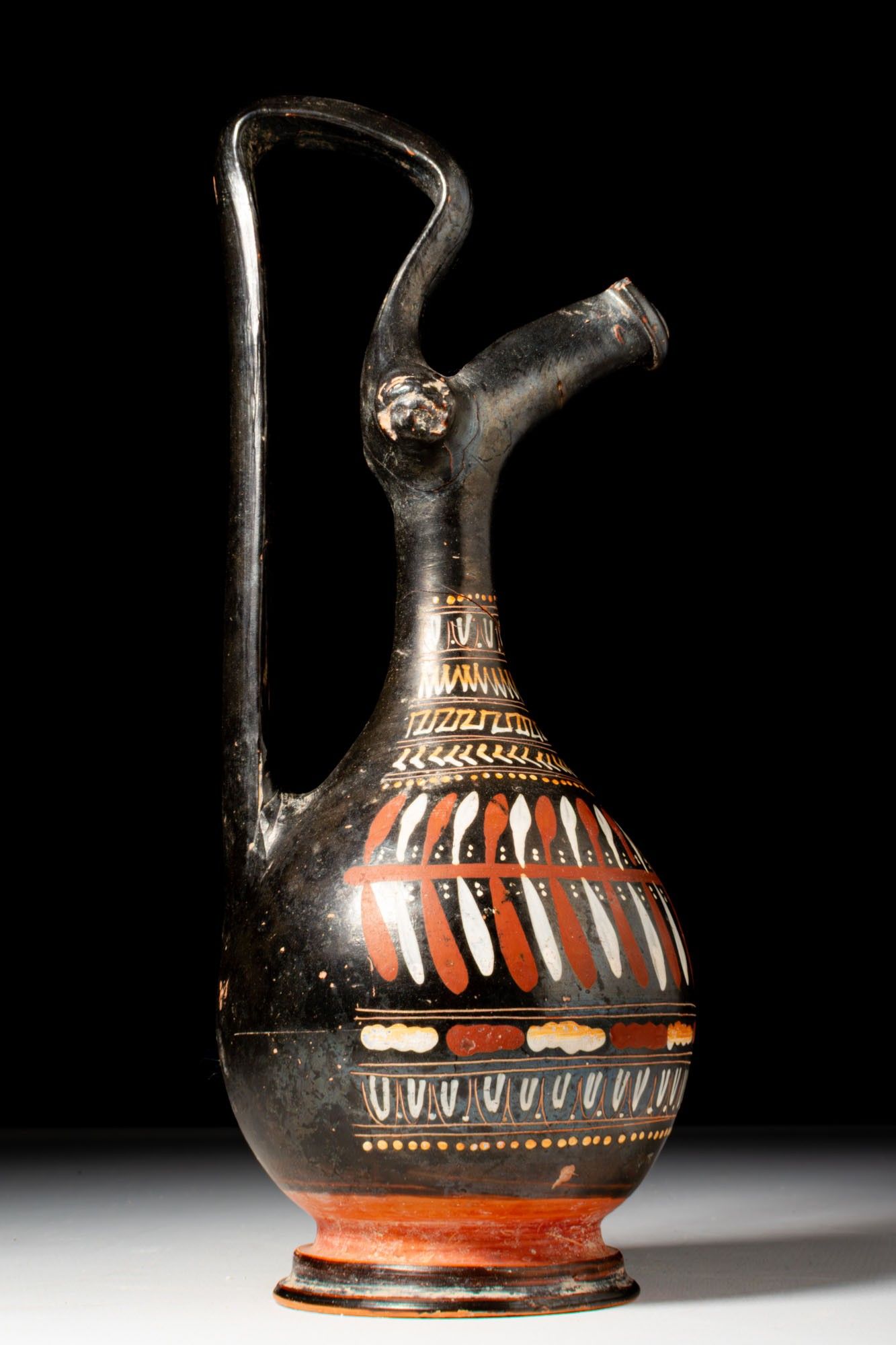 A prochous with a piriform body set on a moulded ring foot. A tall neck ends in a long spout with a rolled rim. A high-arched strap handle rises from the shoulder to above the lip, with small lion-mask appliqués at the sides. Decoration consists of parallel bands in added white, yellow, and red. Around the neck run ovolo, then zigzags, a meander, chevrons, and a dotted line, each sequence divided by double fillets. The main register presents a central rosette flanked on both sides by a wreath. Below runs a band of alternating motifs between fillets, followed by a frieze of ovolo within narrow panels and a further dotted line towards the lower body.