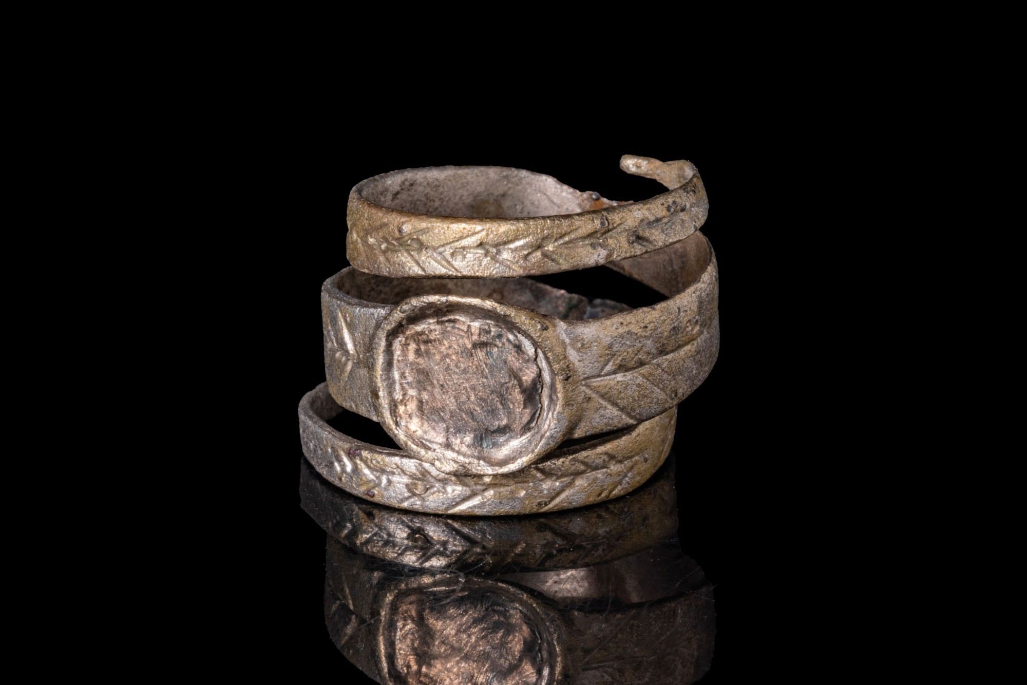 A silver snake ring formed from a tapering flat band wound in three coils. The exterior is decorated with opposed oblique strokes within narrow borders. The front is set with an integral circular bezel.