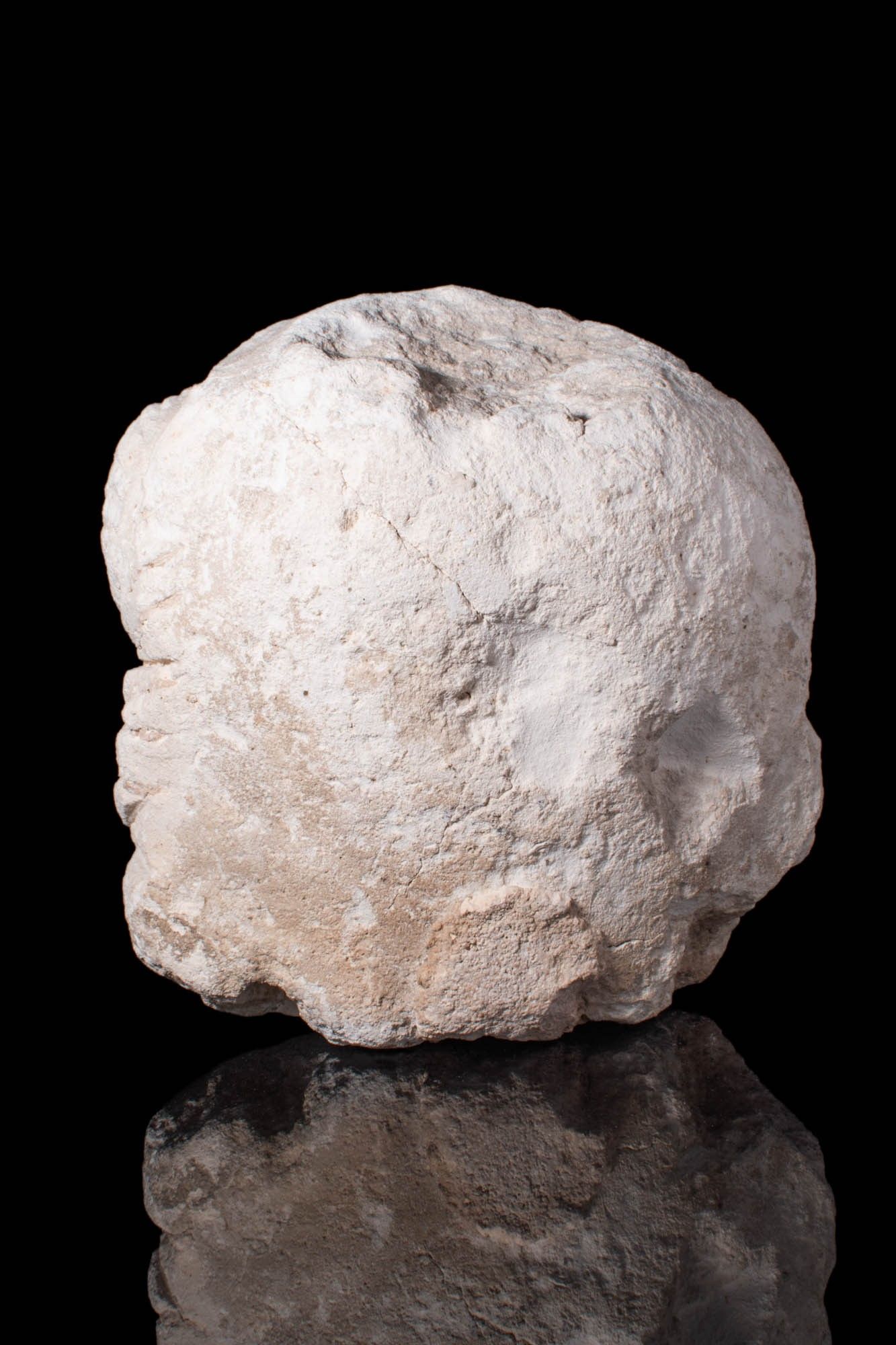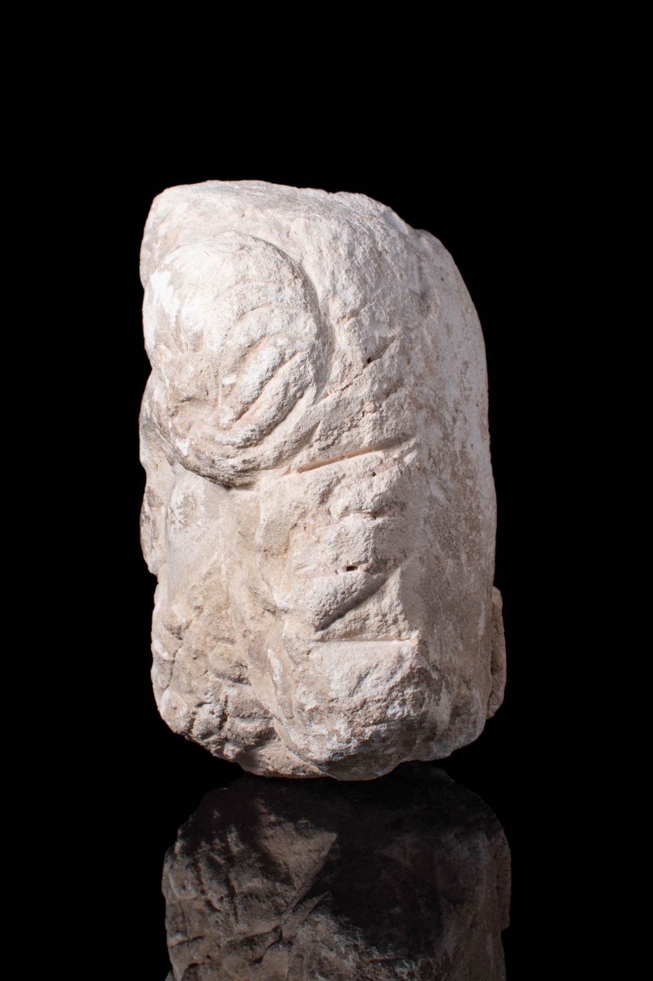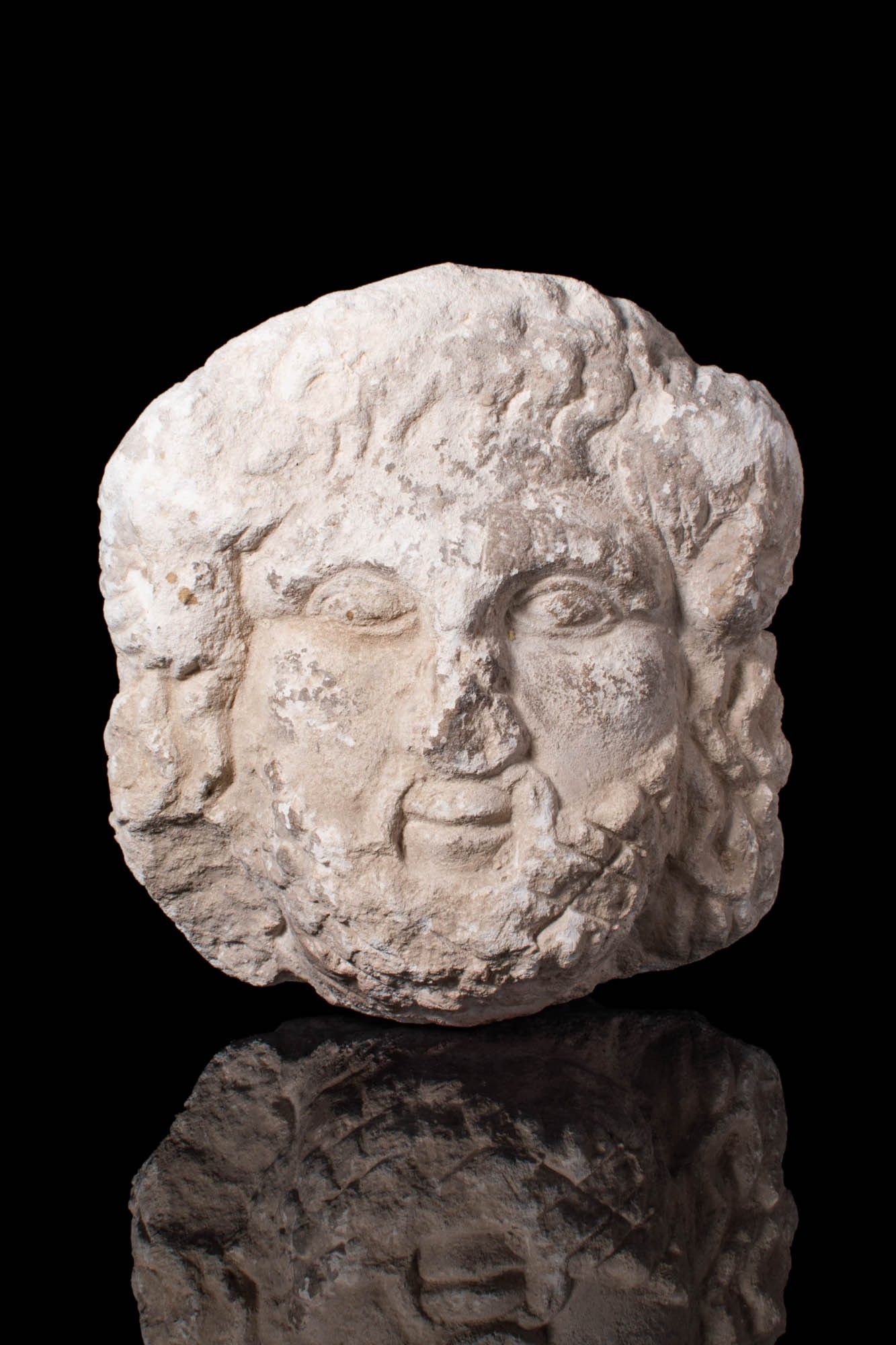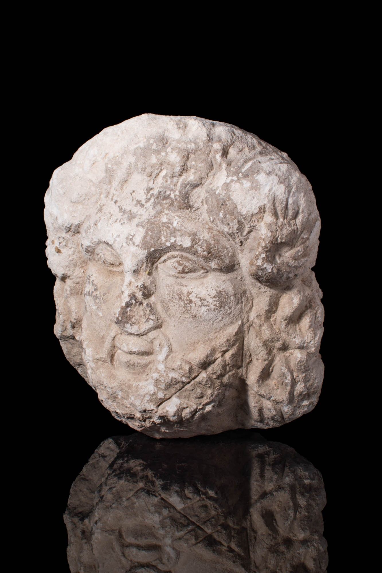 Ca. AD 100 - 200. A Romano-Egyptian limestone high relief of Zeus-Ammon featuring the distinct ram horns of Ammon curled around the god's thick locks of hair. The face shows a calm expression, with delicate facial features and a short, curly beard. For similar see: MET Museum Accession Number: 2012.22; Sotheby's, Ancient Sculpture and Works of Art, Lot. 169, 6 July 2021. Size: 190mm x 190mm; Weight: 3.7kg Provenance: Private London collection, acquired on the European art market pre 2000. This item has been cleared against the Art Loss Register database and comes with a confirmation letter. This item has been cleared against the Art Loss Register database and comes with a confirmation letter.