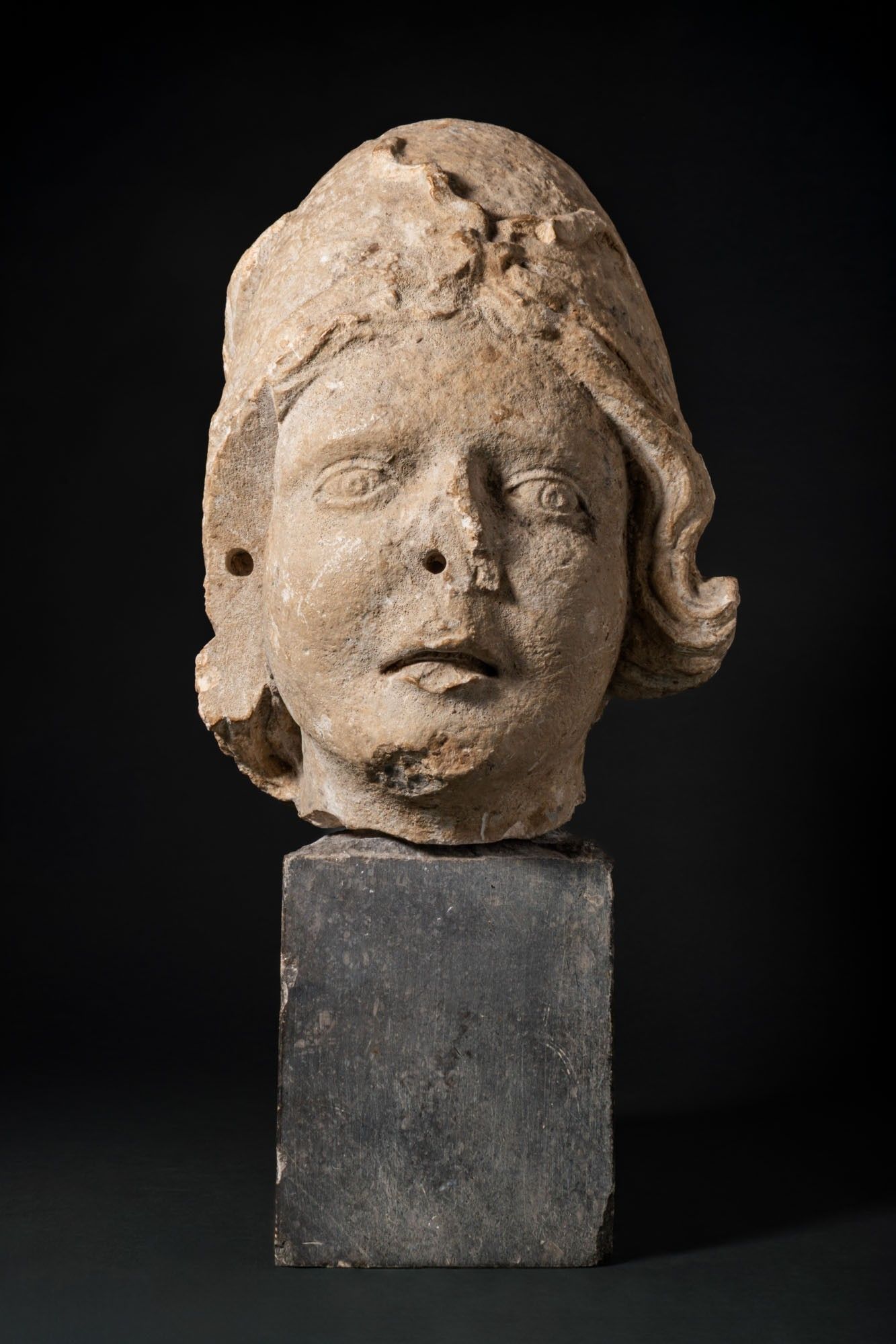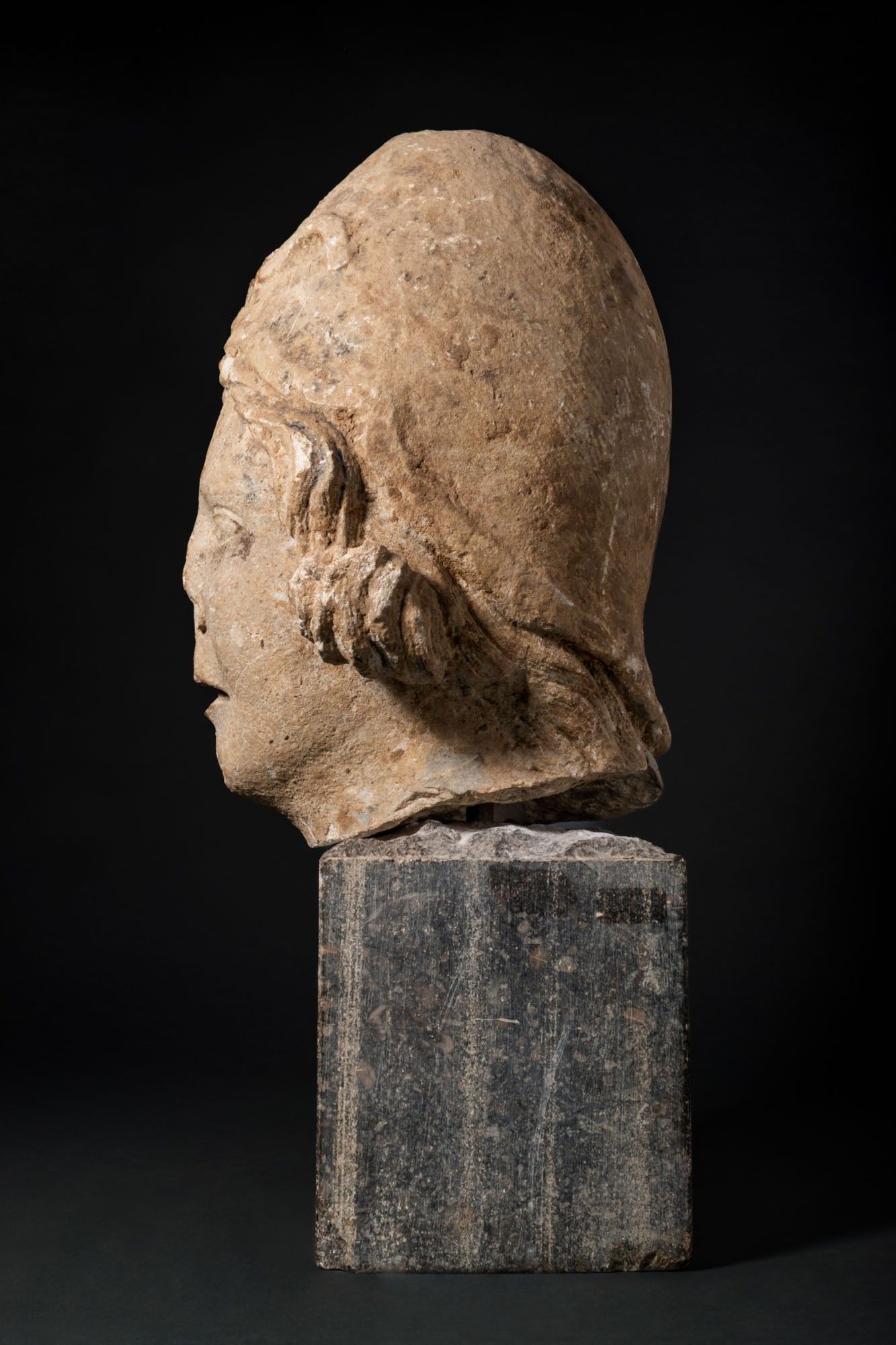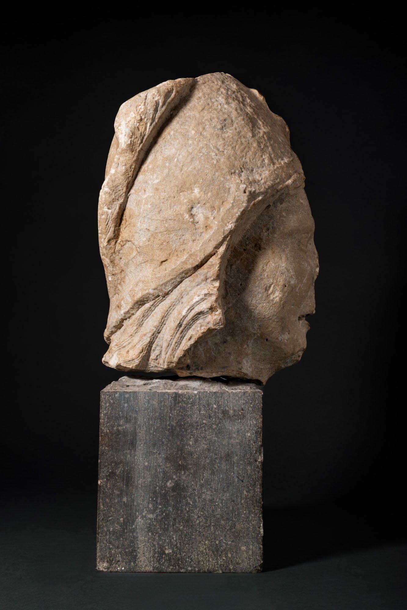 Ca. AD 100 - 200. A marble head of Pollux wearing a close-fitting pileus, the oval face with softly modelled lids over almond-shaped eyes, straight nose, and parted lips. Short, wavy locks emerge below the cap and curl in front of the ears. Mounted. For similar see: Christie's, Live Auction 4925, Antiquities, Lot 211; Museo Archeologico di Napoli, Mann, Inv. Nos. 131209 / 230872. Size: 450mm x 220mm; Weight: 17.7g Provenance: Private UK collection; From an old British collection formed in the 1980s; This piece is accompanied by a historical report from Alessandro Neri, an international Cultural Heritage expert based in Florence, Italy. This item has been cleared against the Art Loss Register database and comes with a confirmation letter.