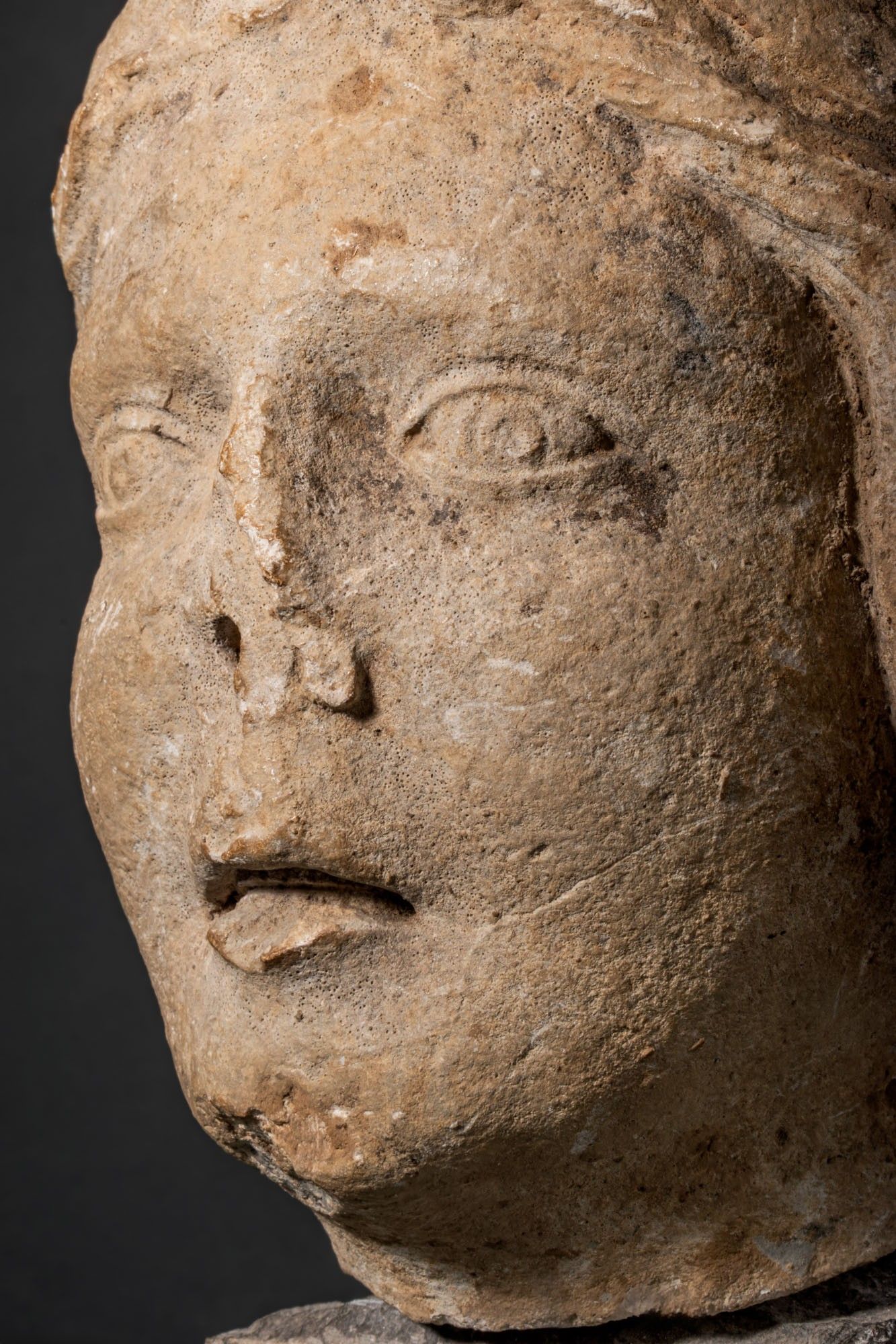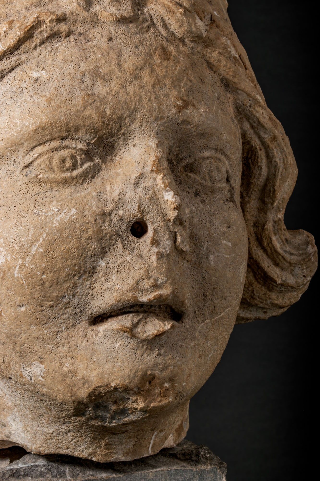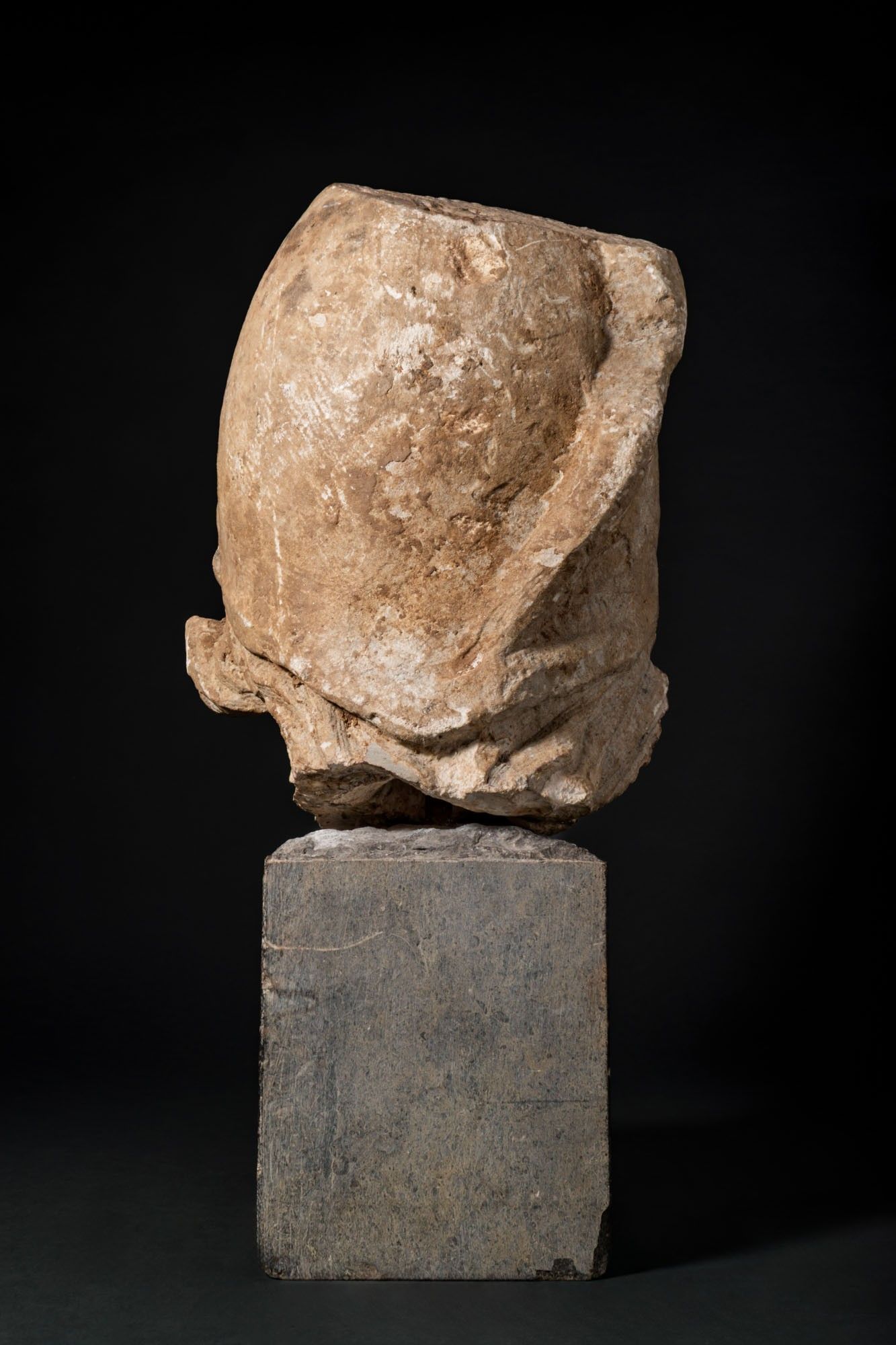 Ca. AD 100 - 200. A marble head of Pollux wearing a close-fitting pileus, the oval face with softly modelled lids over almond-shaped eyes, straight nose, and parted lips. Short, wavy locks emerge below the cap and curl in front of the ears. Mounted. For similar see: Christie's, Live Auction 4925, Antiquities, Lot 211; Museo Archeologico di Napoli, Mann, Inv. Nos. 131209 / 230872. Size: 450mm x 220mm; Weight: 17.7g Provenance: Private UK collection; From an old British collection formed in the 1980s; This piece is accompanied by a historical report from Alessandro Neri, an international Cultural Heritage expert based in Florence, Italy. This item has been cleared against the Art Loss Register database and comes with a confirmation letter.