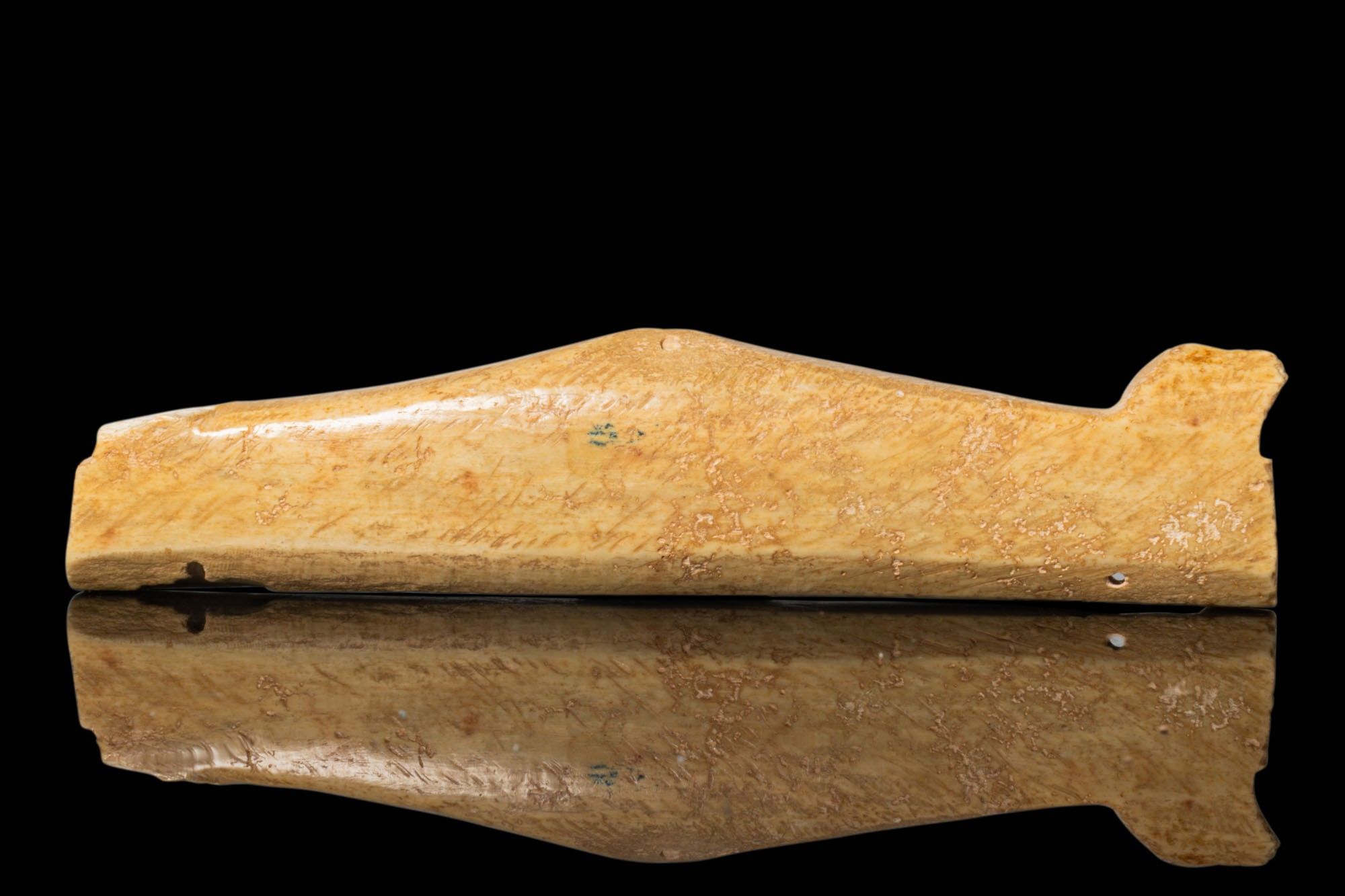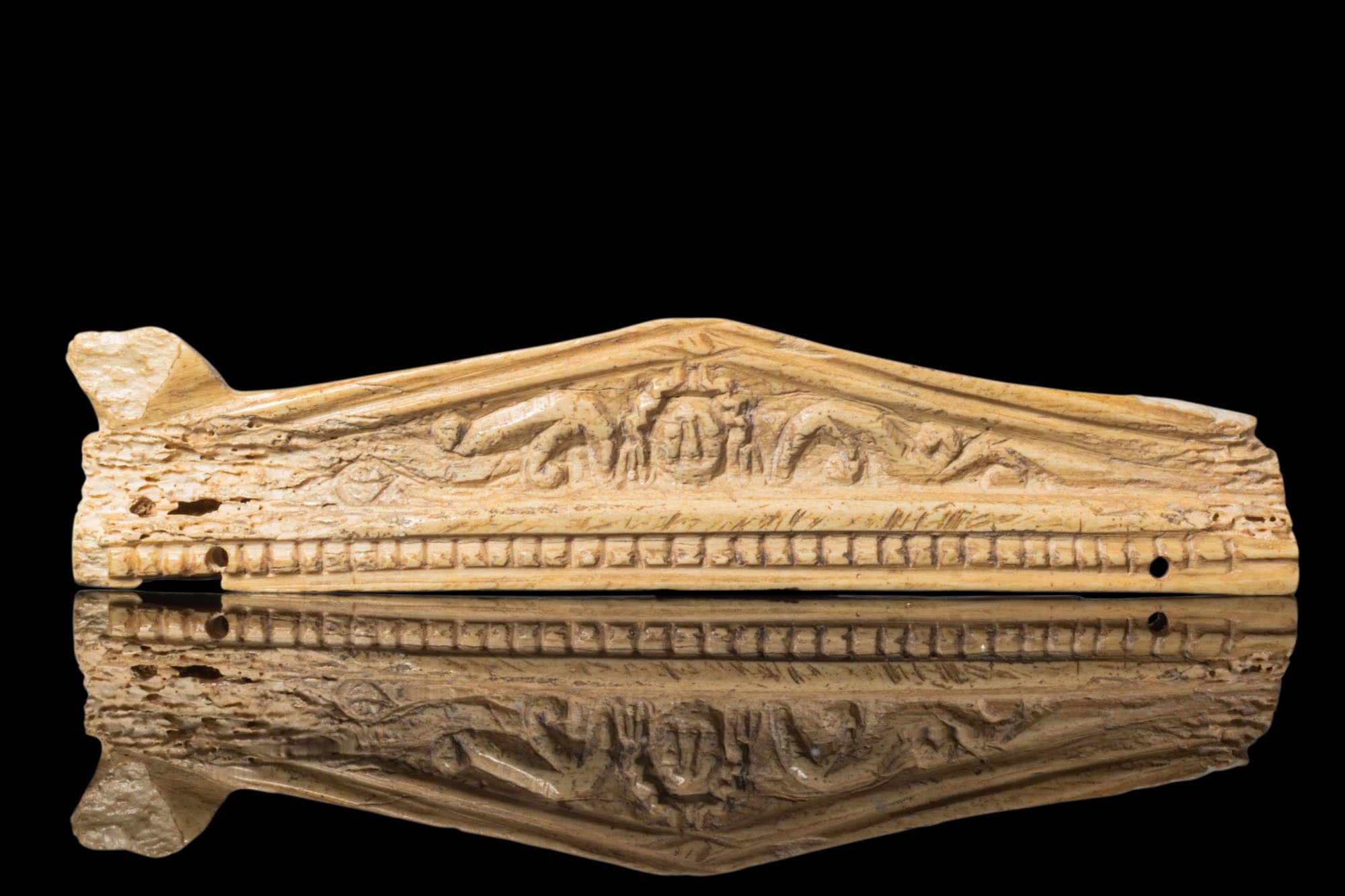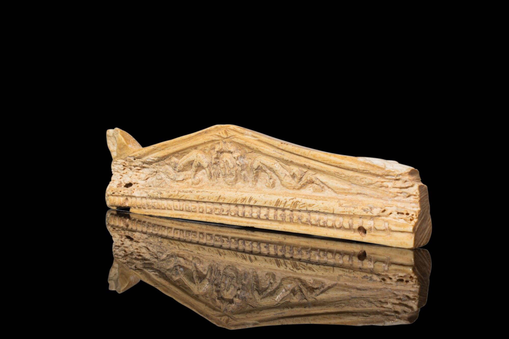 ROMAN BONE CINERARY URN DECORATED PEDIMENT.