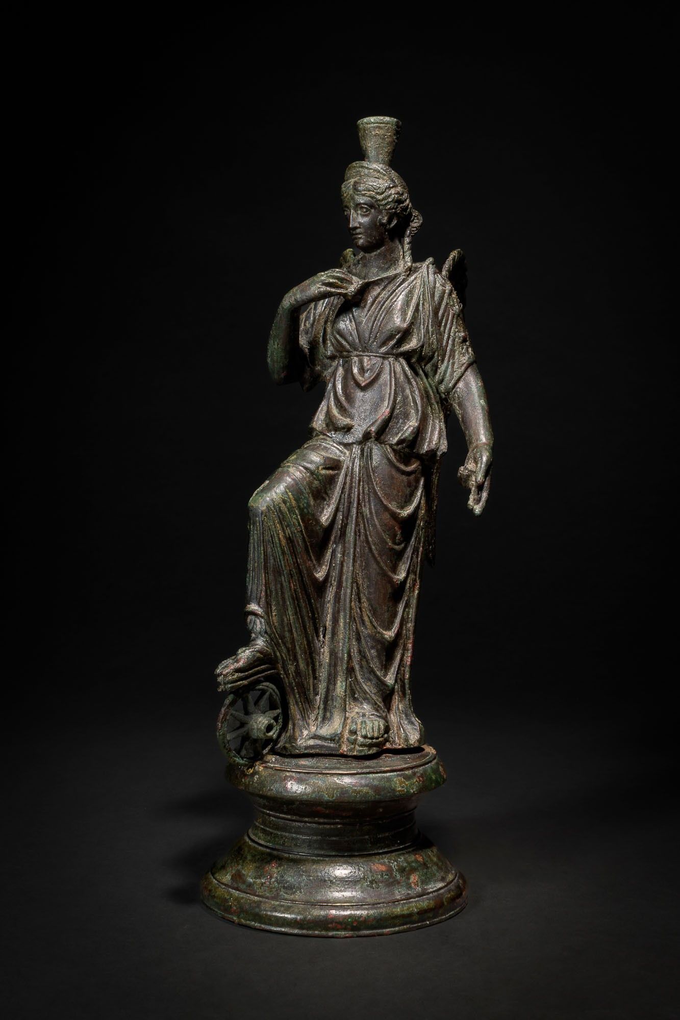 A bronze statuette of Fortuna-Isis with a tall modius and feathered wings. She stands with one foot set upon a small spoked wheel, wearing a long chiton and a himation gathered at the waist. Right hand raised to the breast, left arm lowered. Hair centrally parted. The figure is set on an integral base.