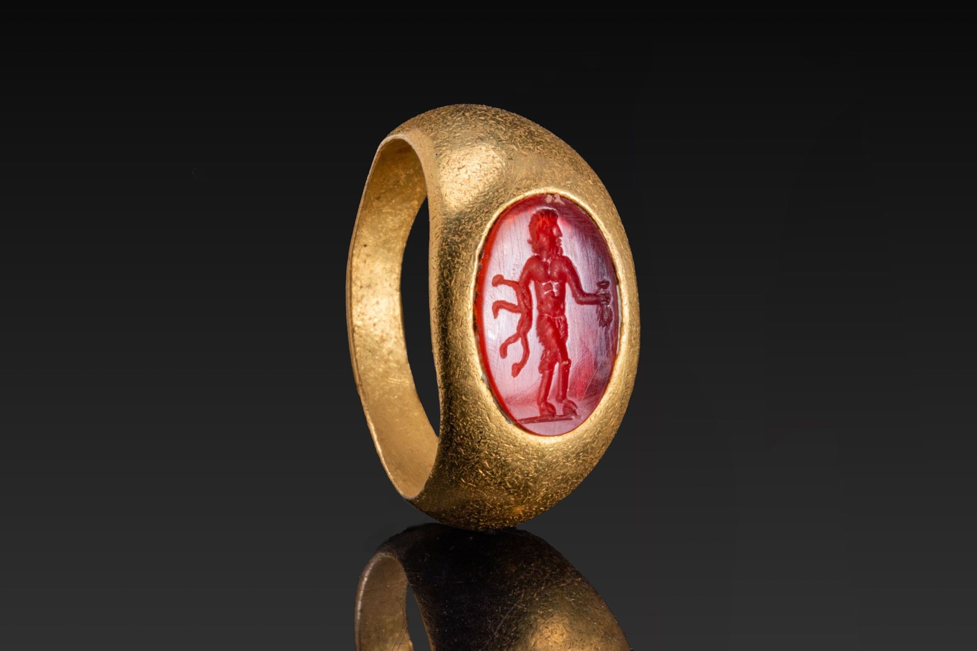A carnelian intaglio engraved with a standing satyr in profile, holding a money bag in his outstretched left hand, with four serpents coiling around his right arm. It is set in an oval gold bezel that broadens from the hoop into a solid, slightly domed setting.