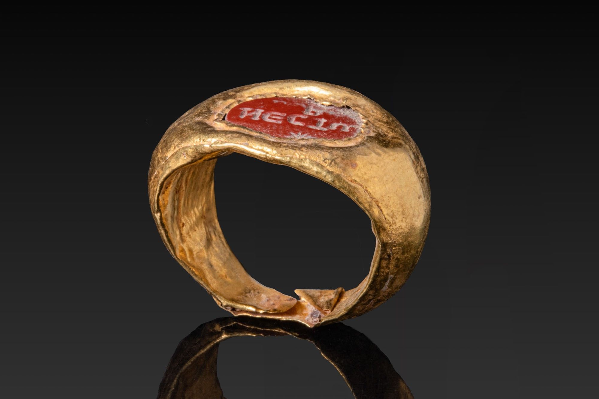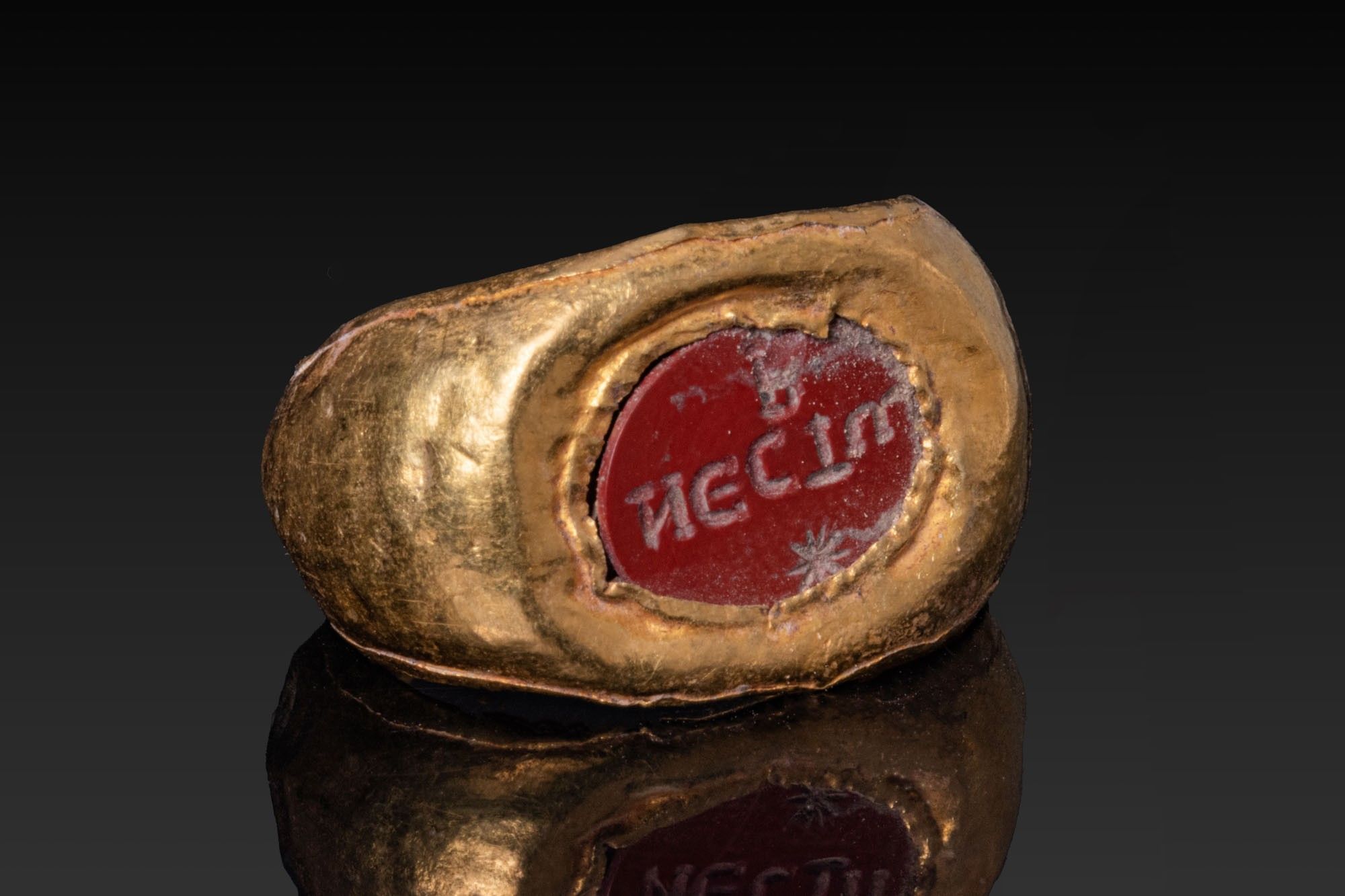 ROMAN HIGH KARAT GOLD RING WITH RED JASPER INTAGLIO WITH INSCRIPTION 'NECIM'.