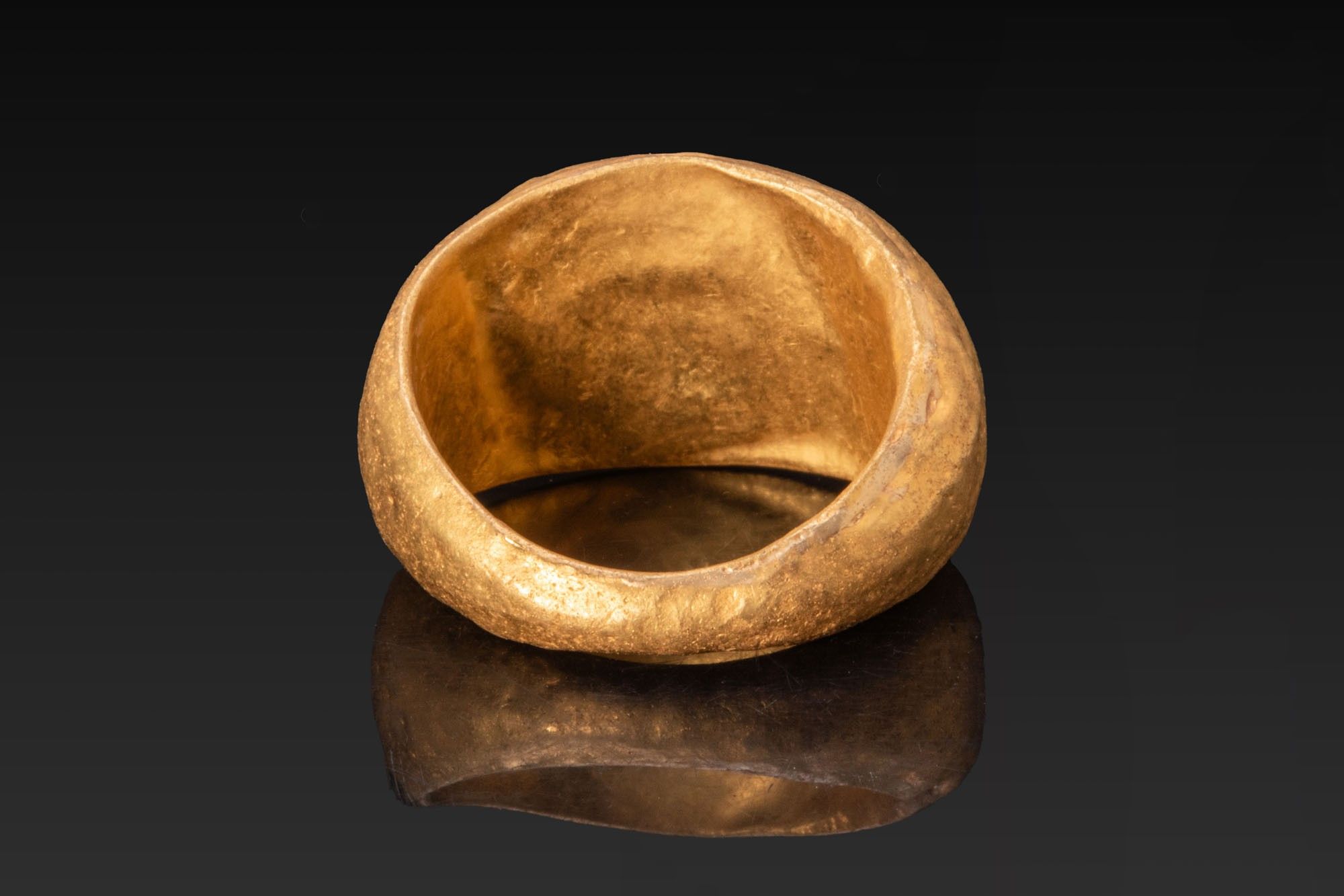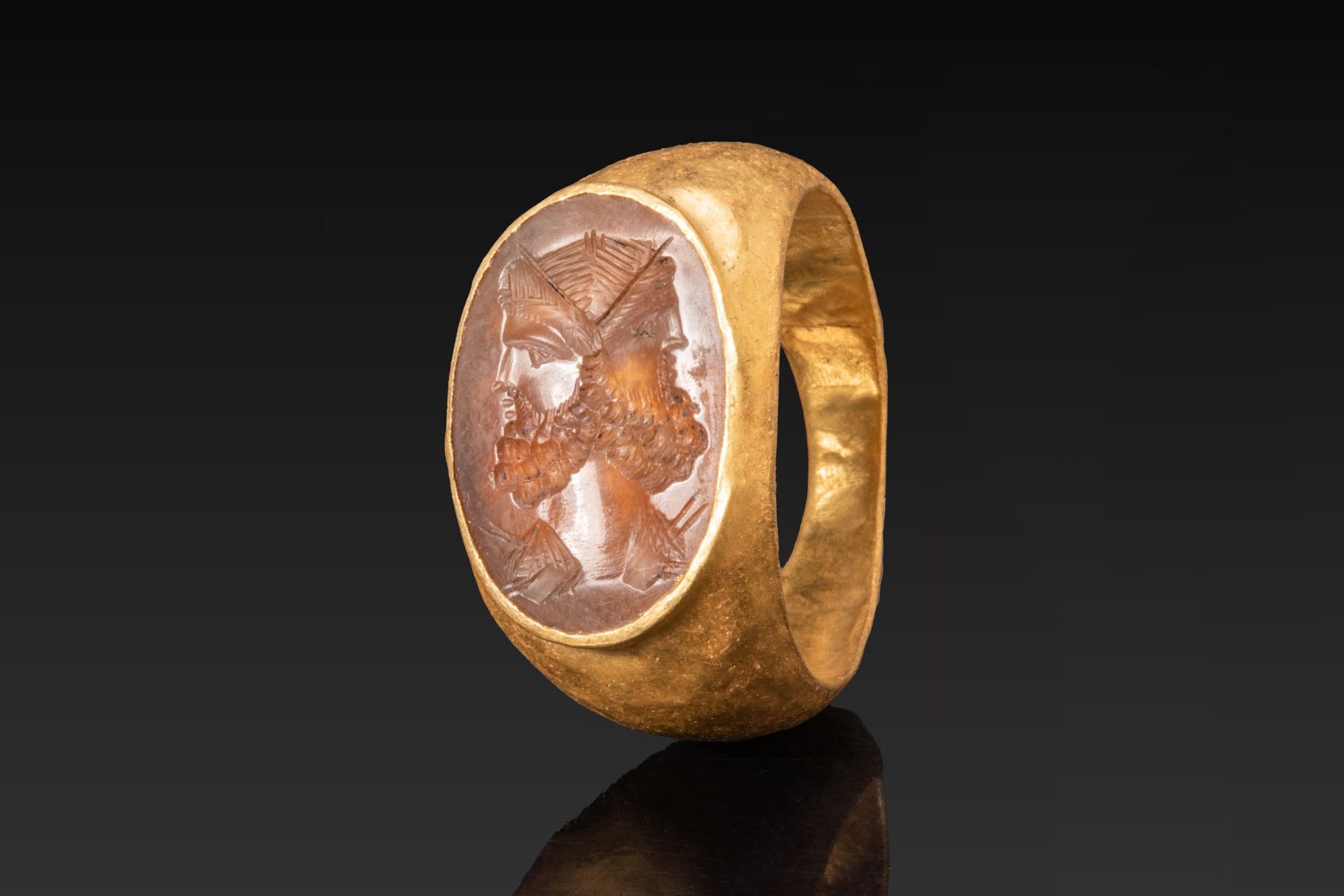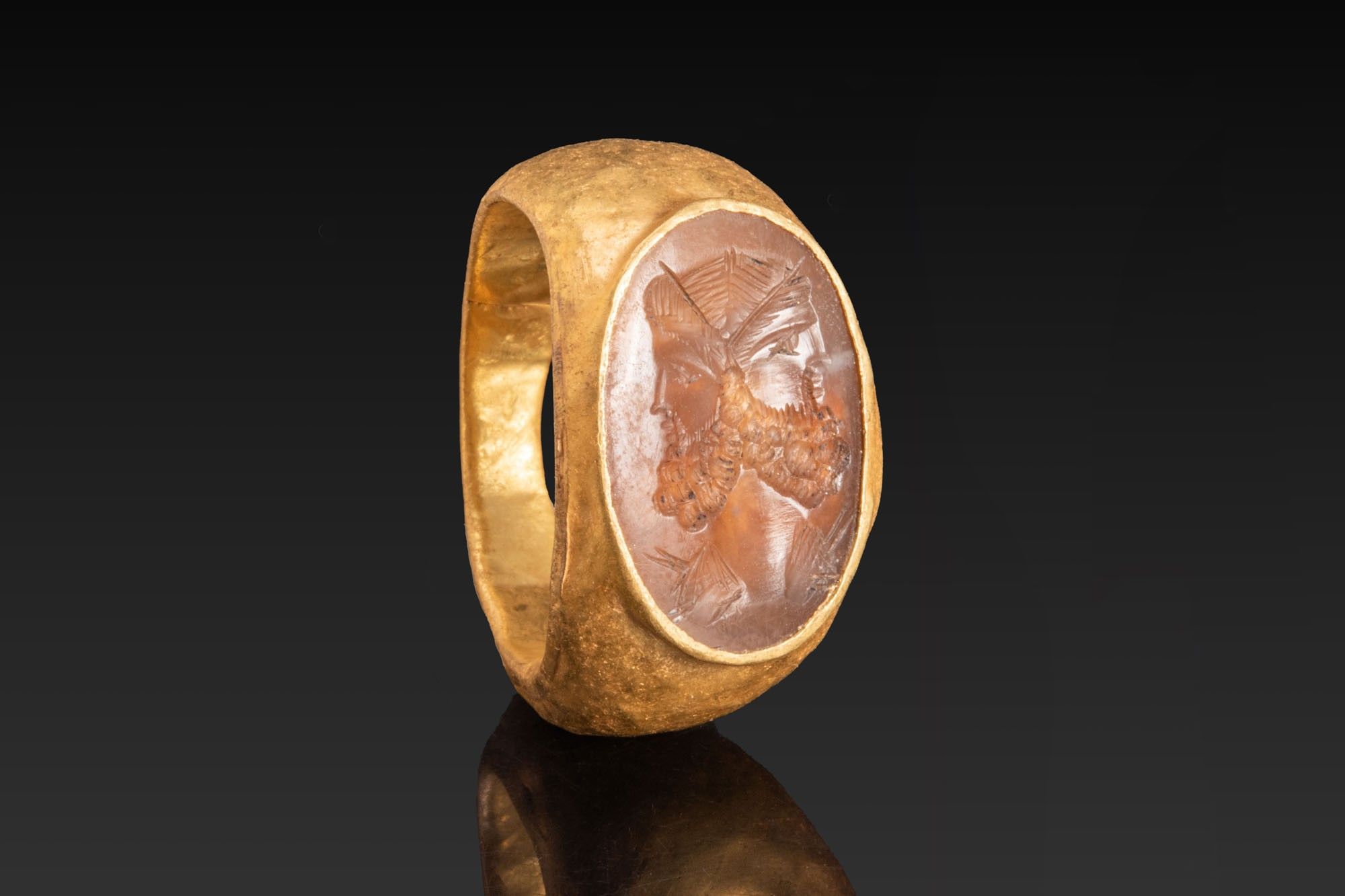ROMAN CHALCEDONY INTAGLIO DEPICTING JANUS IN HIGH KARAT GOLD RING.
