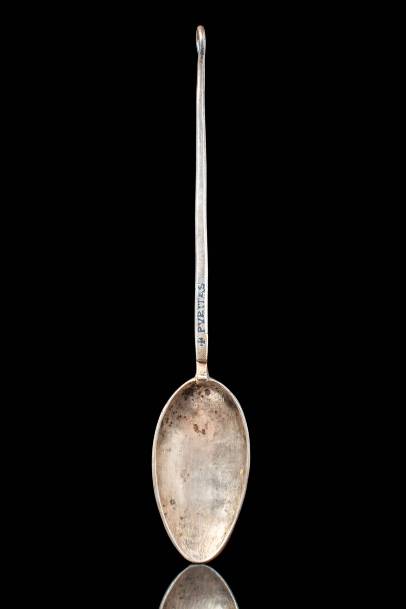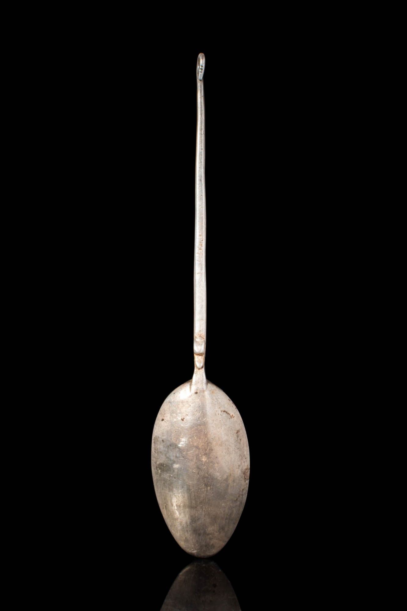 Ca. AD 550 - 650. A silver spoon with an elongated bowl and a slender, slightly tapering handle that terminates in a rounded hook. A decorative scroll element connects the bowl and handle. The upper section of the handle bears the inscription 'PURITAS'. For similar see: The Metropolitan Museum of Art, Object Number: 2005.39. Size: 160mm x 30mm; Weight: 24.90g Provenance: Private London collection; Ex. Borowski collection, Switzerland, 1980s-1990s. This item has been cleared against the Art Loss Register database and comes with a confirmation letter.