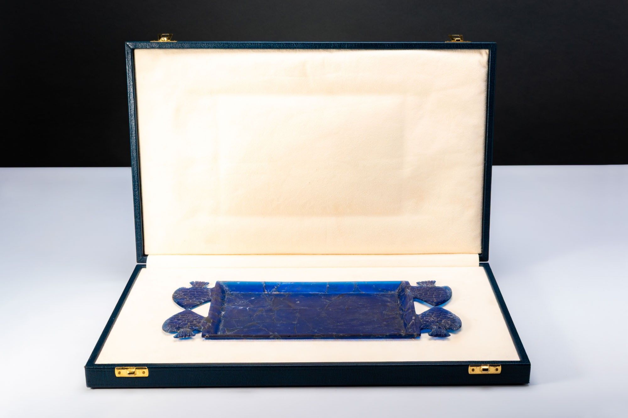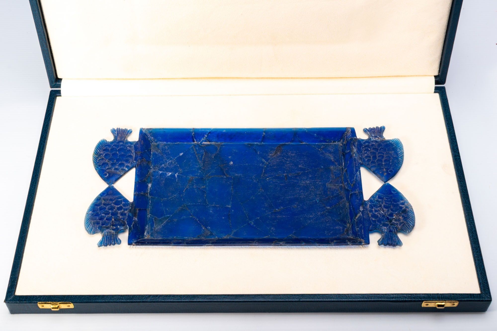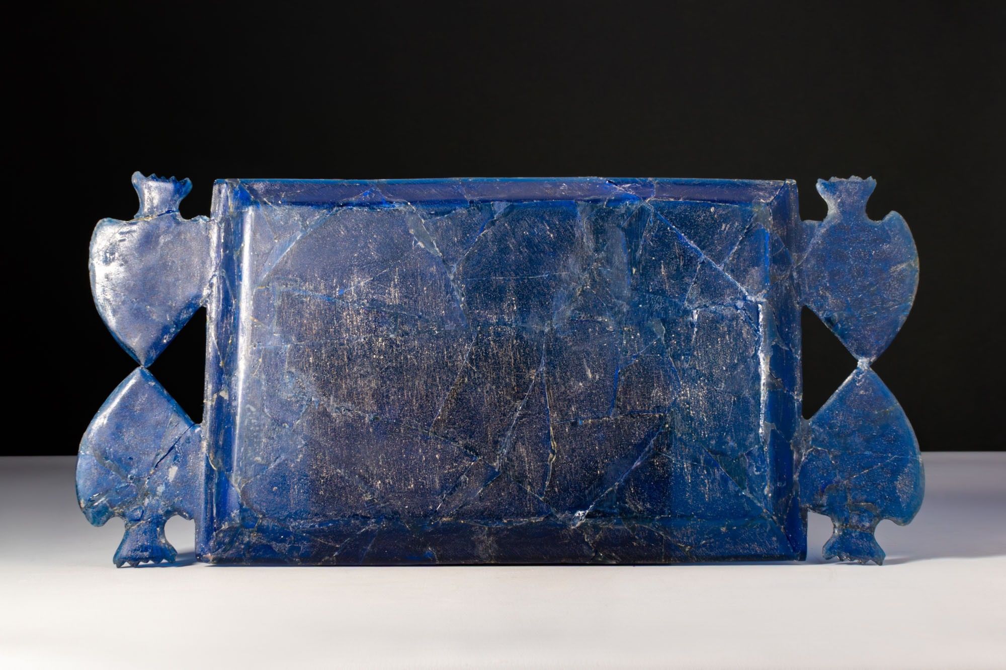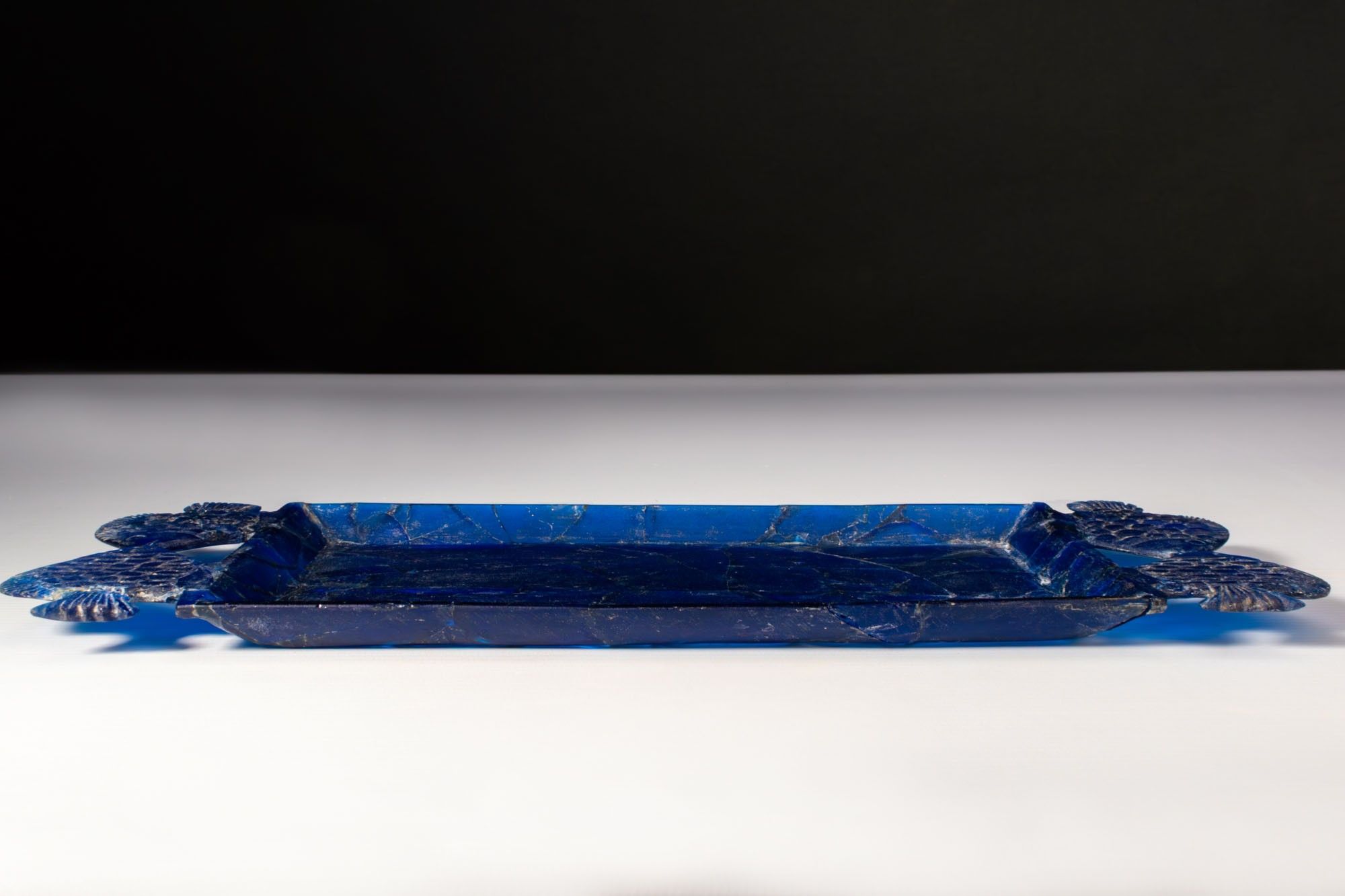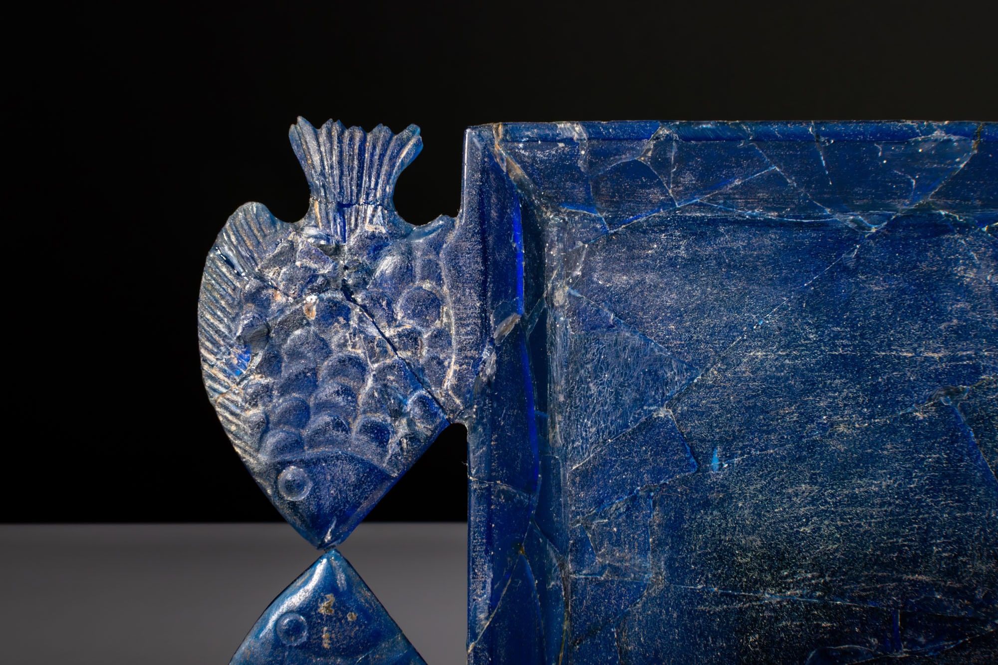 Roman Period, Ca. 30 BC - AD 200. A cobalt blue glass tray with pairs of fish forming the terminals at each short end, rectangular in plan with a flat recessed well and gently splayed walls bordered by a narrow rim. The fish are rendered in profile with overlapping scales, notched fins and stepped tails. Comes in the presentation box shown. For similar see: The Metropolitan Museum of Art, Object Number: 90.6.24 (Fish). Size: 150mm x 300mm; Weight: 320g Provenance: Private UK collection; acquired on the London art market; formerly with R. Unger, Parthenon gallery, 1990s. This piece is accompanied by a historical report from Alessandro Neri, an international Cultural Heritage expert based in Florence, Italy. This piece is accompanied by a historical and authentication report from Manfredi Maria Vaccari, archaeologist and antiquities expert of Chimera Heritage Consultants. This item has been cleared against the Art Loss Register database and comes with a confirmation letter.