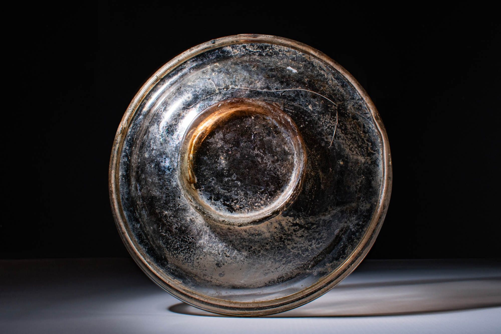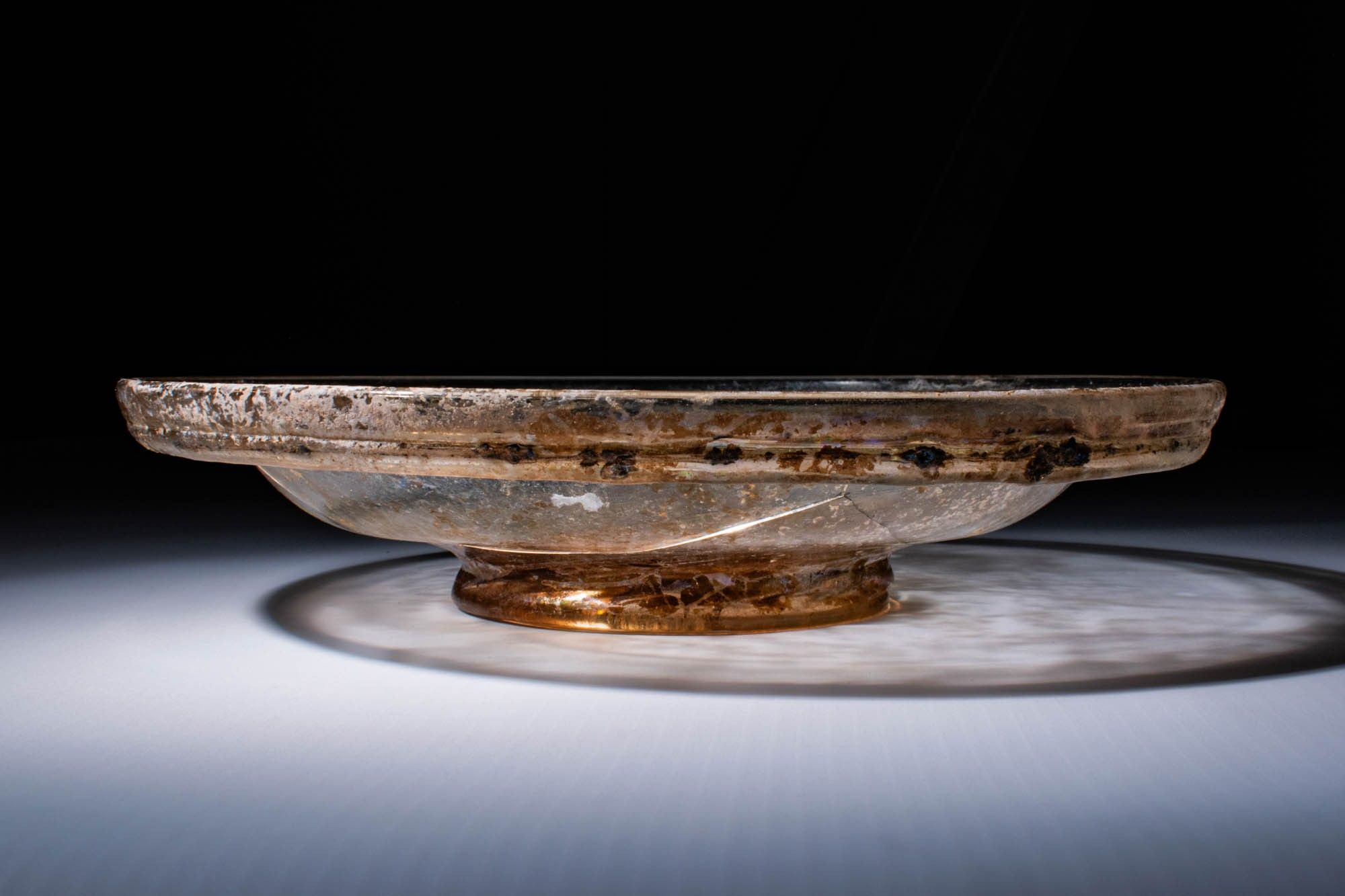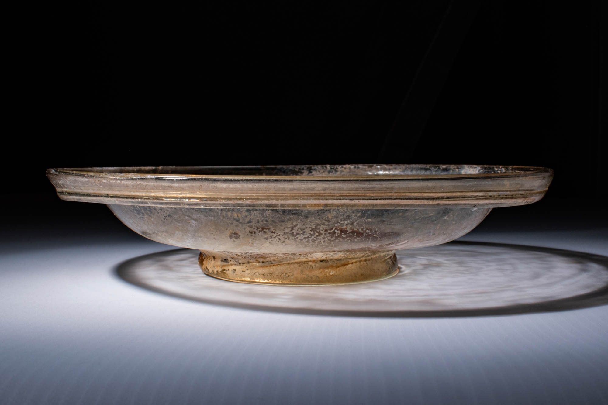 Ca. AD 1 - 200. A shallow glass plate with a wide, moulded rim and a concave interior. The body is smooth with concentric ridges along the inner base. A low ring foot supports the structure, elevating the plate slightly above the surface. The underside of the base exhibits a circular pontil mark at the centre. Size: 190mm x 40mm; Weight: 170g Provenance: Prince collection, 1990s-2014; Ex. David Ghezelbash Archaeology. This item has been cleared against the Art Loss Register database and comes with a confirmation letter.