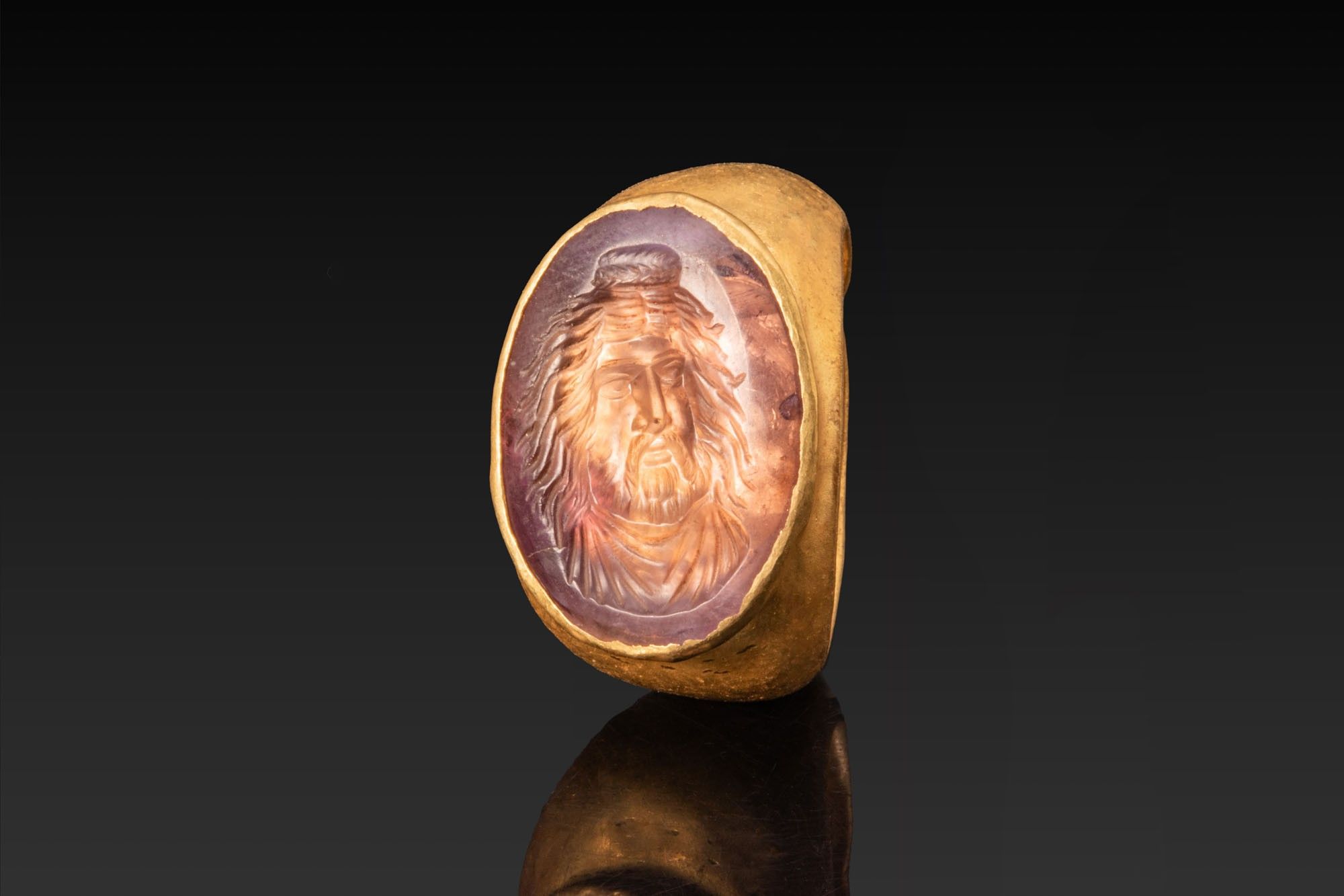 LARGE ROMAN GOLD RING WITH AMETHYST INTAGLIO DEPICTING SERAPIS.