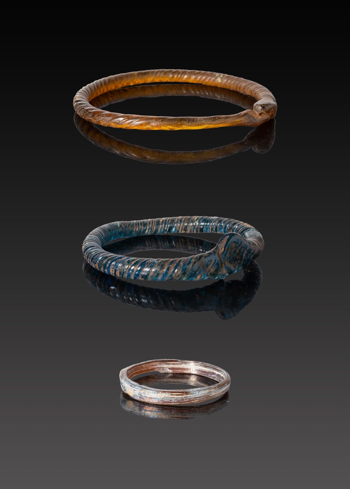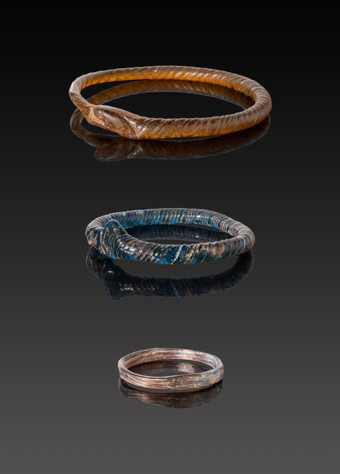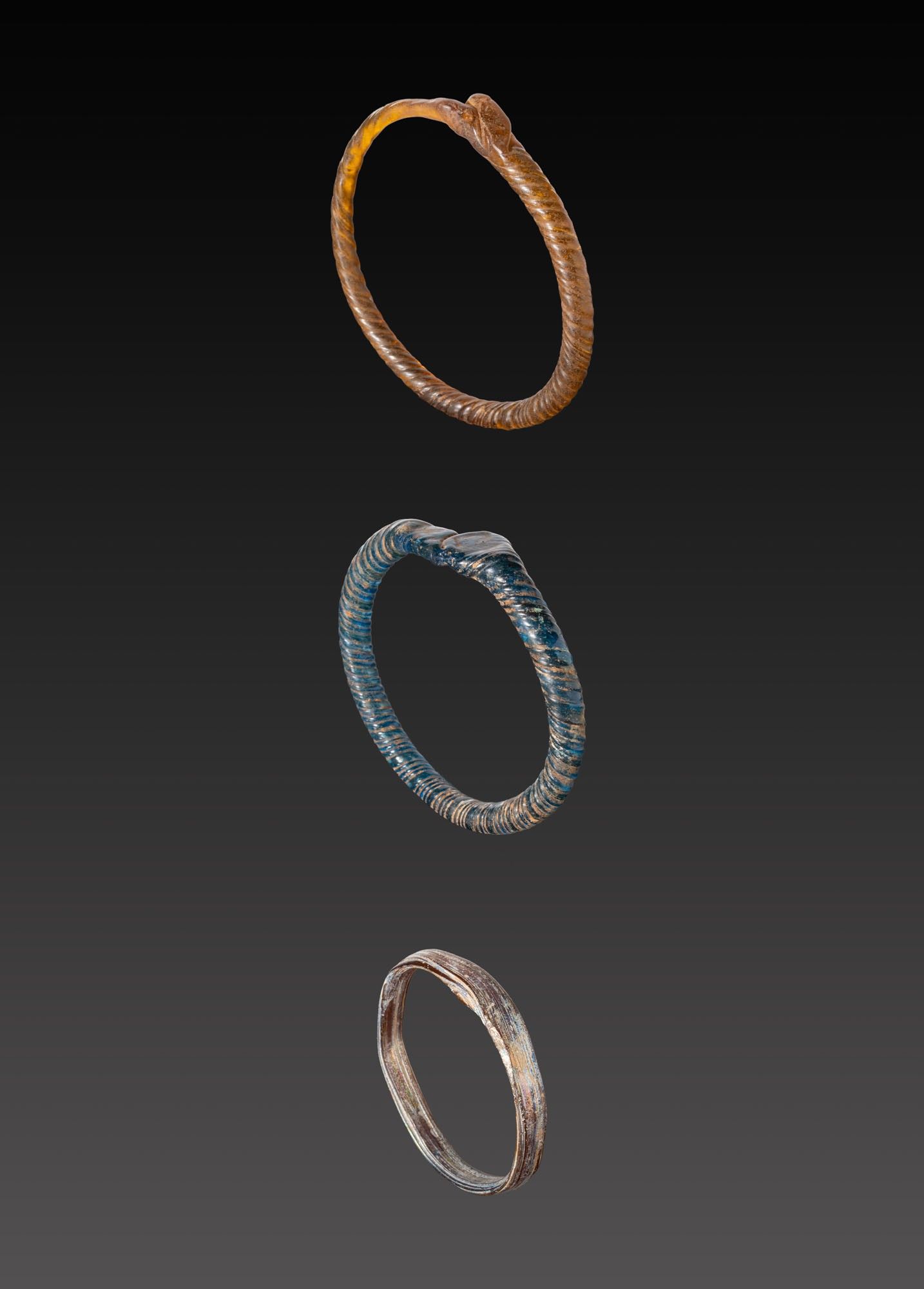A collection of three glass bracelets, including, from top to bottom: a honey-brown annular bracelet formed from a wound rod with pronounced spiral ribbing and an overlapping fused join; a dark cobalt example of heavier profile with close-set oblique ribs and a prominent lapped terminal; and a slender ring of flattened section.