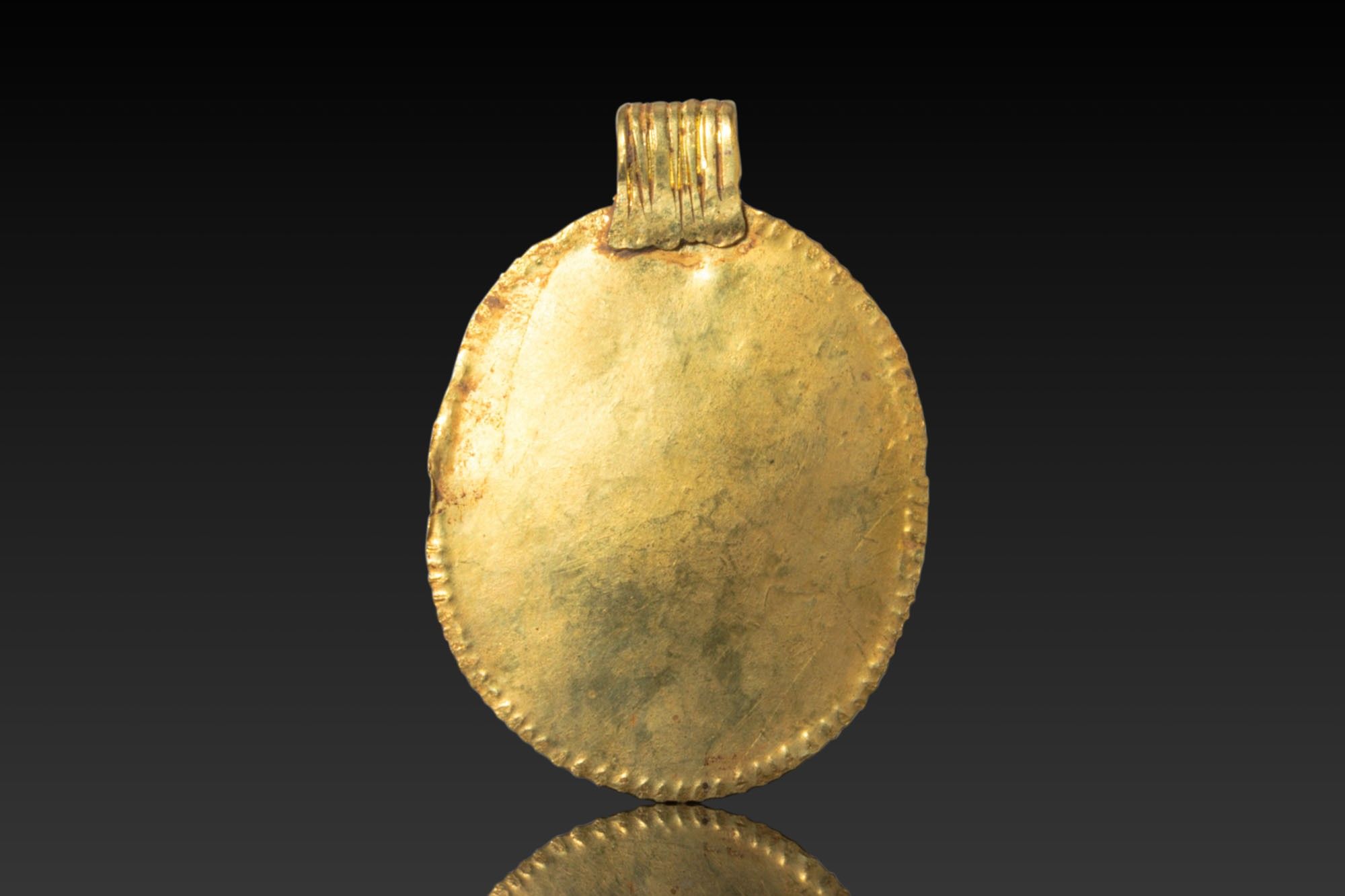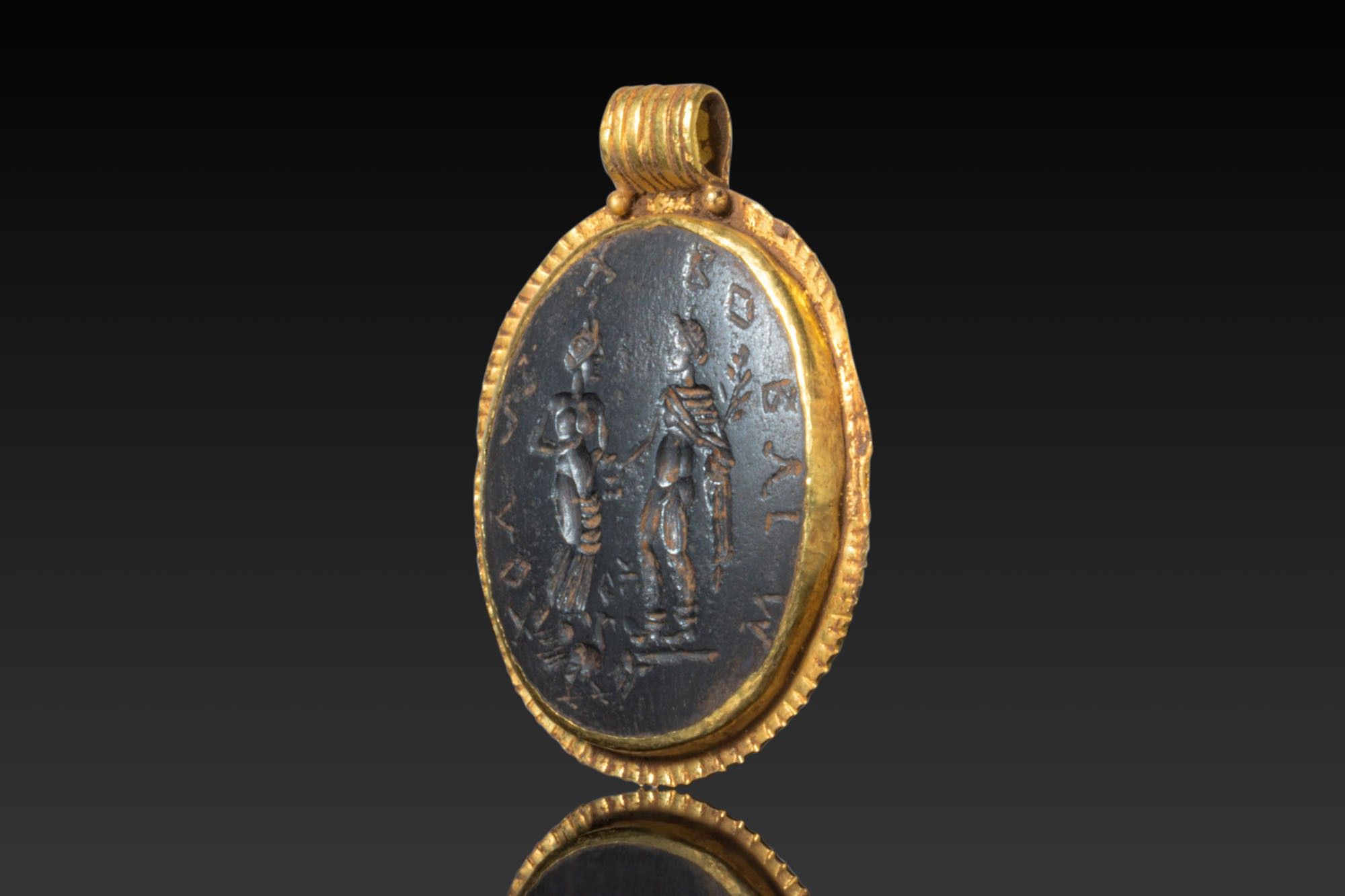 A black stone magical intaglio engraved with Venus and Mercury standing confronted, a rooster below; the field encircled by a retrograde inscription. Set as a pendant in an oval gold mount with a ribbed cylindrical suspension loop.