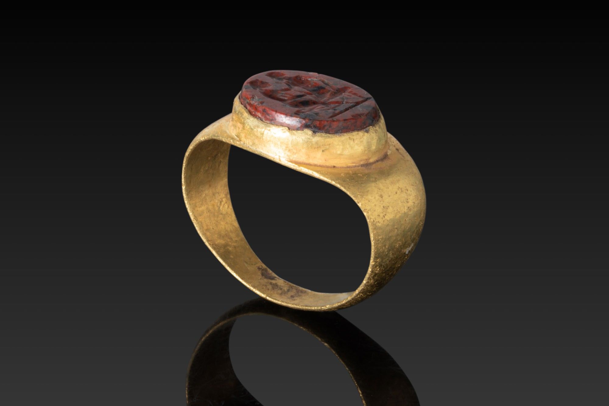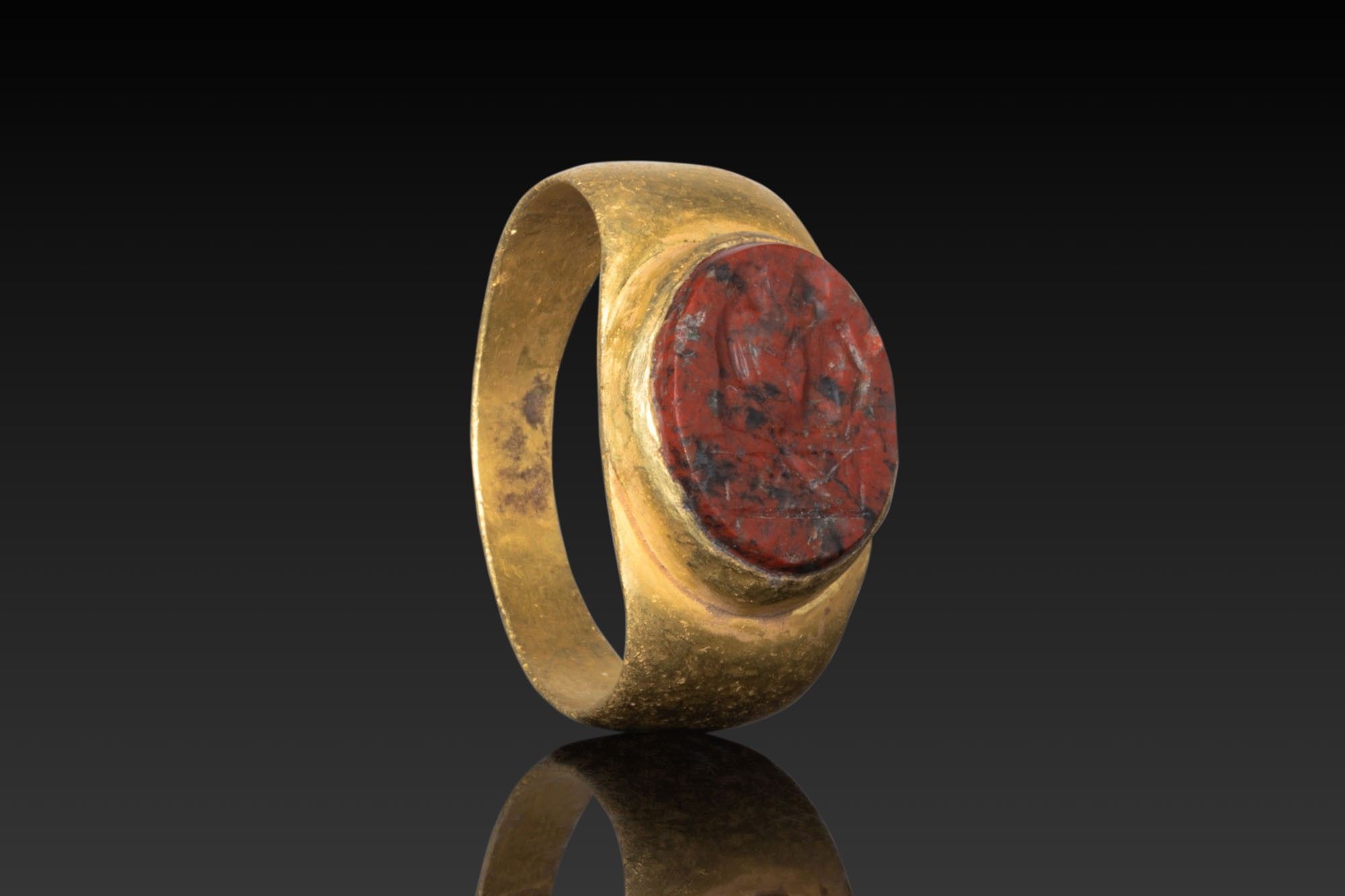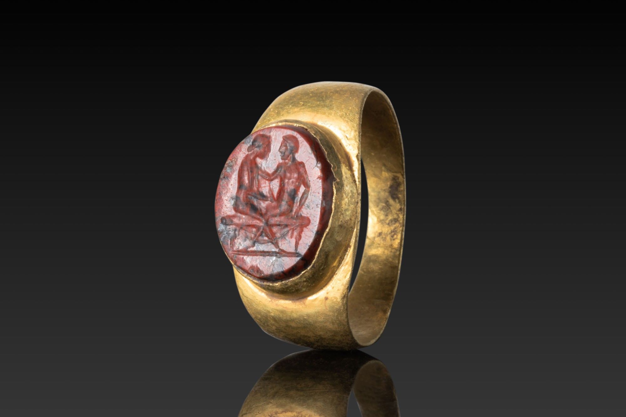A red jasper intaglio engraved with two nude figures, seated face to face with bent legs on a low support. Set in a gold ring with an oval cell on a flat-topped bezel plate, the broad shoulders tapering to a narrow flat-section hoop.