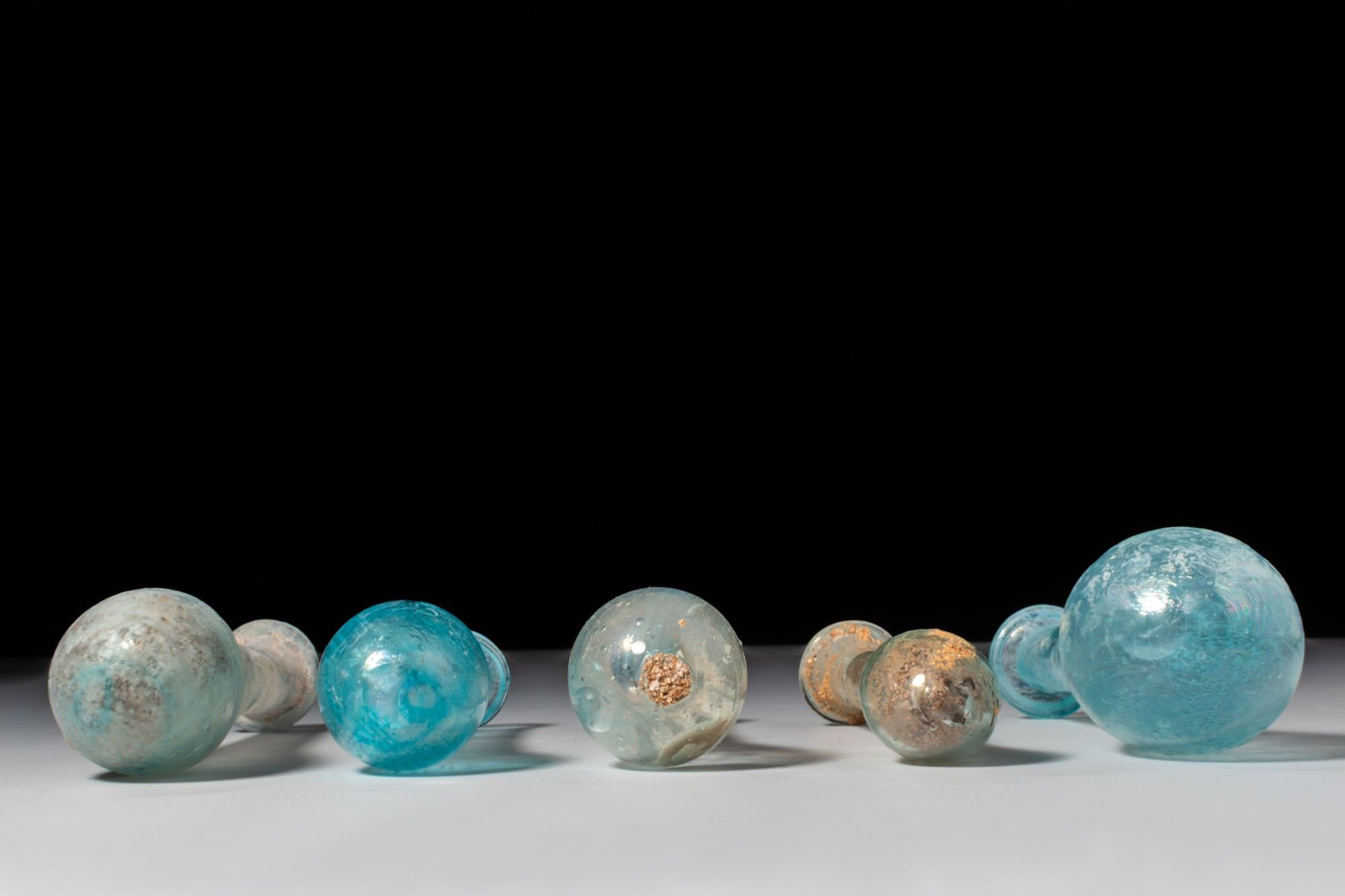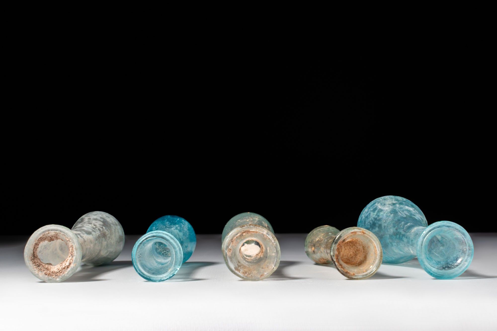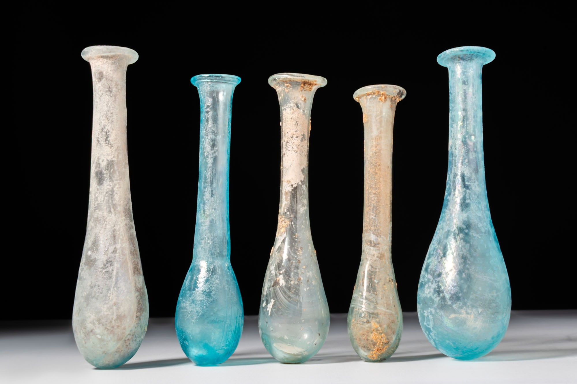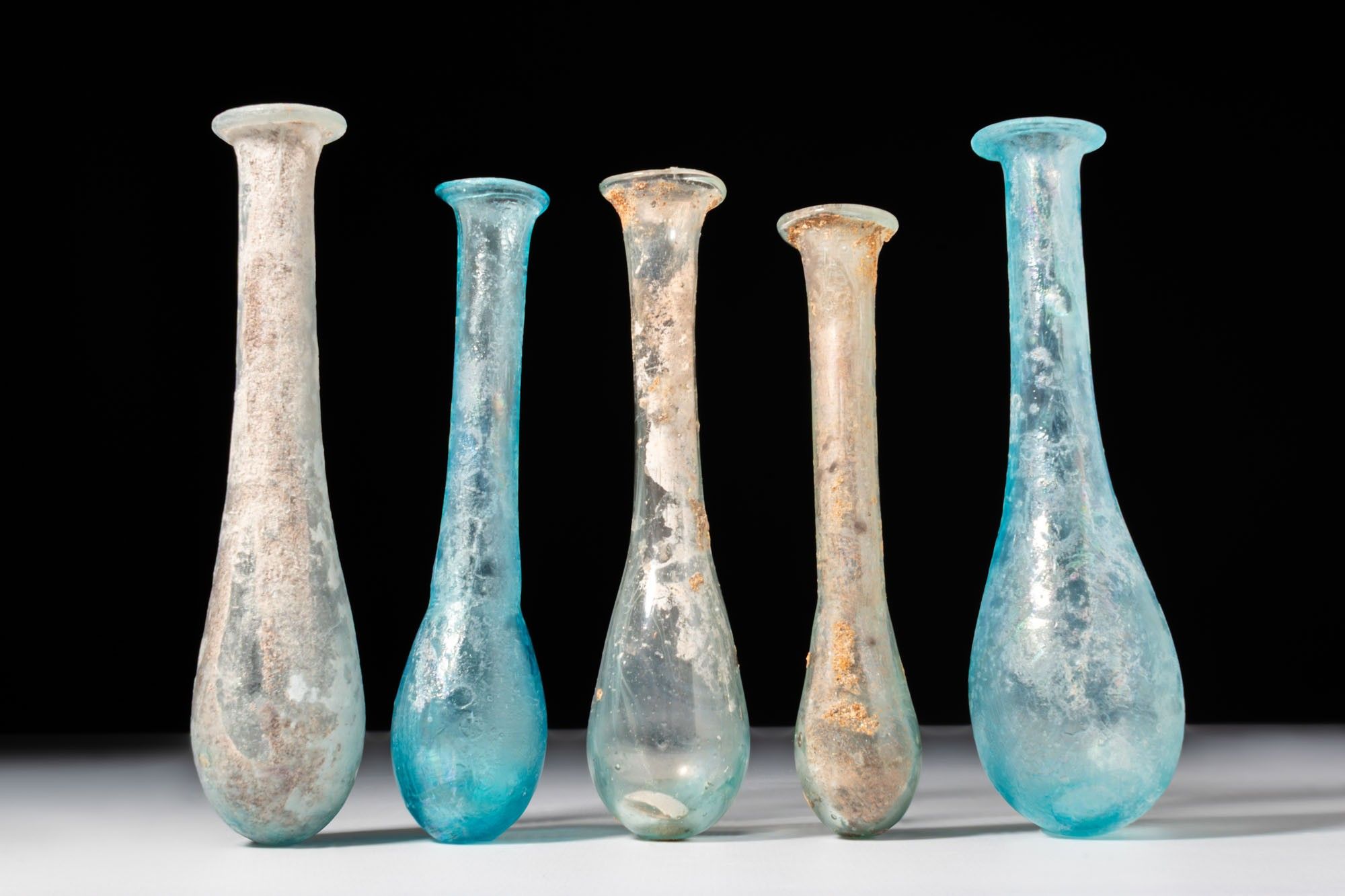 A collection of five glass unguentaria, each drop-shaped with an elongated ovoid lower body, a tall drawn tubular neck, and a flaring mouth with an out-turned rim.