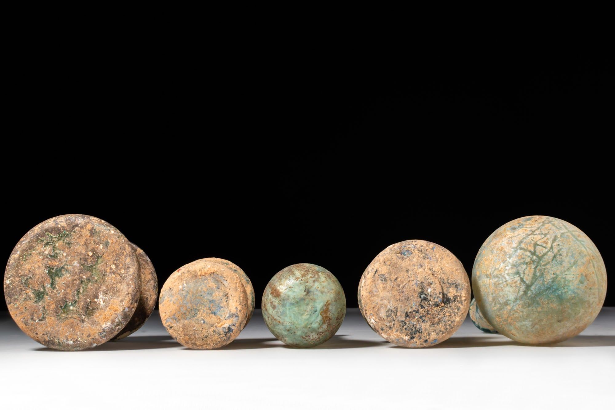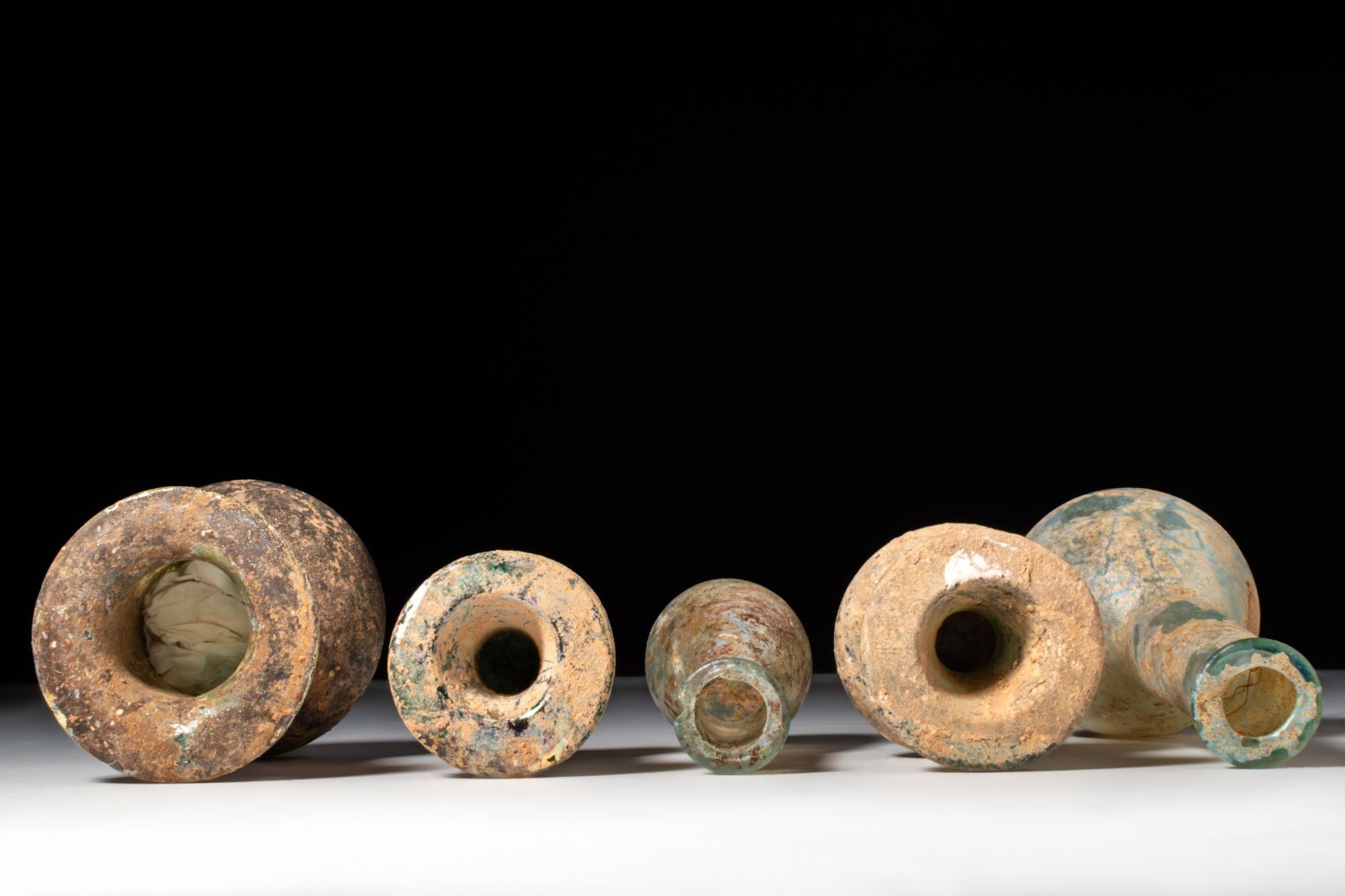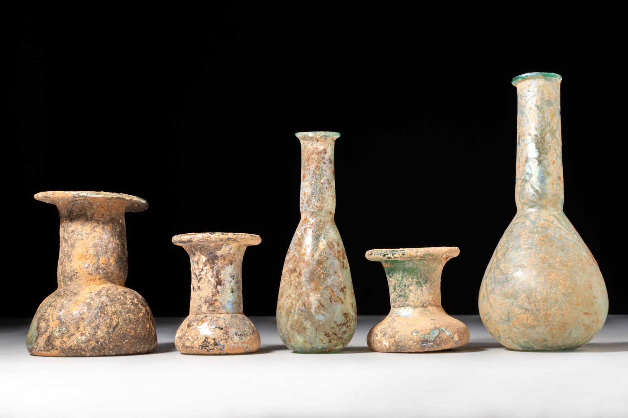 A collection of five glass unguentaria, including, from left to right: a squat cosmetic jar of spool profile with a broad flat everted rim above a tubular neck set on a domed lower body; a smaller jar of the same type with a wide mouth over a waisted neck; a drop-shaped bottle with a tapering ovoid body, a cylindrical neck, and an out-turned rim; a low jar with an expansive flat rim, a concave neck, and a low rounded base; and a large bottle with a generous pear-shaped body rising to a tall cylindrical neck finished with a rounded lip.