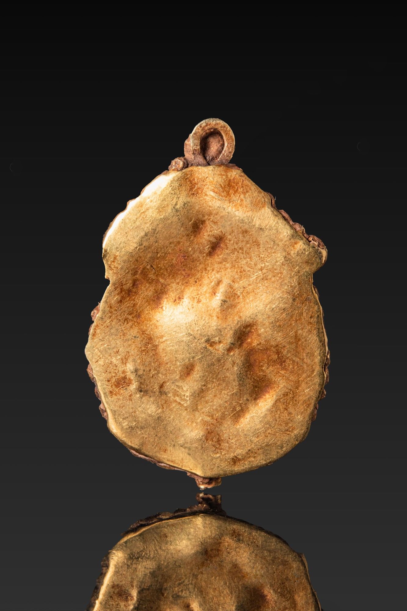 A gold-mounted agate cameo of Antinous. The oval gem is carved in low relief with a right-facing youthful head bound by a taenia and framed by tightly braided locks. A teardrop-shaped gold mount forms the body, the cameo secured within an oval collet with a round suspension ring above. The front is decorated with applied domed bosses and a beaded border, with a small drop terminal below.
