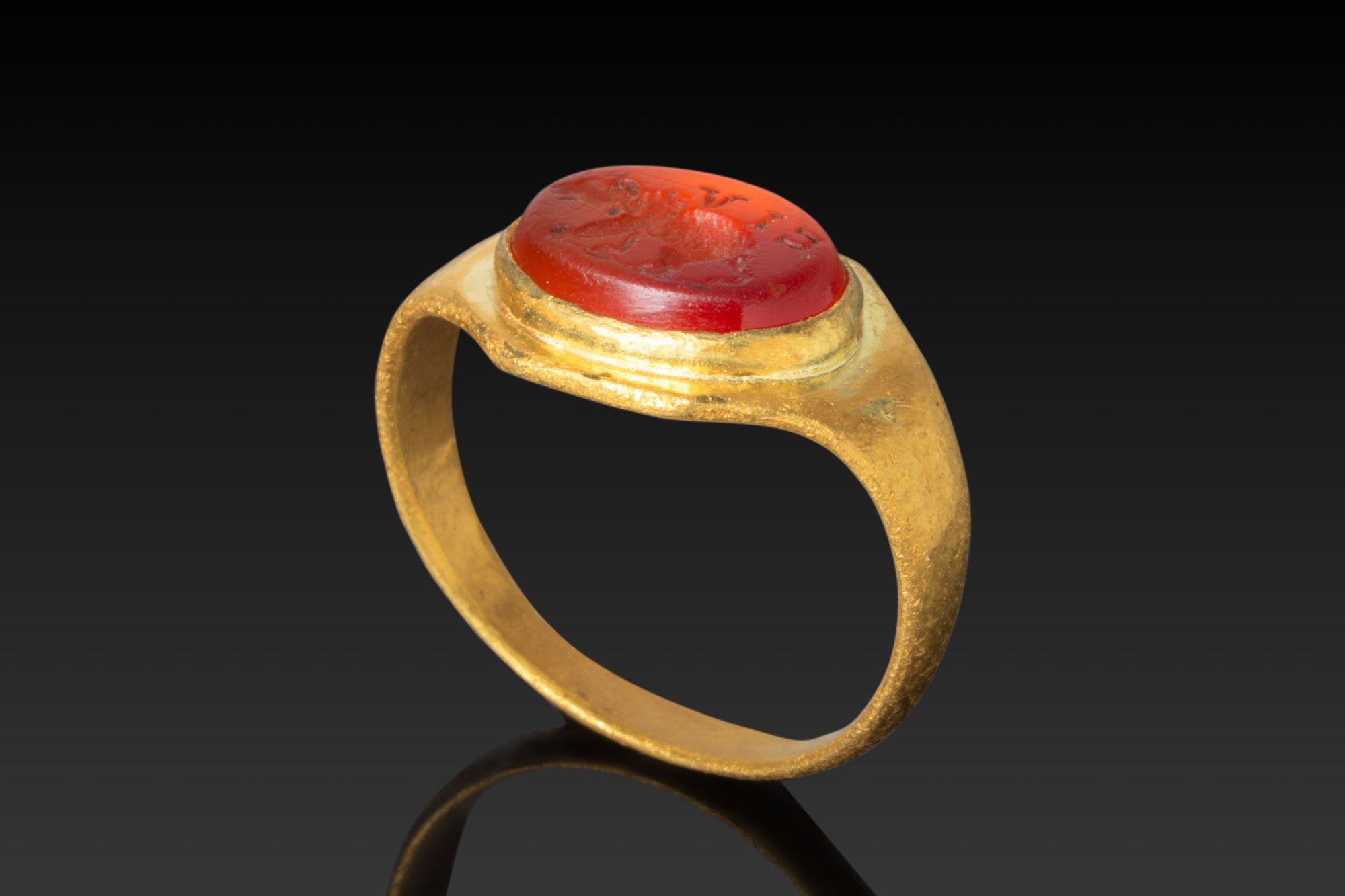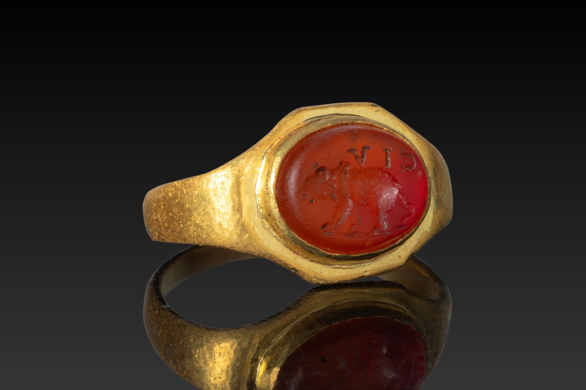 ROMAN GOLD RING WITH CARNELIAN INTAGLIO DEPICTING BEAR AND INSCRIPTION ‘VIC’.