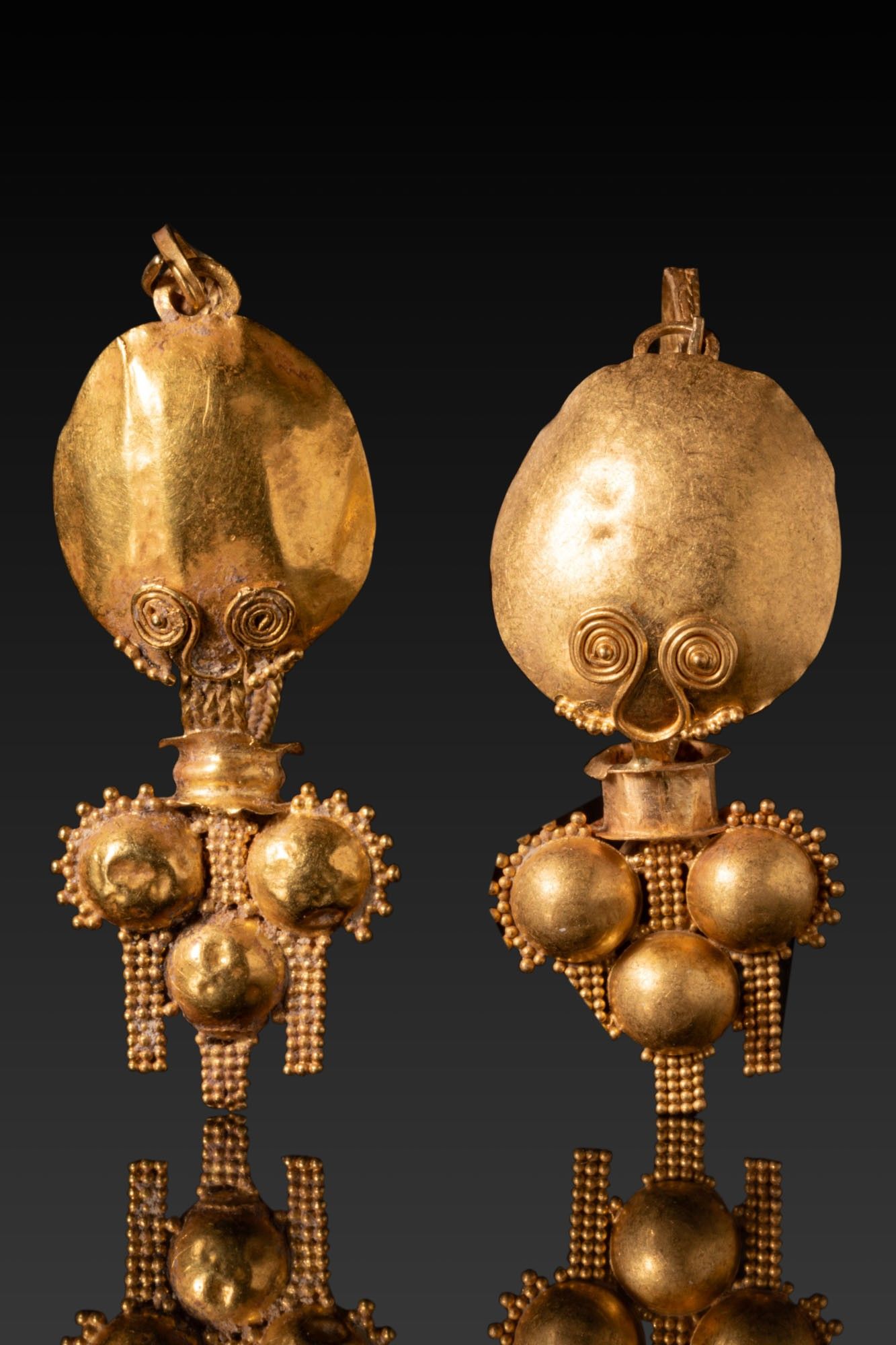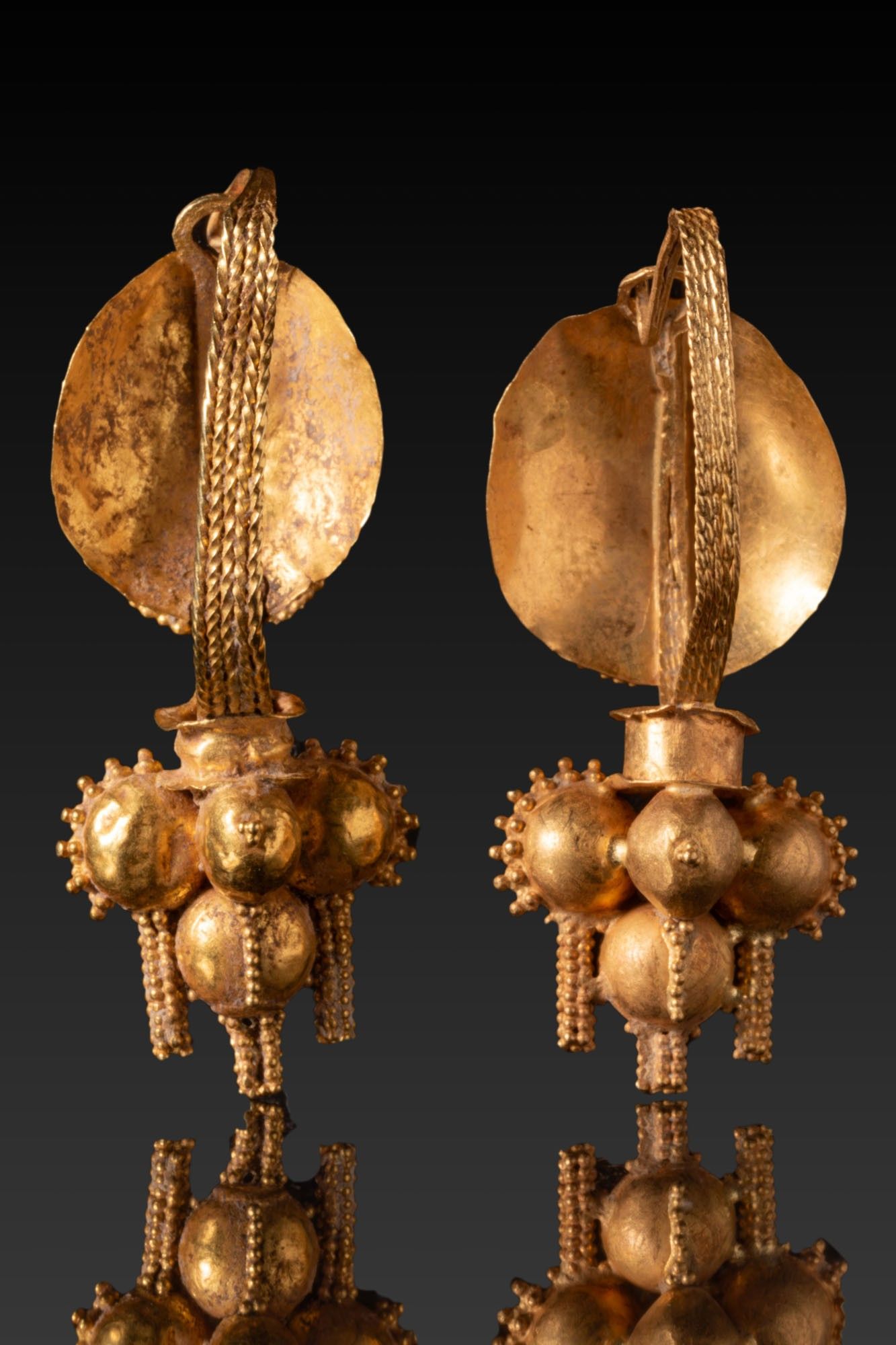 A matched pair of gold earrings with domed ovoid upper plaques and a cluster pendant of hollow bosses. Each earring is formed from a thin sheet backed by a narrow plaited strip. A pair of tight filigree volutes sits at the lower edge above a short tubular collar. The pendant is arranged as four hollow hemispherical bosses, each within a beaded circlet and flanked by short panels of fine granules.