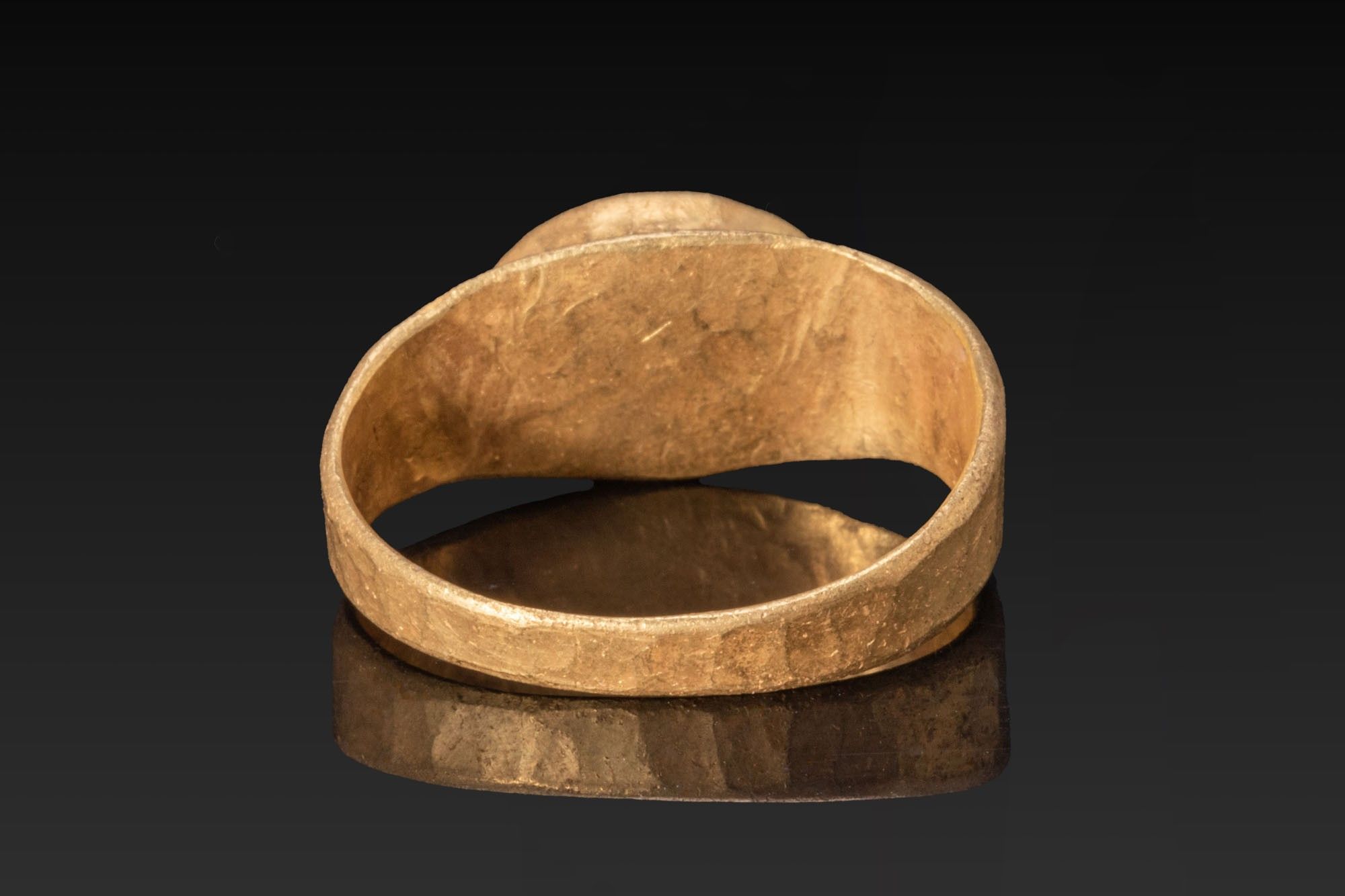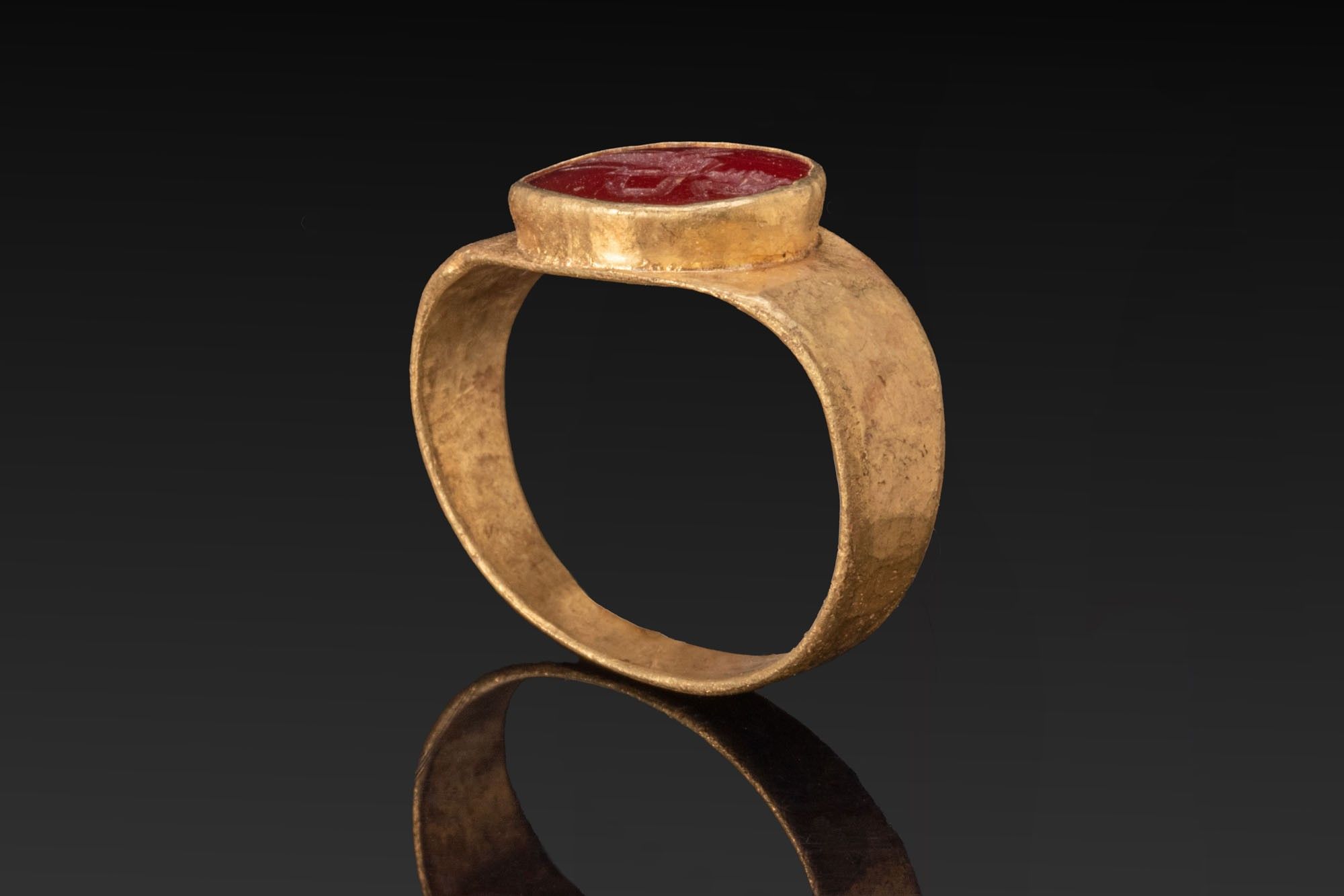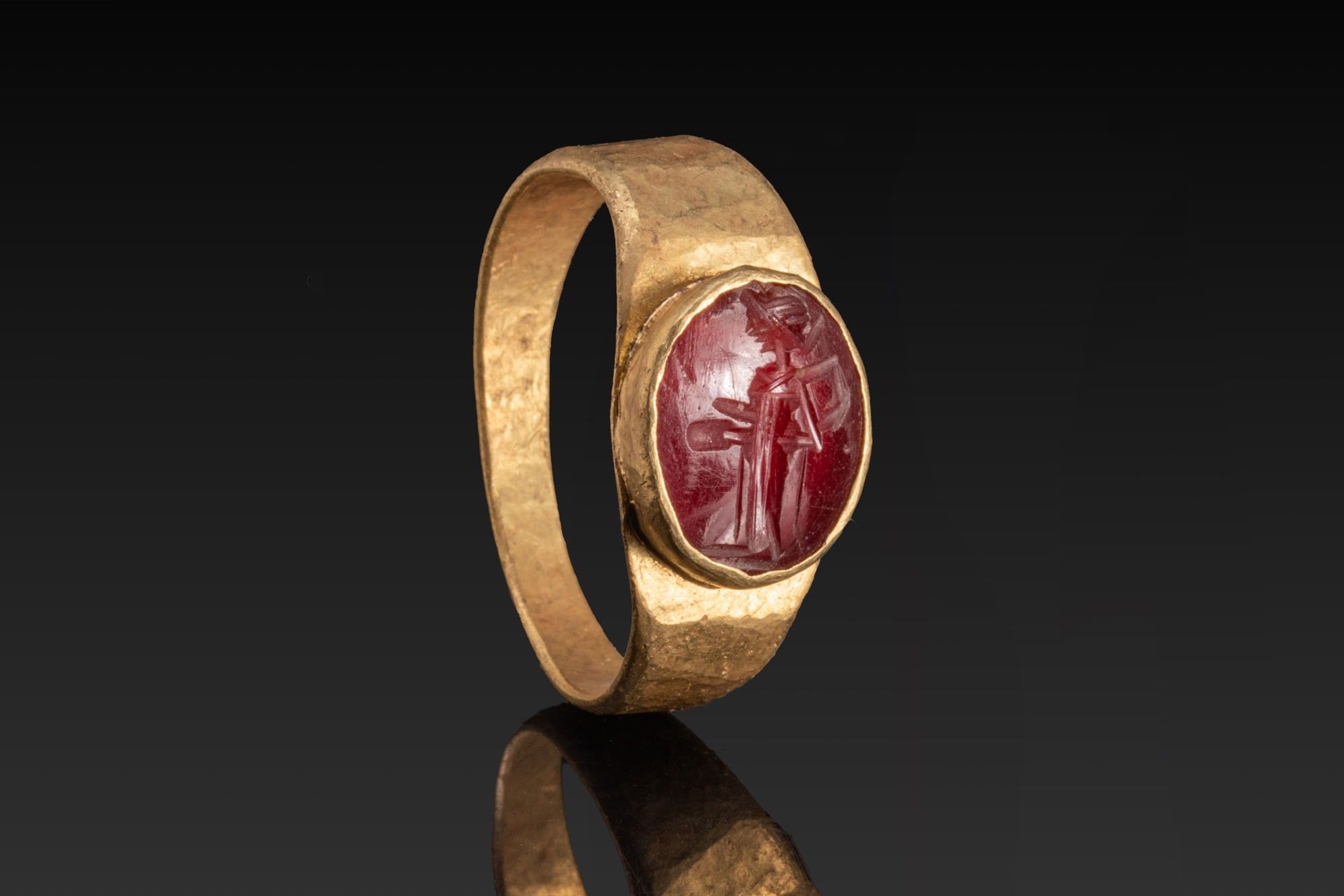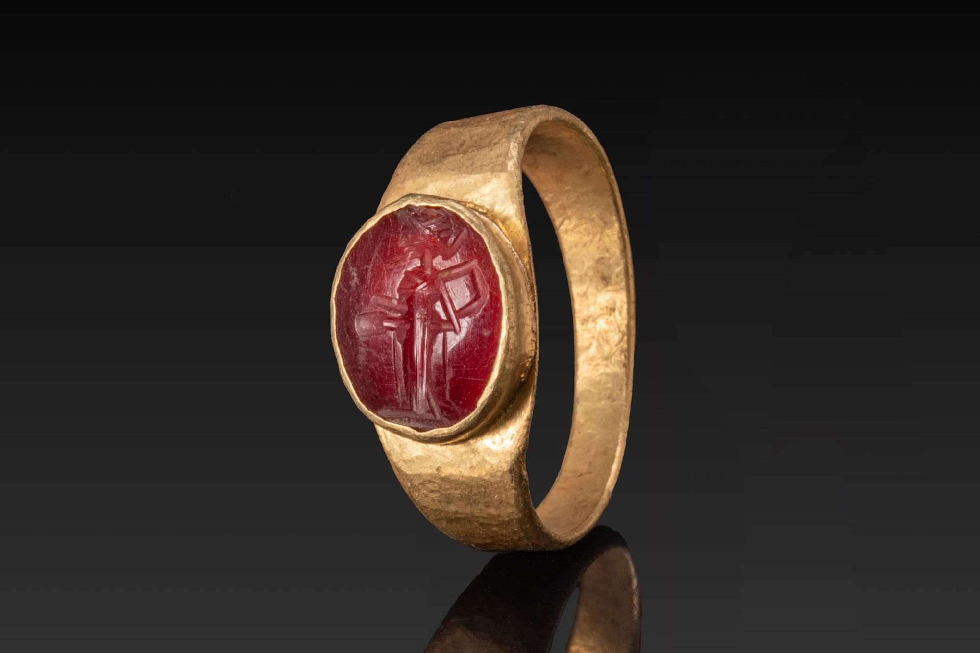 A red carnelian intaglio engraved with a draped standing goddess facing left. The gem sits in an oval gold collet from which broad tapering shoulders run to a flat-band hoop of sub-rectangular section that narrows towards the back. The ring of a possibly later period.